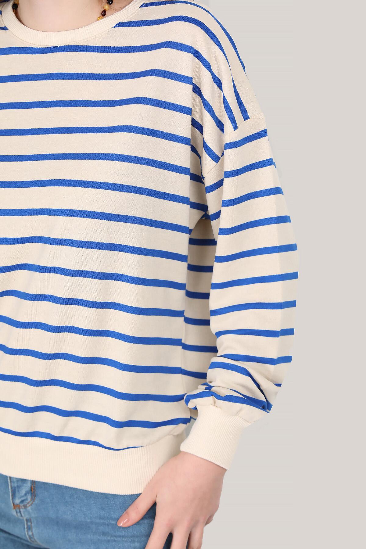 Kadın Bisiklet Yaka Yatay Çizgili Kolları Lastikli Sweat Saks