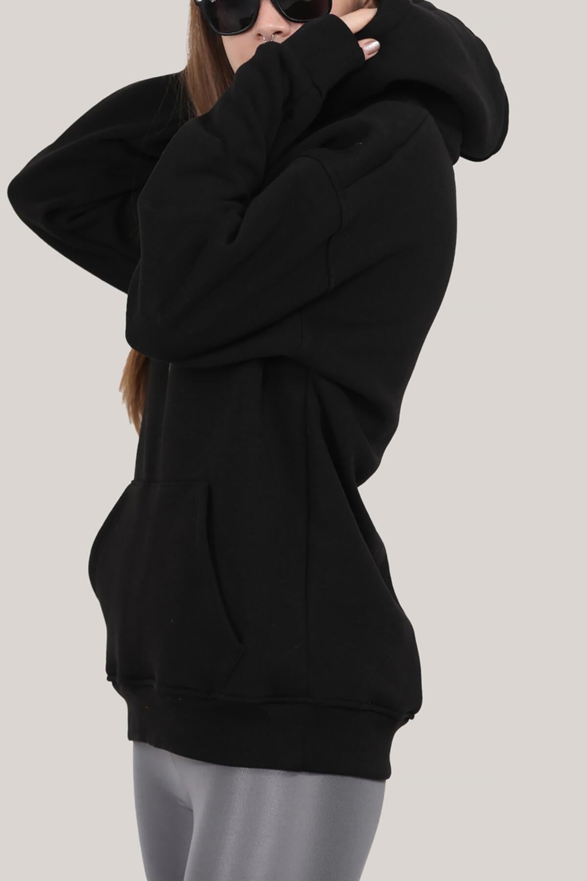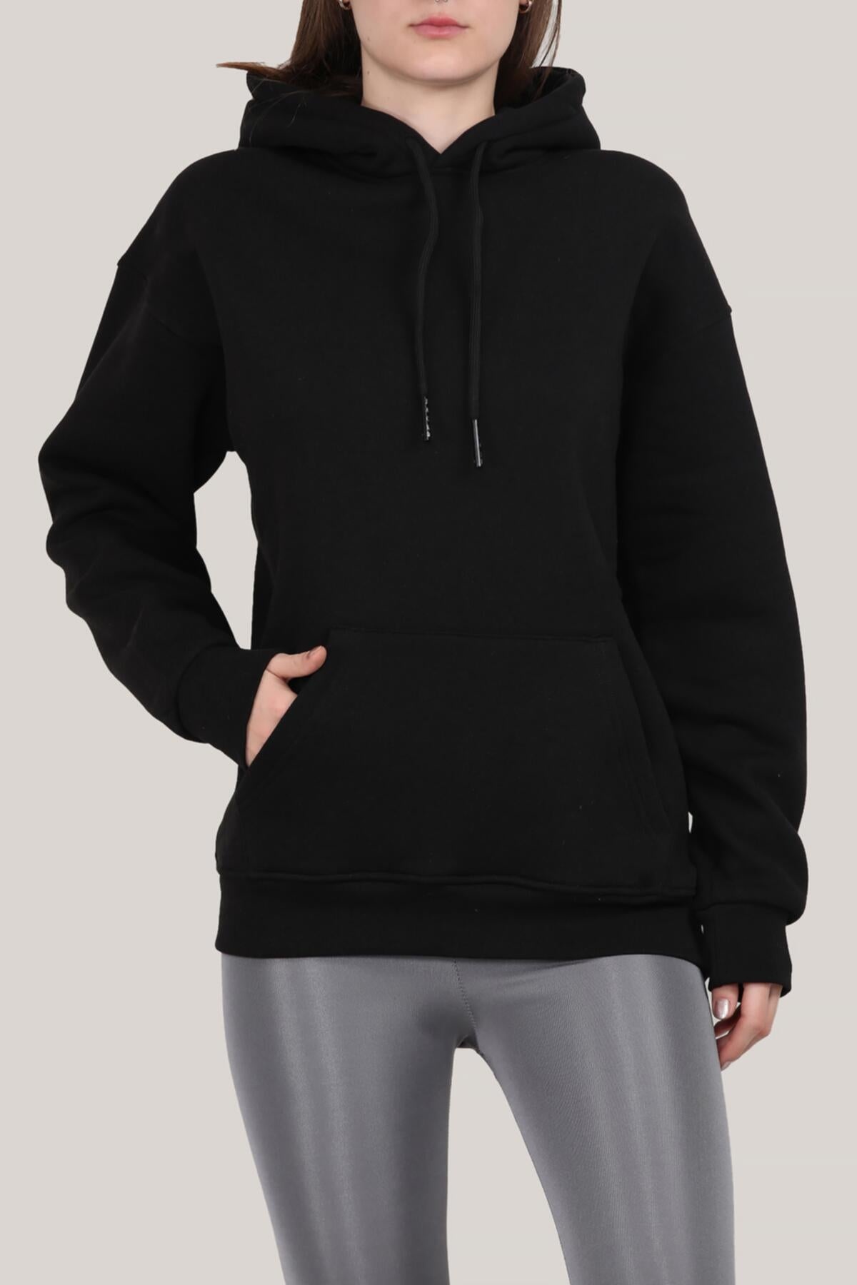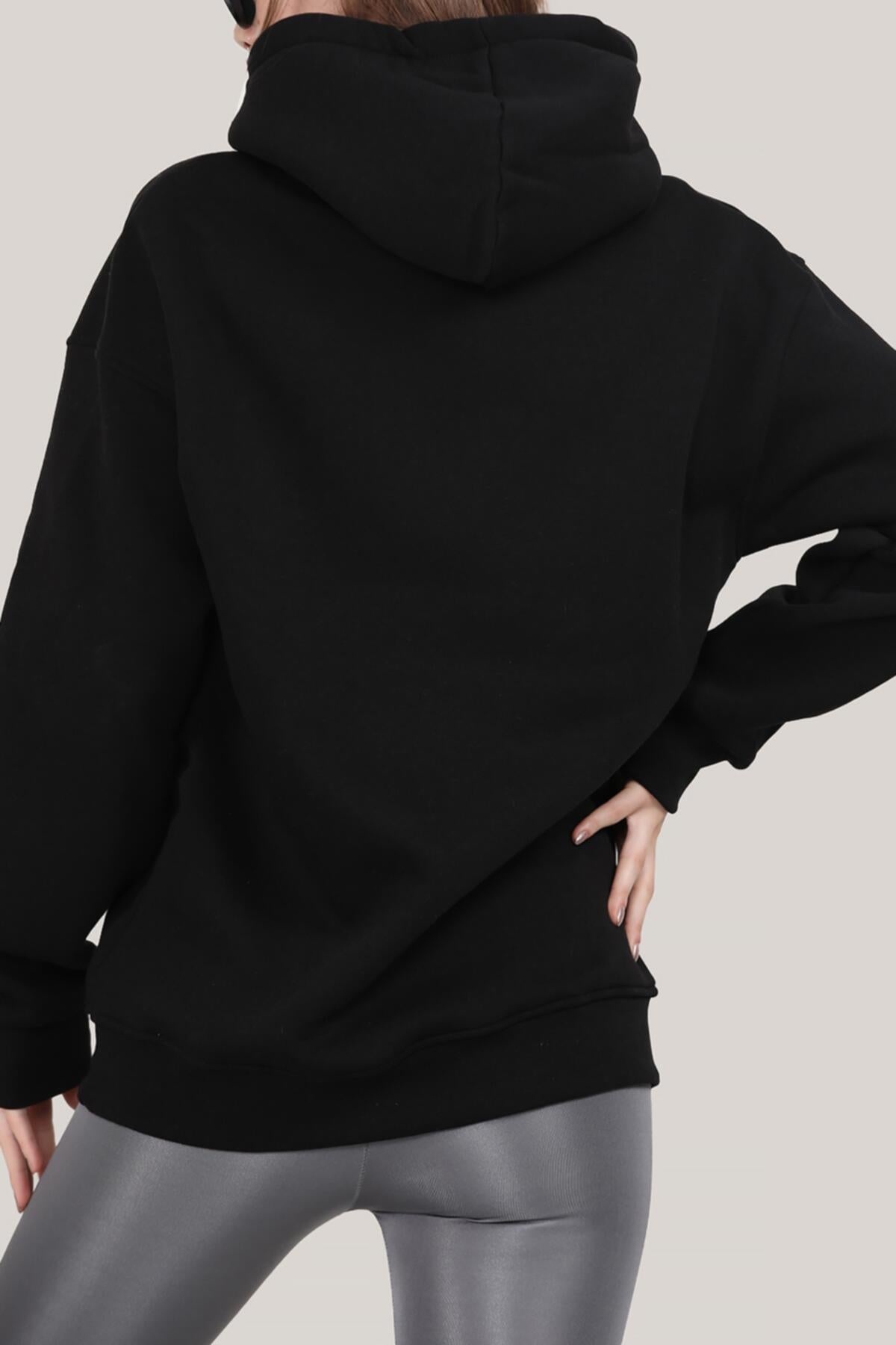 Kadın Kapşonlu 3 İplik Şardonlu Sweat Siyah