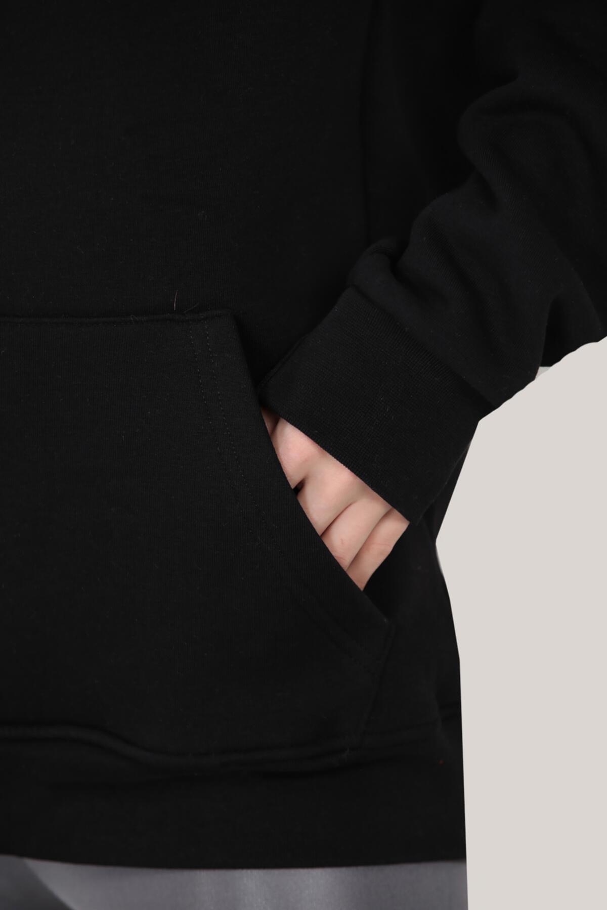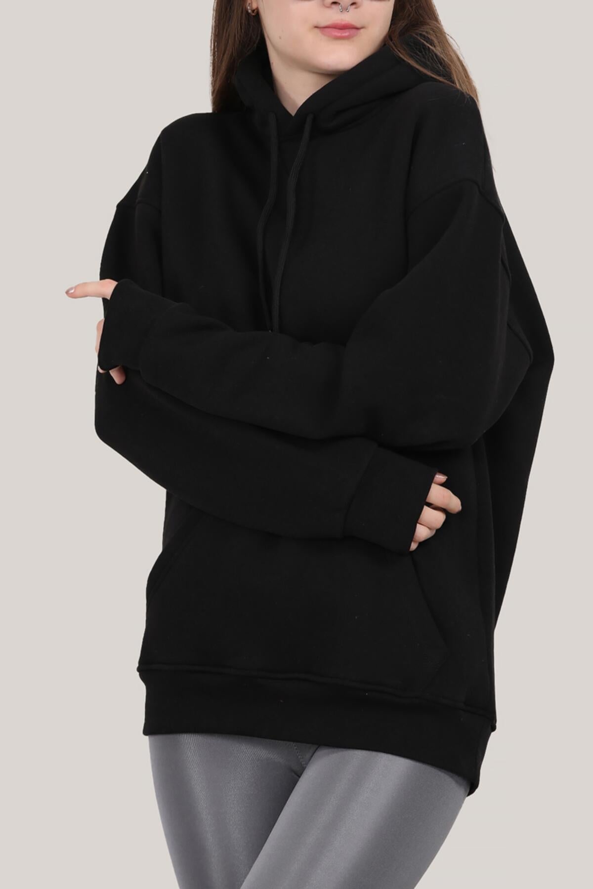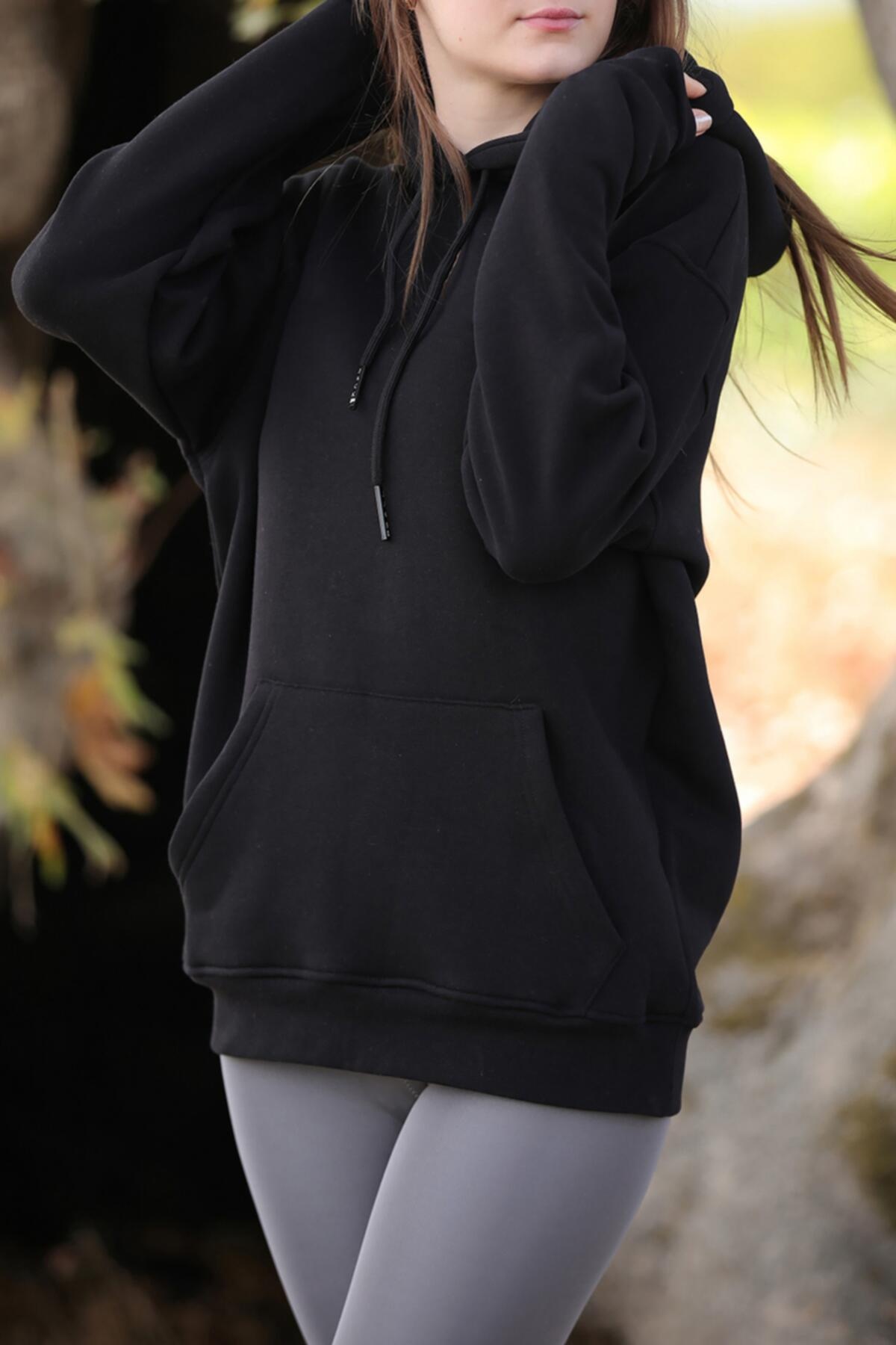 Kadın Kapşonlu 3 İplik Şardonlu Sweat Siyah