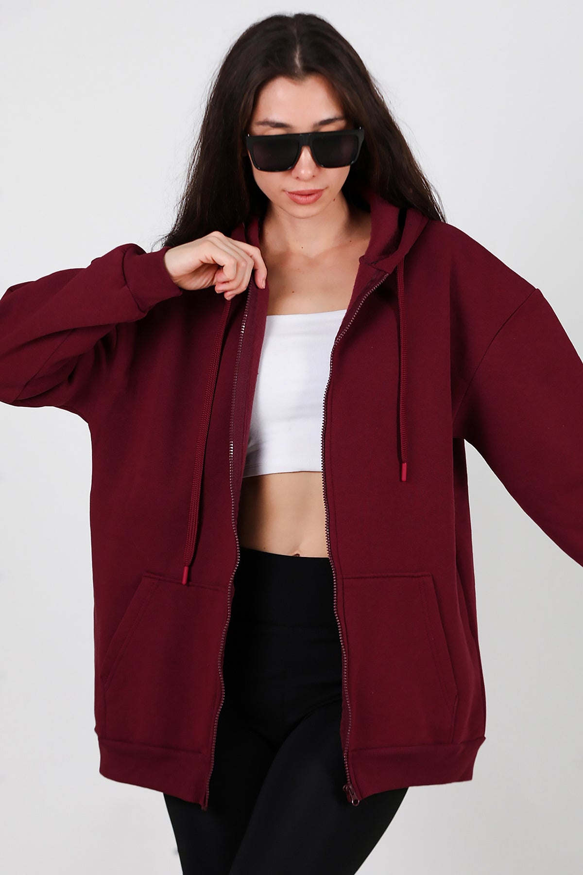 Kadın Kapşonlu Fermuarlı Oversize Üç İplik Sweat Bordo