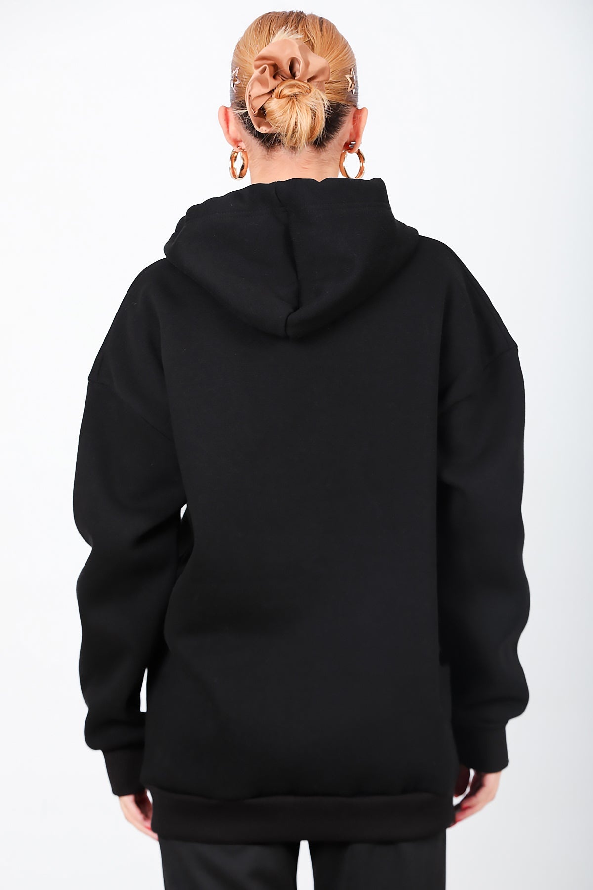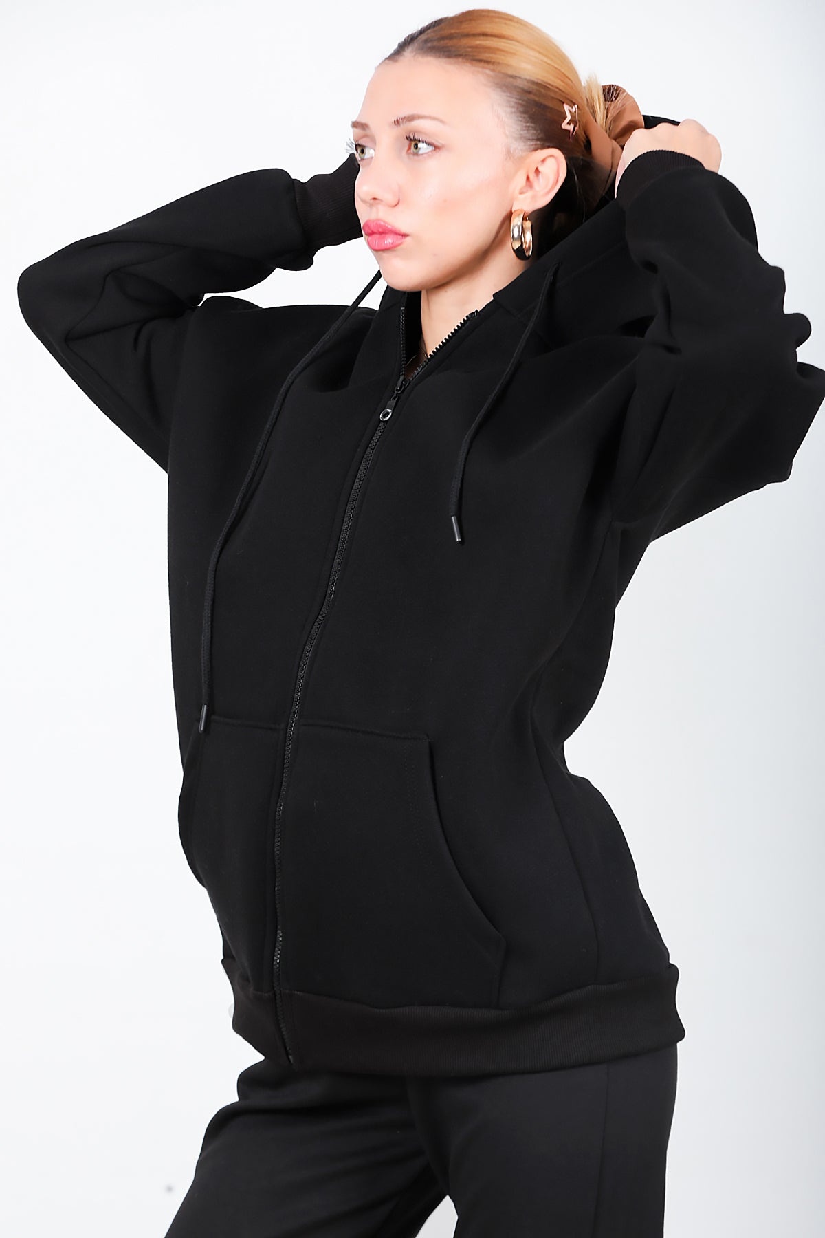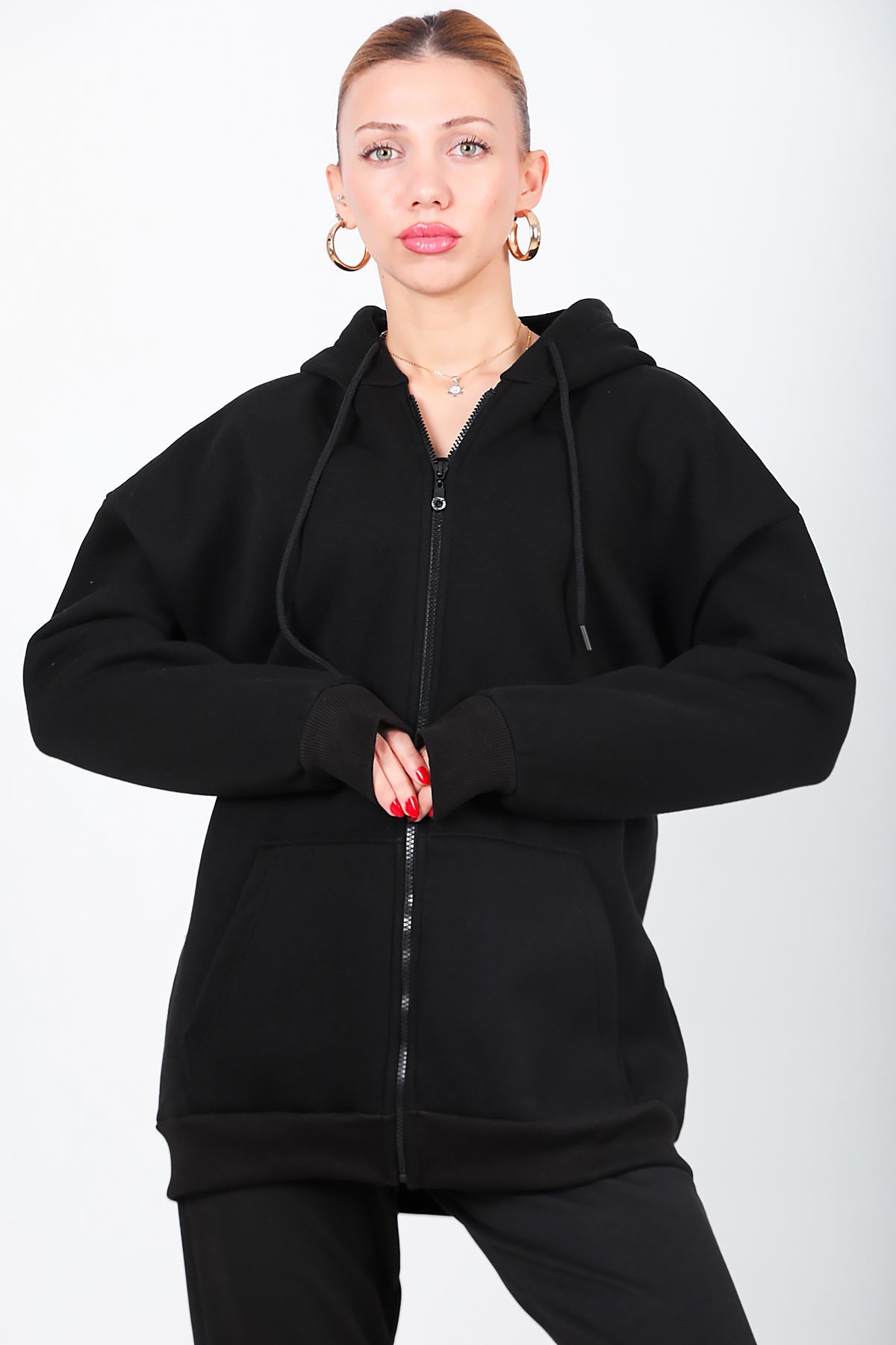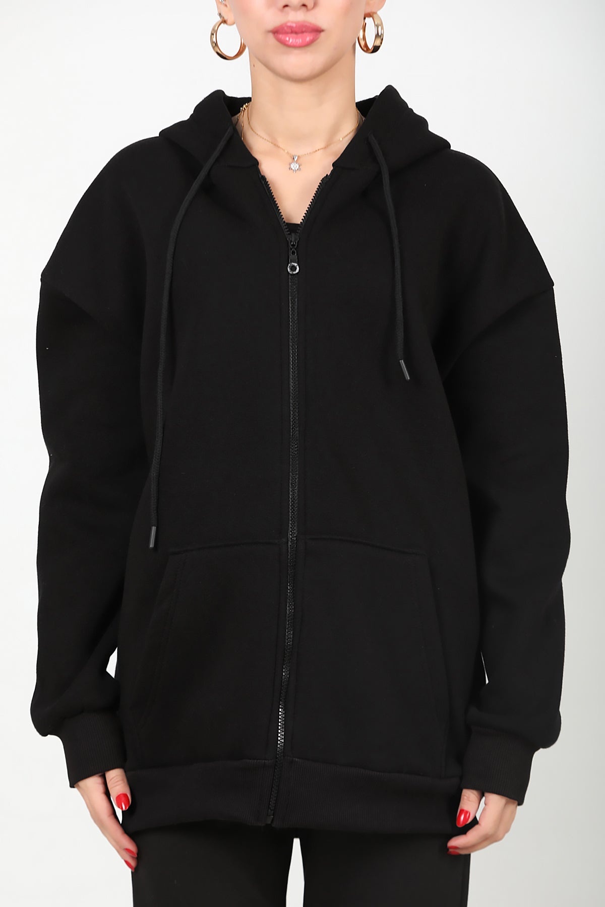 Kadın Kapşonlu Fermuarlı Oversize Üç İplik Sweat Siyah Siyah