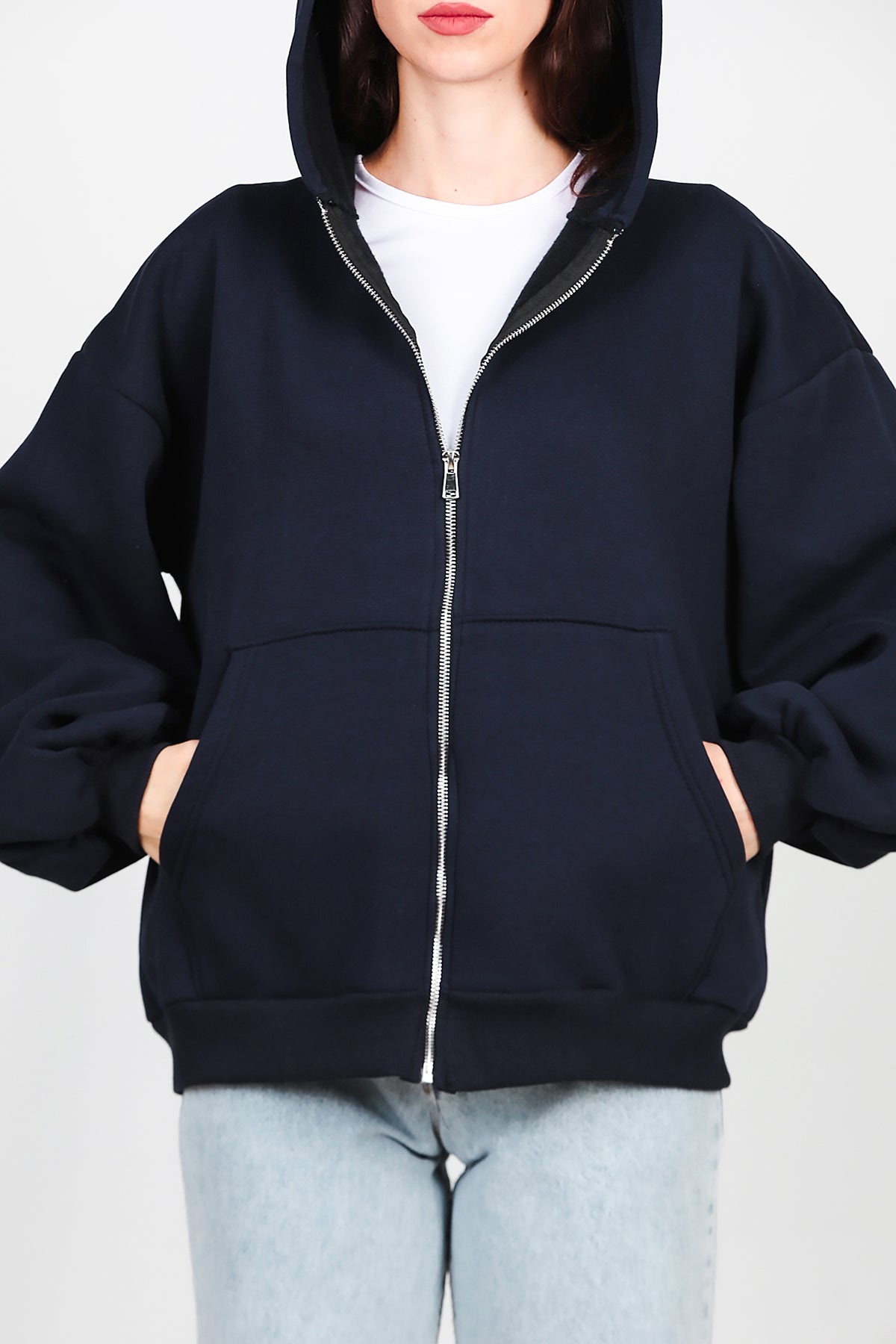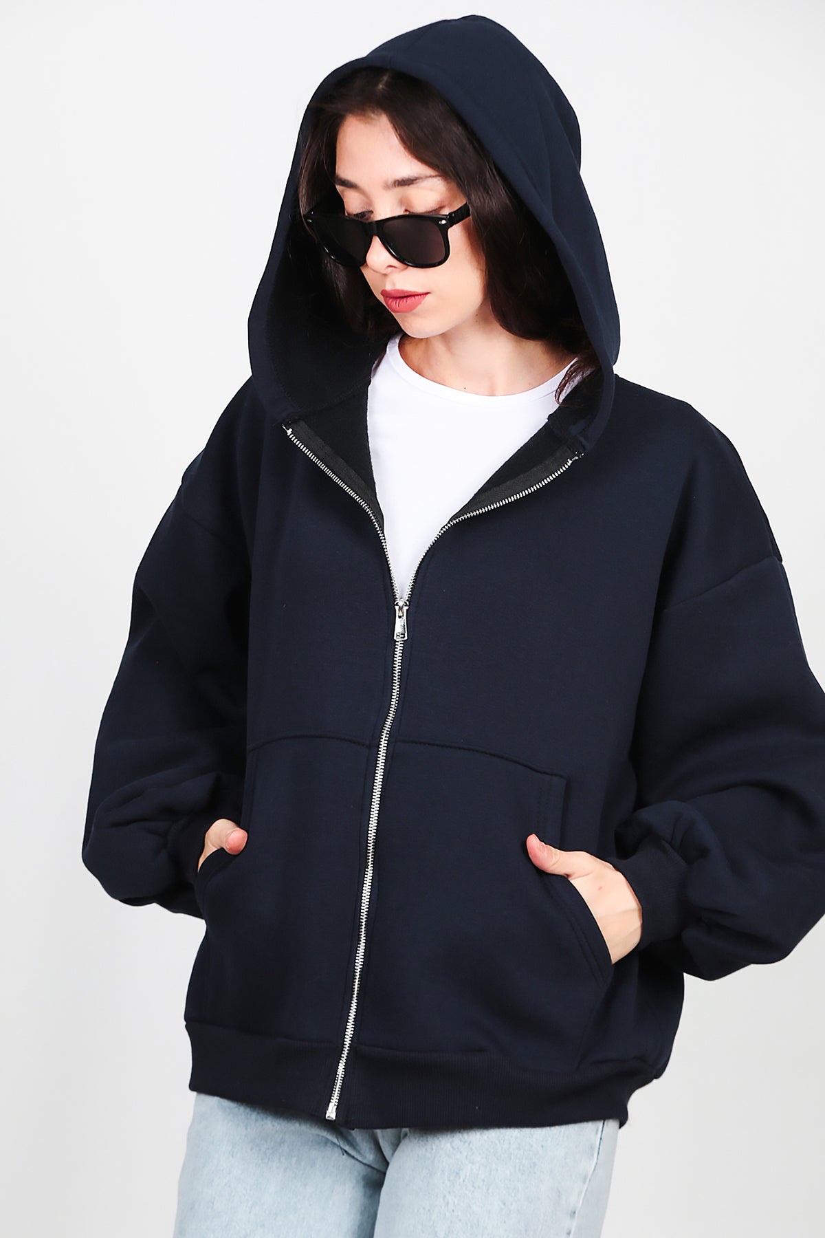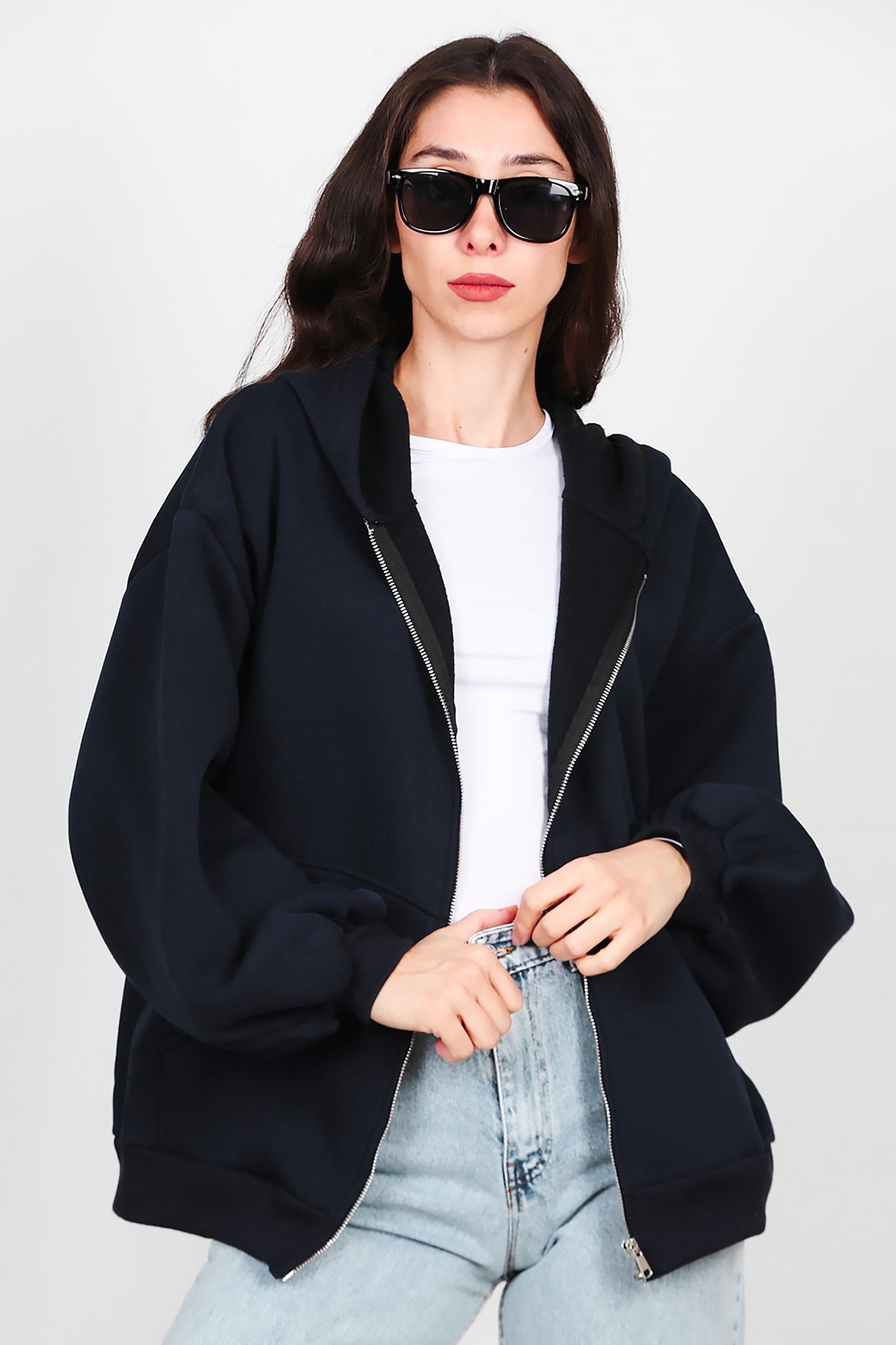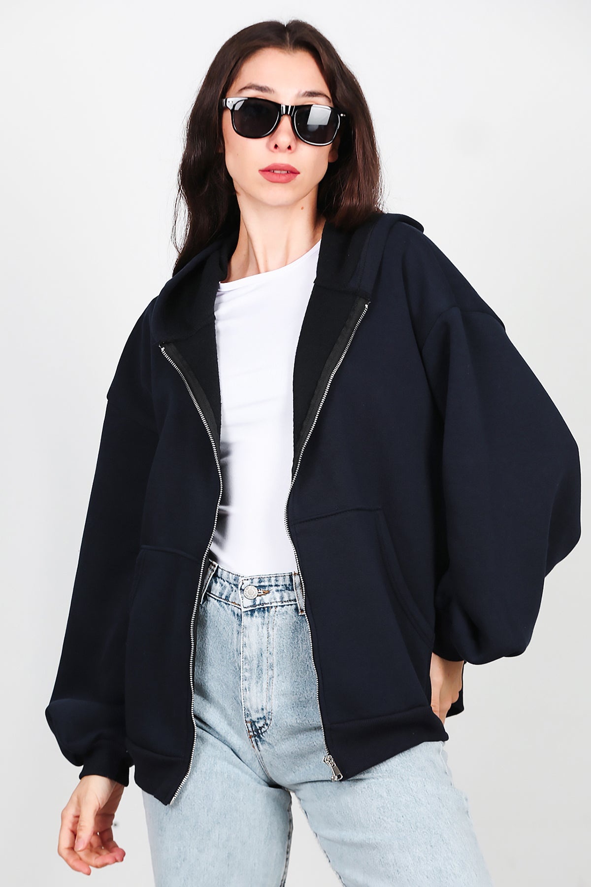 Kadın Kapşonlu Fermuarlı Şardonlu Sweat Lacivert