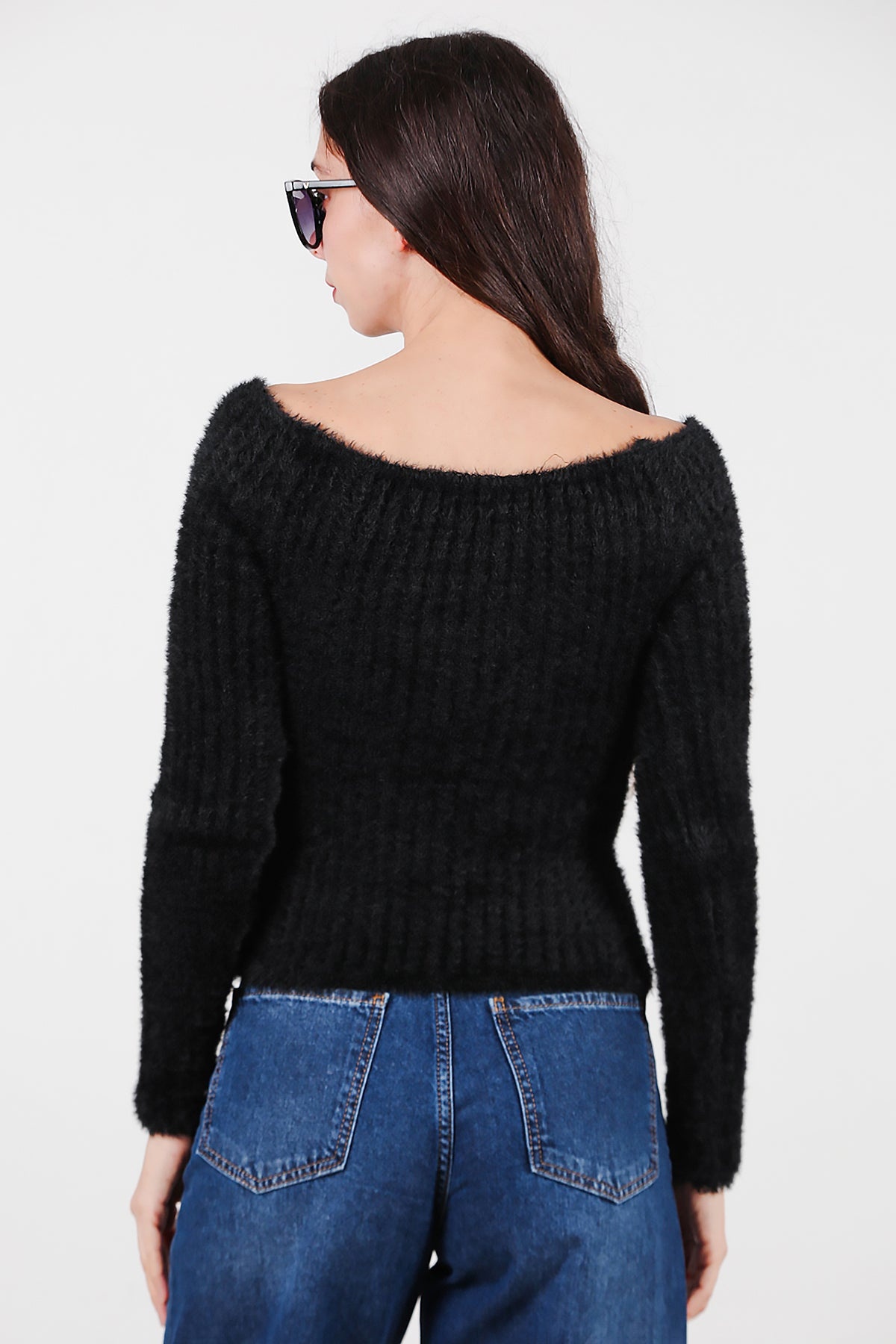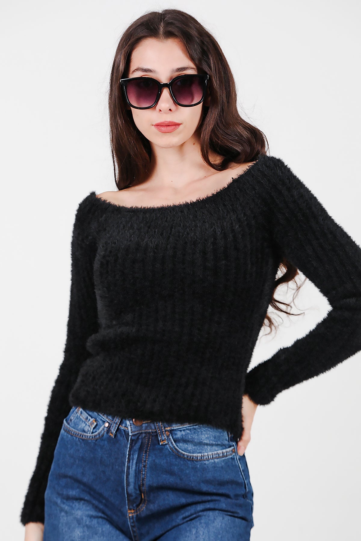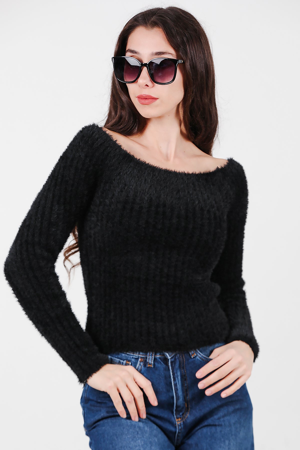 Kadın Kayık Yaka Sakallı Triko Kazak Siyah