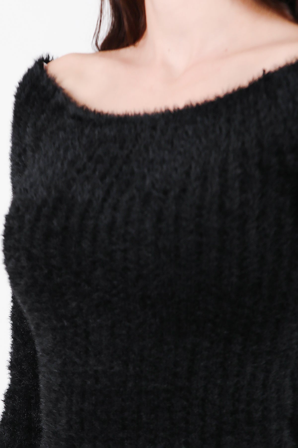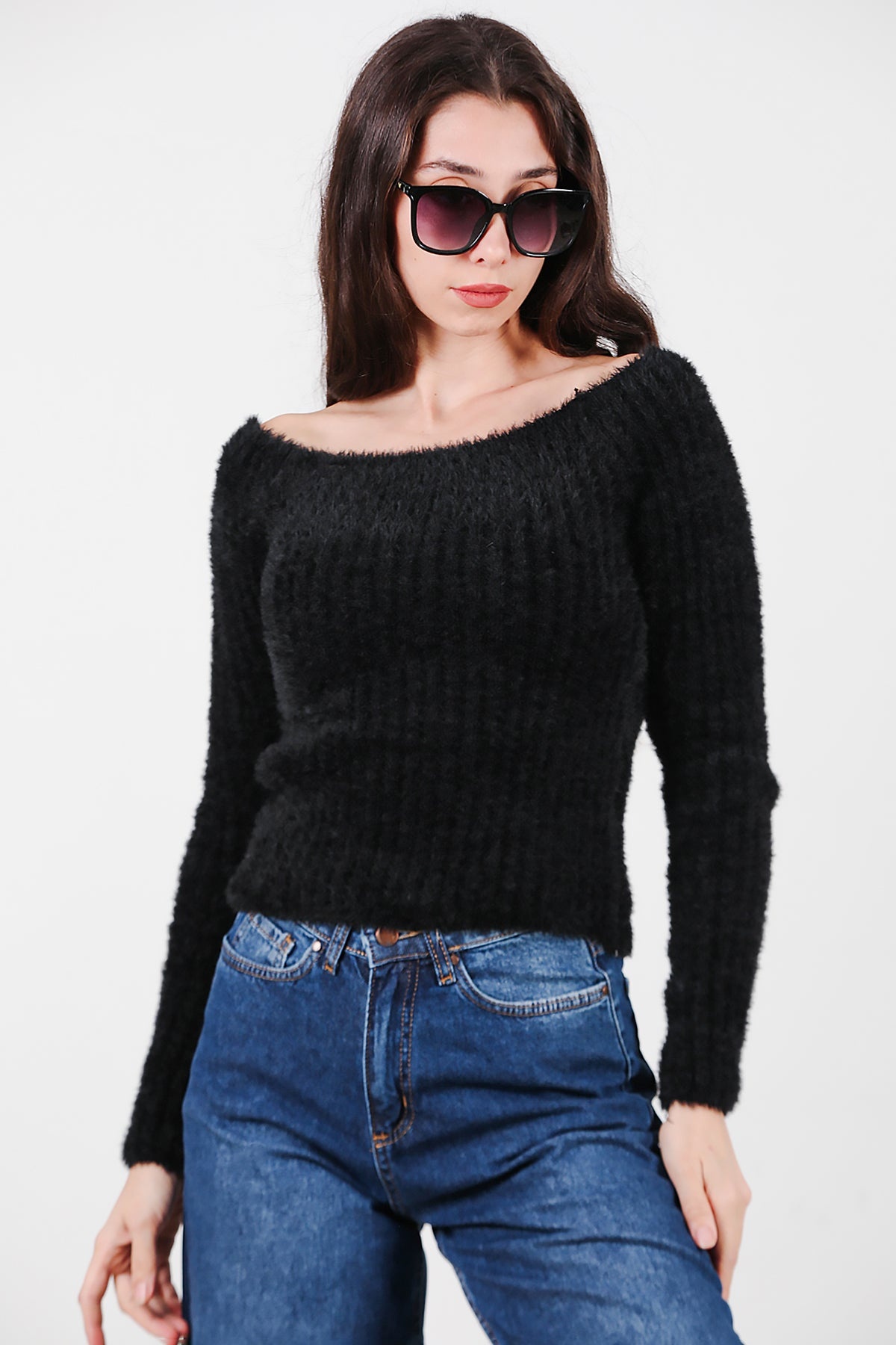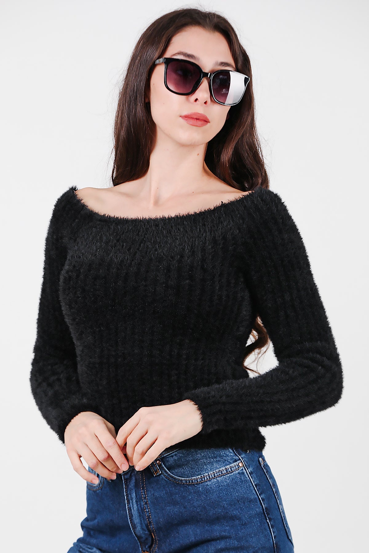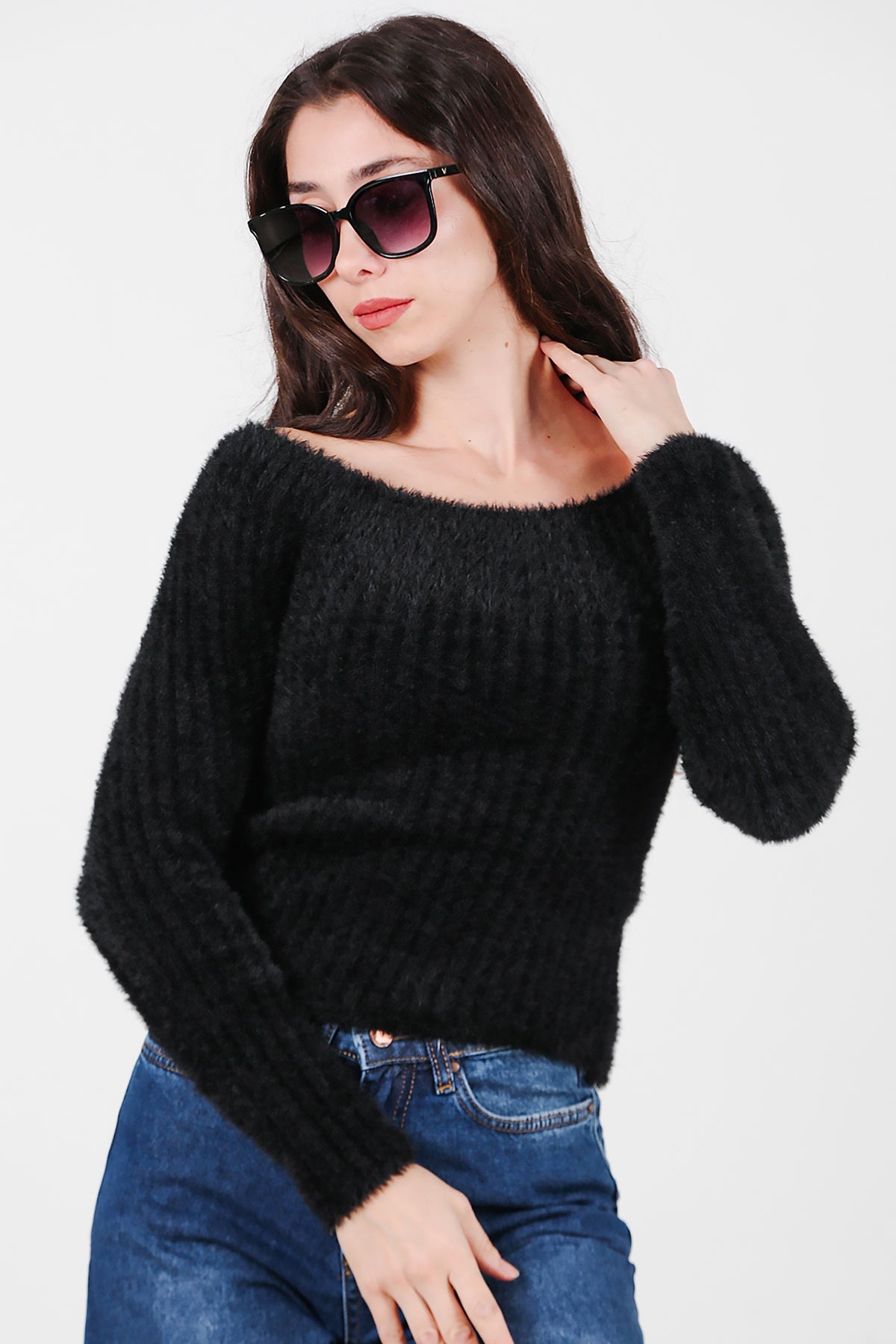 Kadın Kayık Yaka Sakallı Triko Kazak Siyah