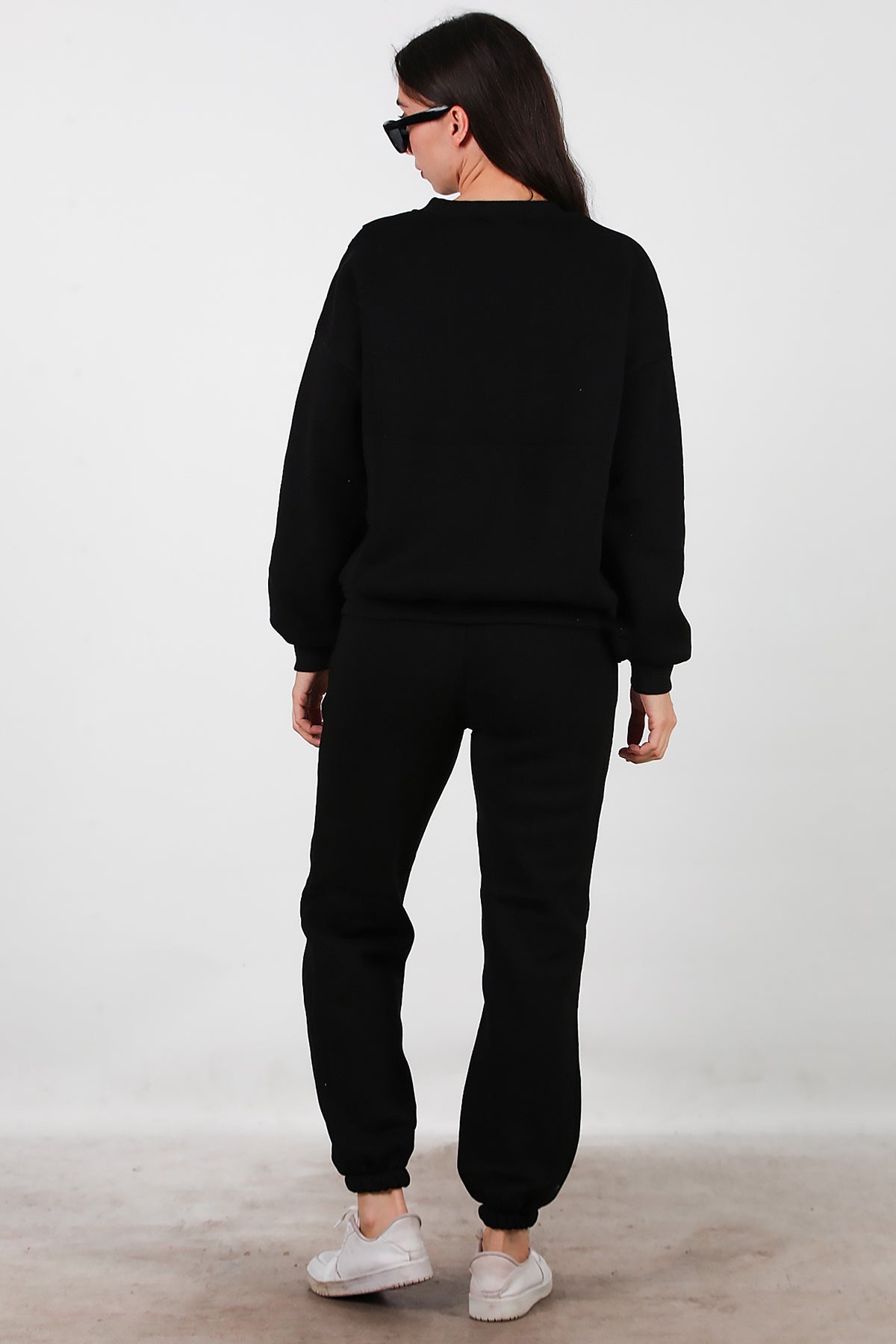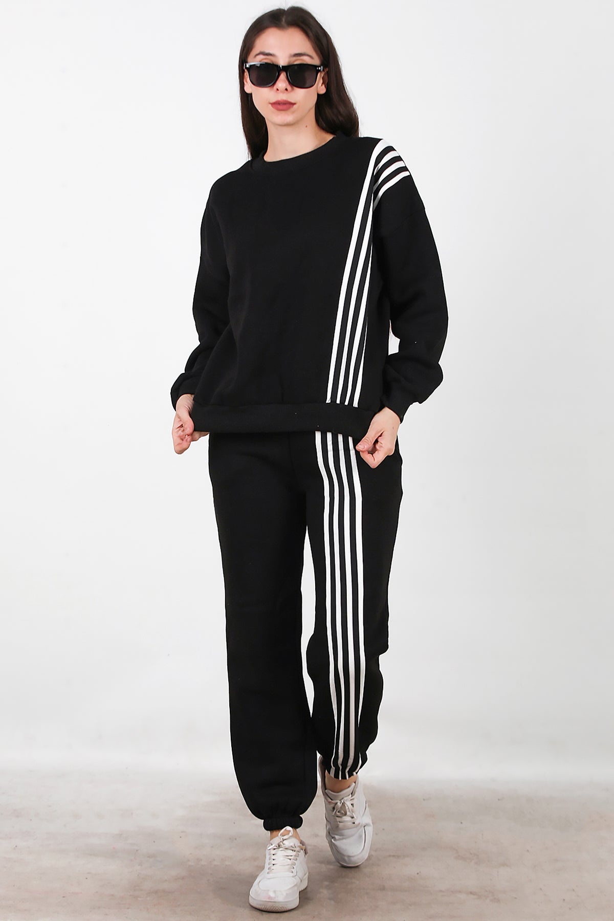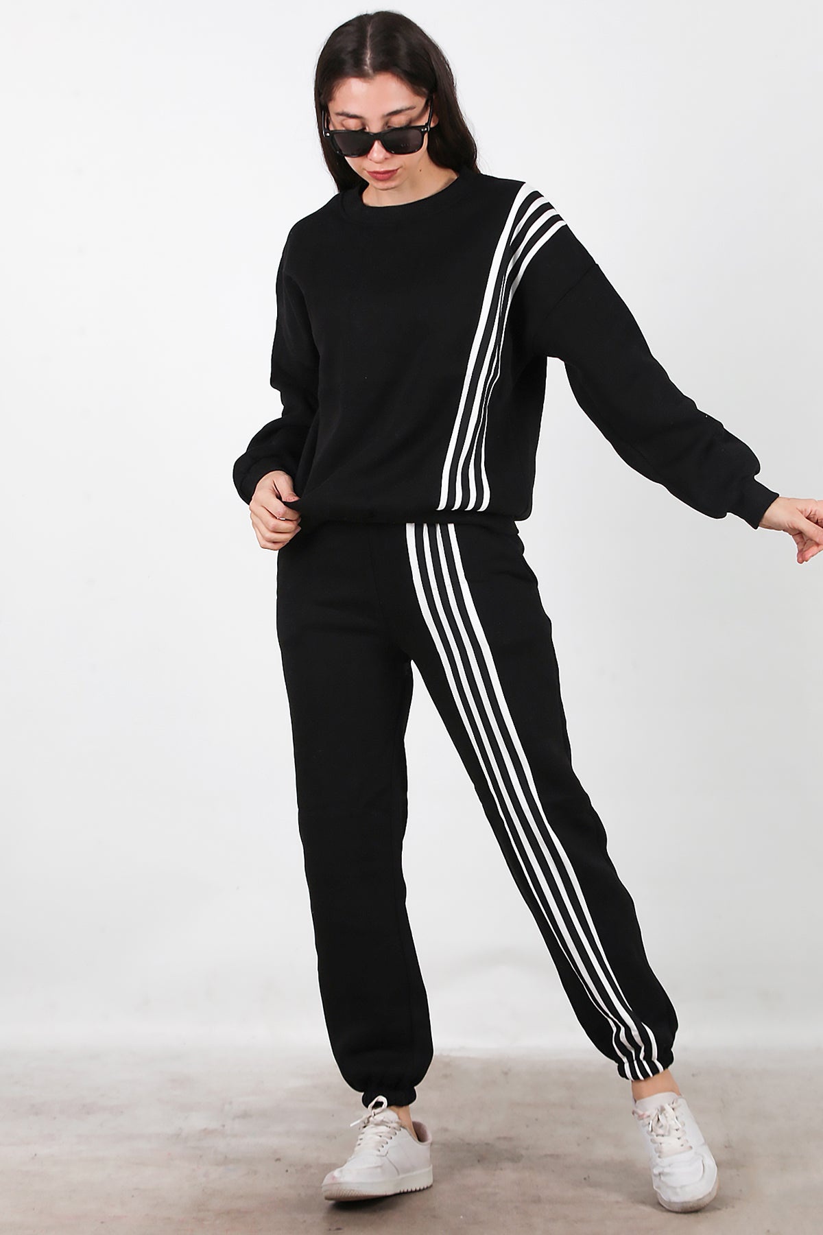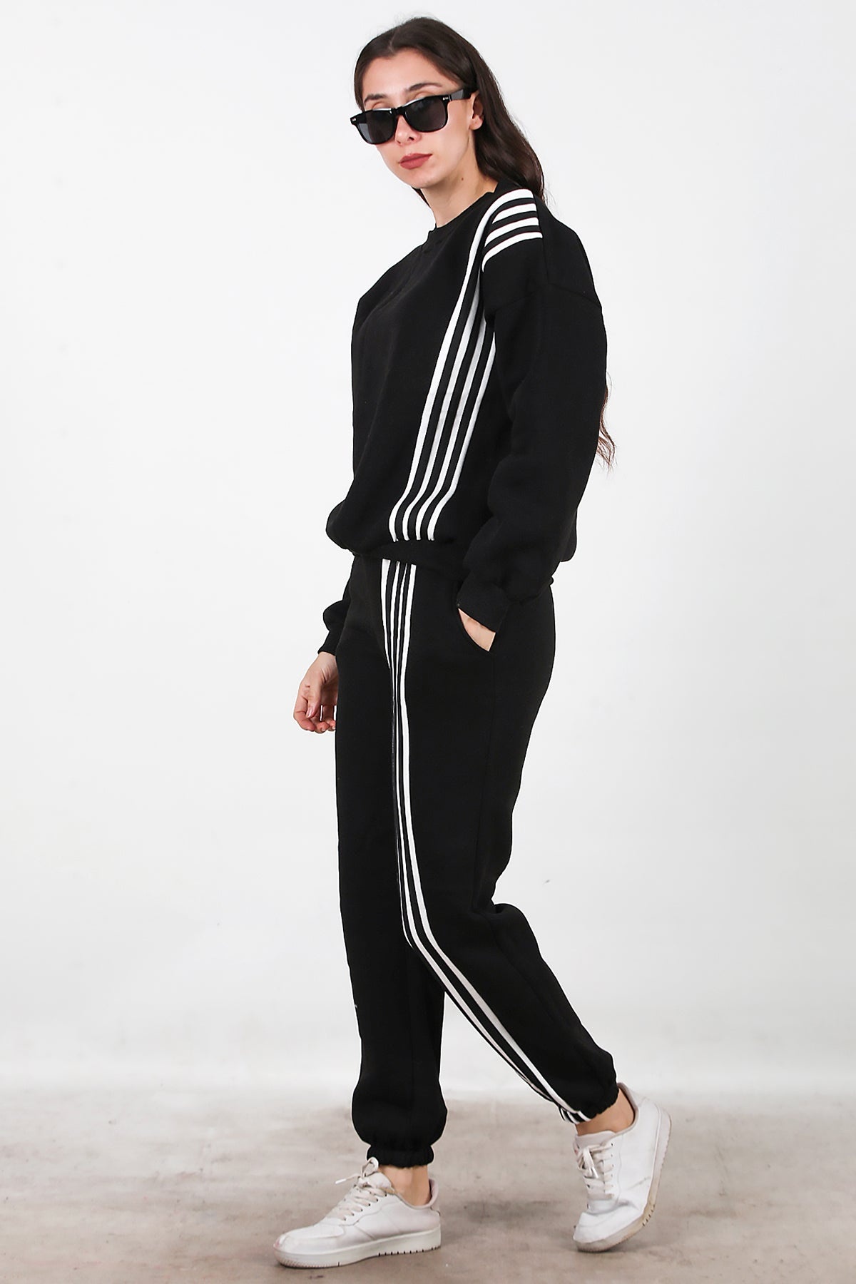 Kadın Şeritli Bisiklet Yaka Eşofman Takımı Siyah