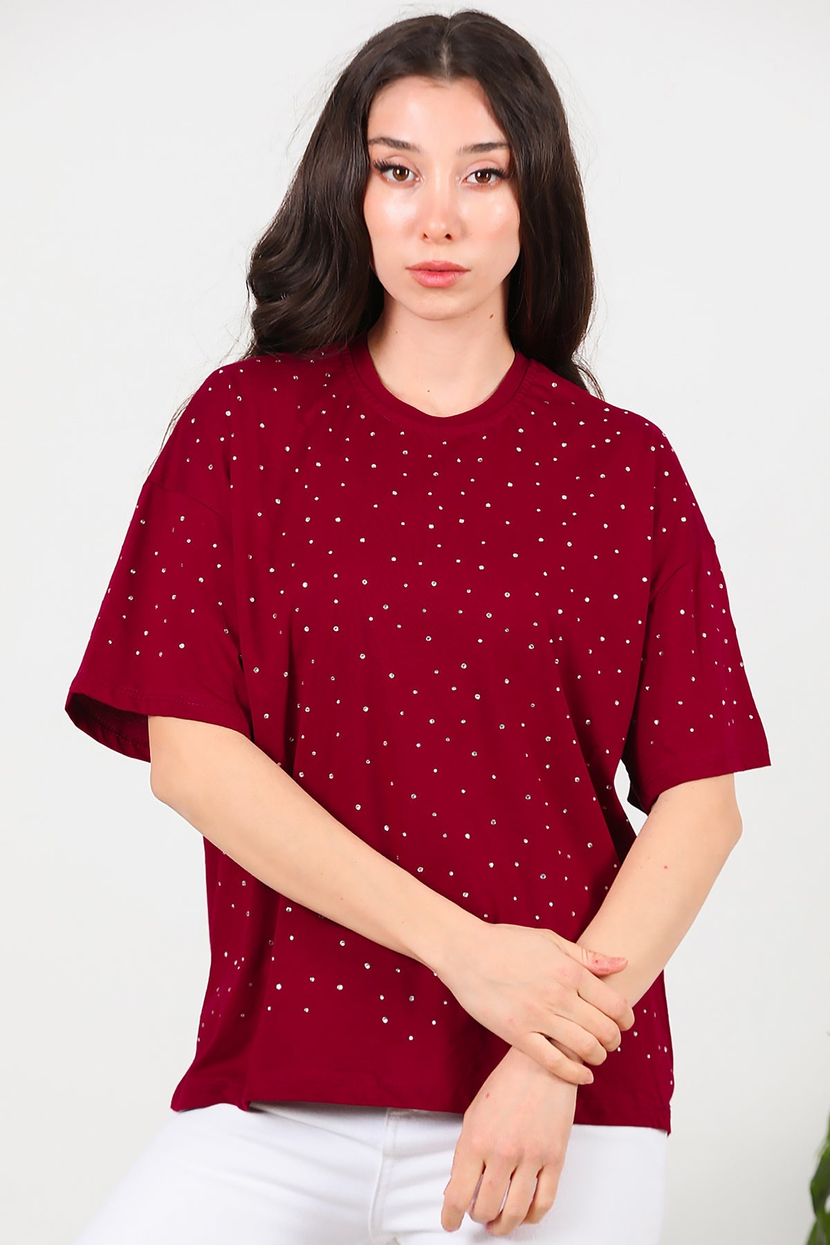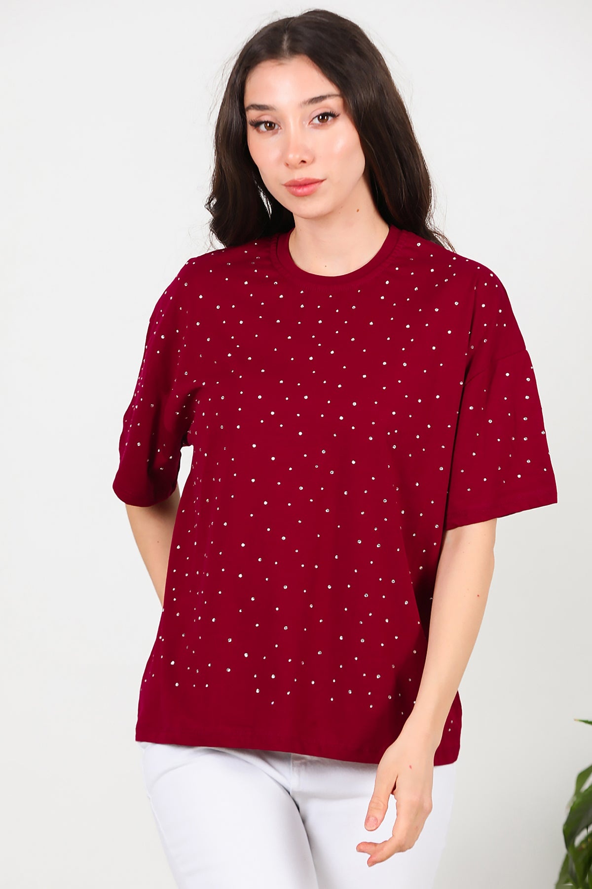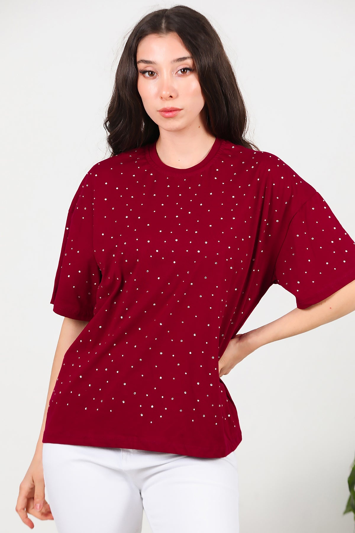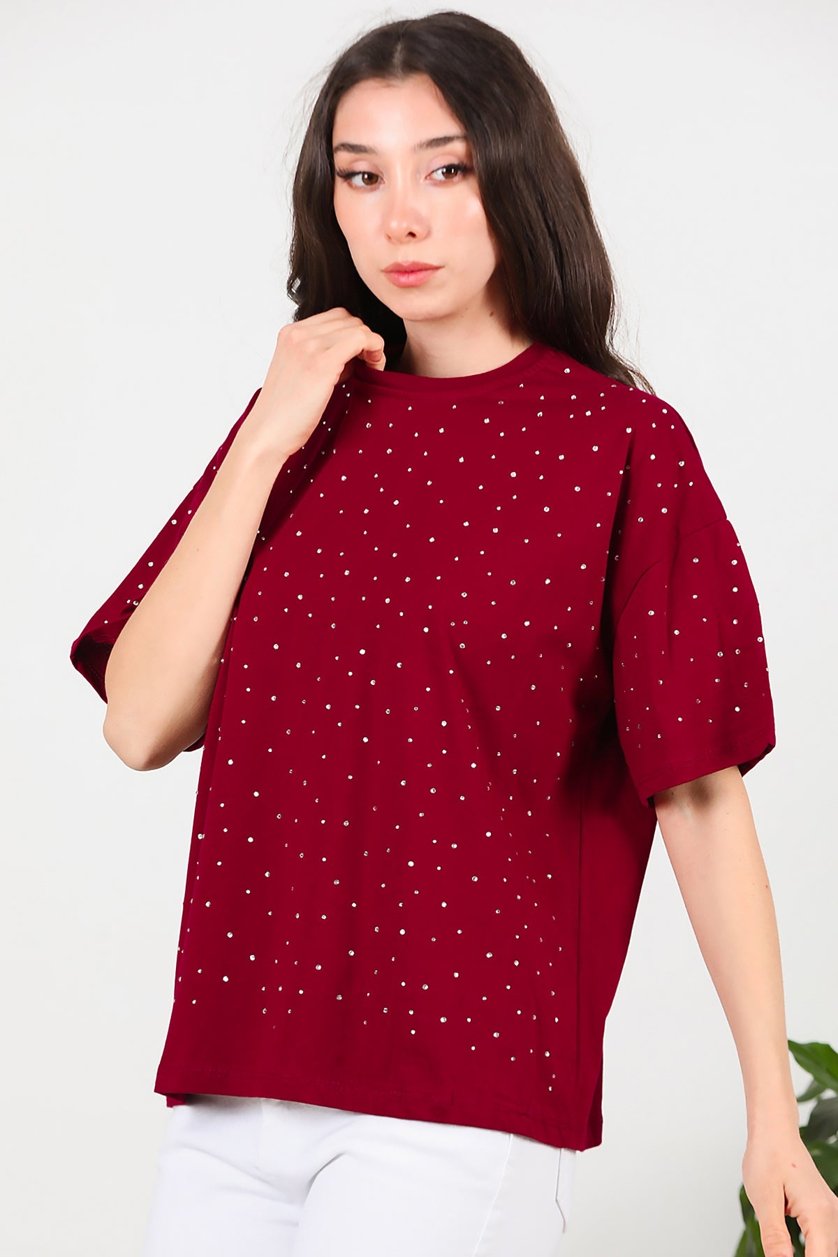 Kadın Taşlı Bisiklet Yaka T-shırt Bordo