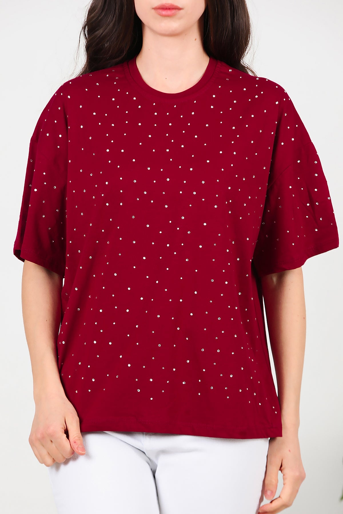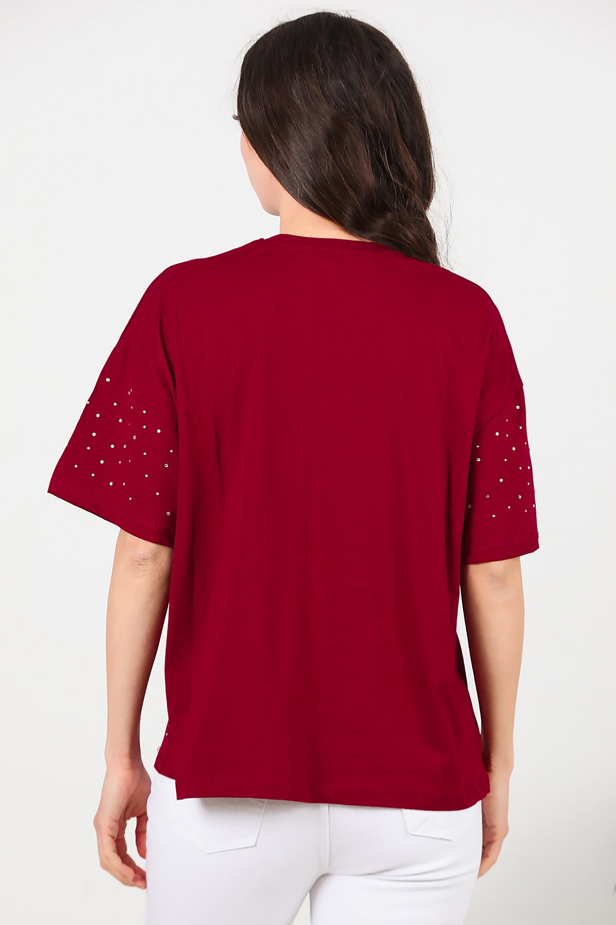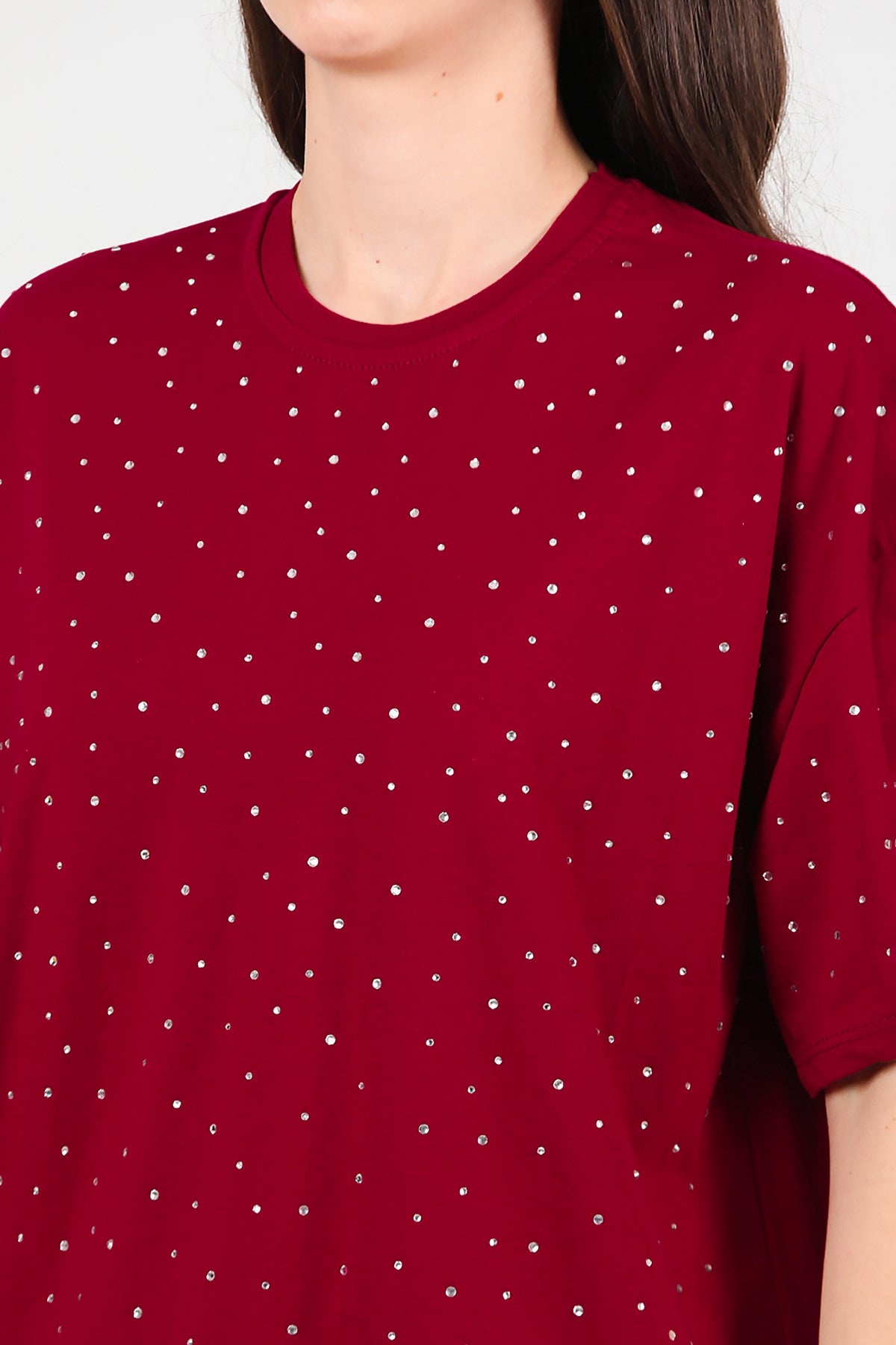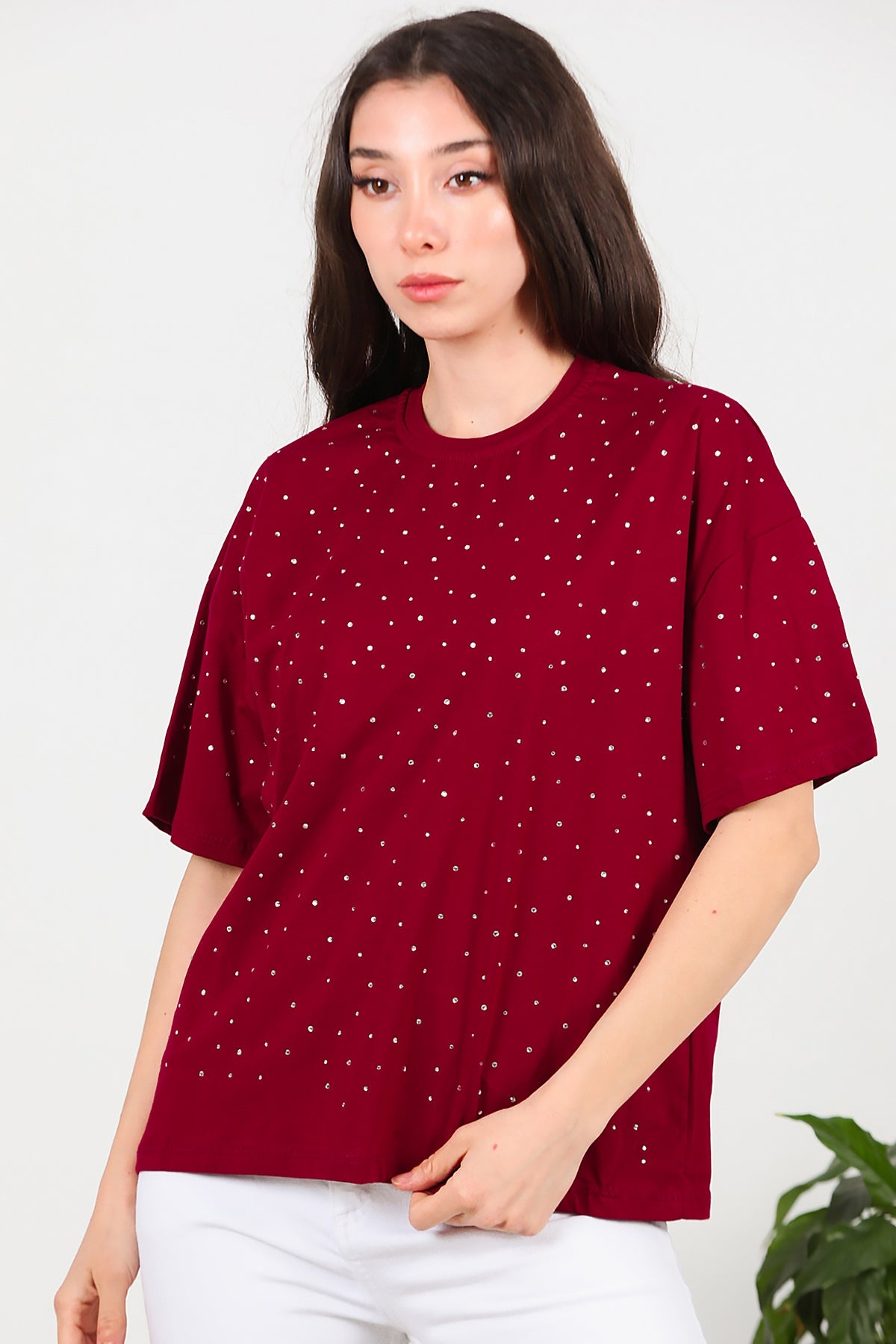 Kadın Taşlı Bisiklet Yaka T-shırt Bordo