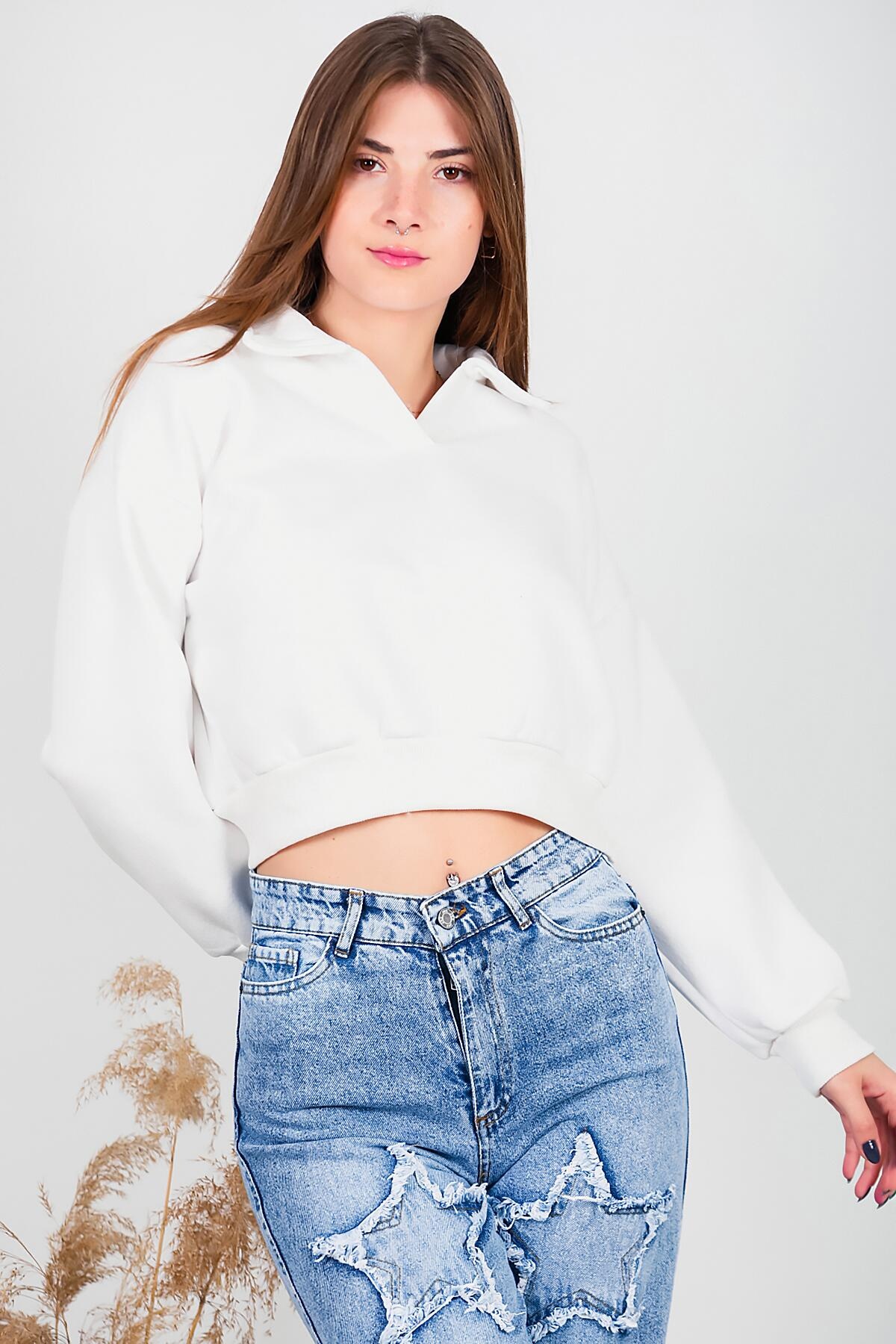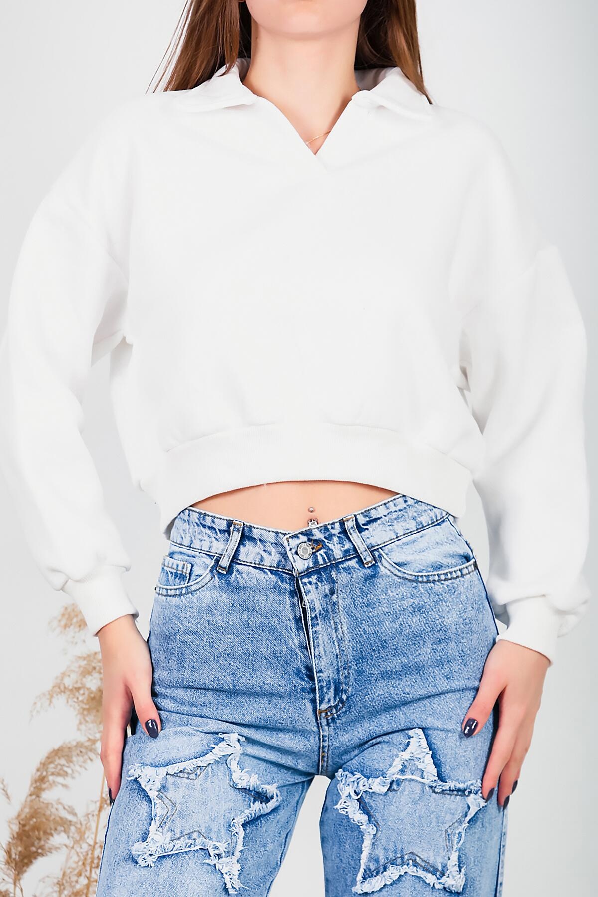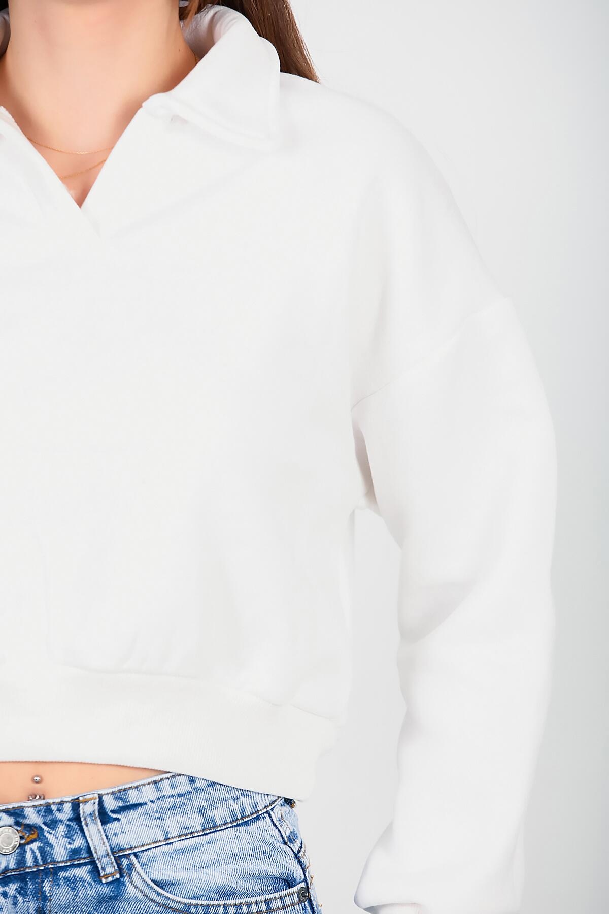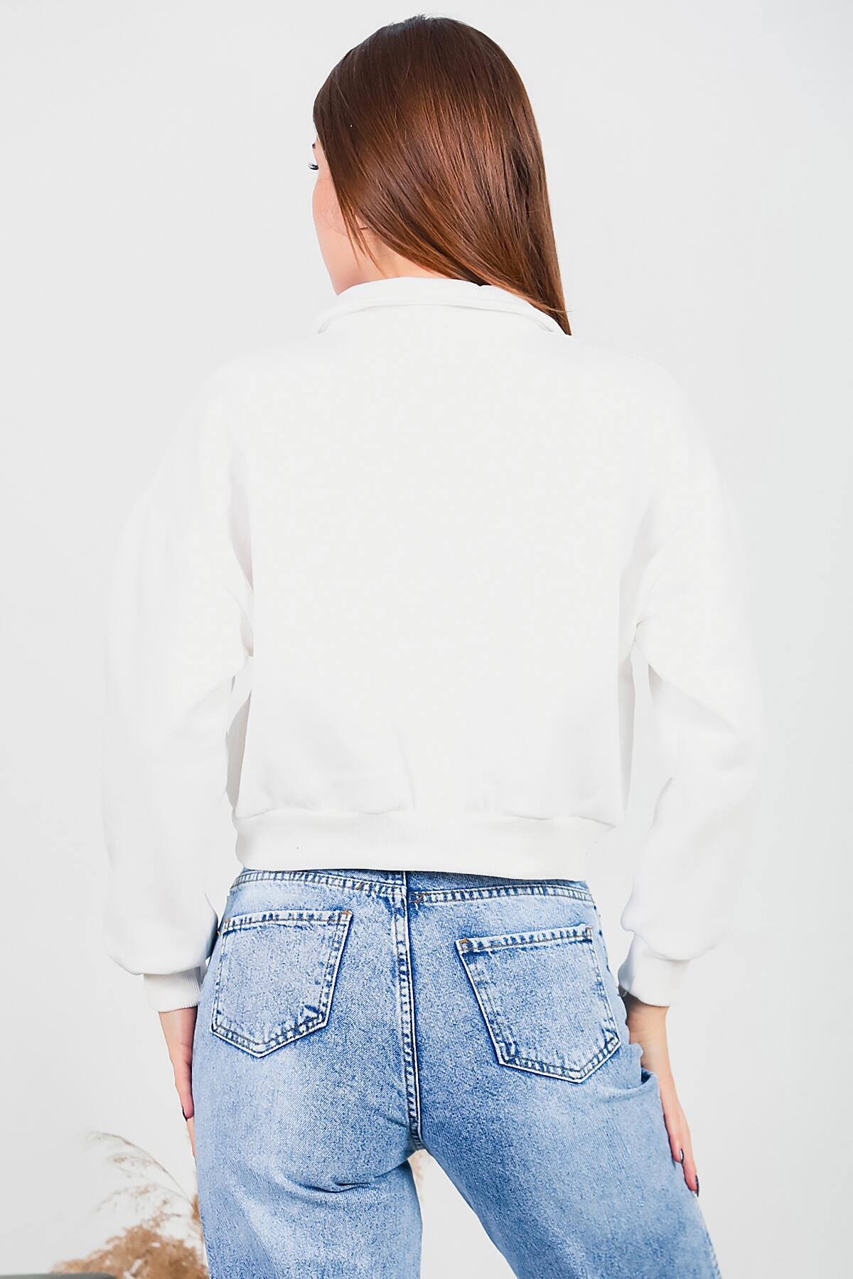 Kadın Üç İplik Kısa Sweat Ekru