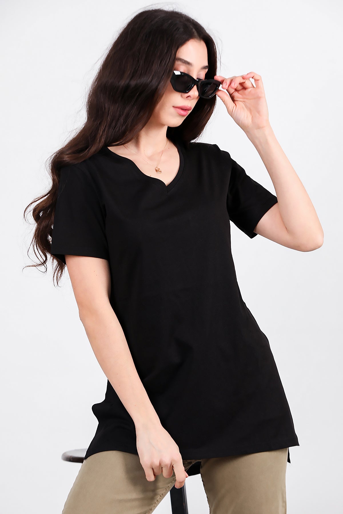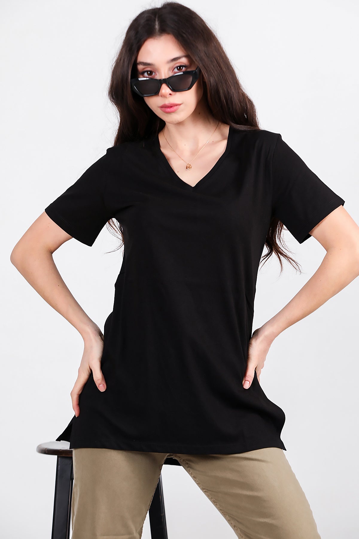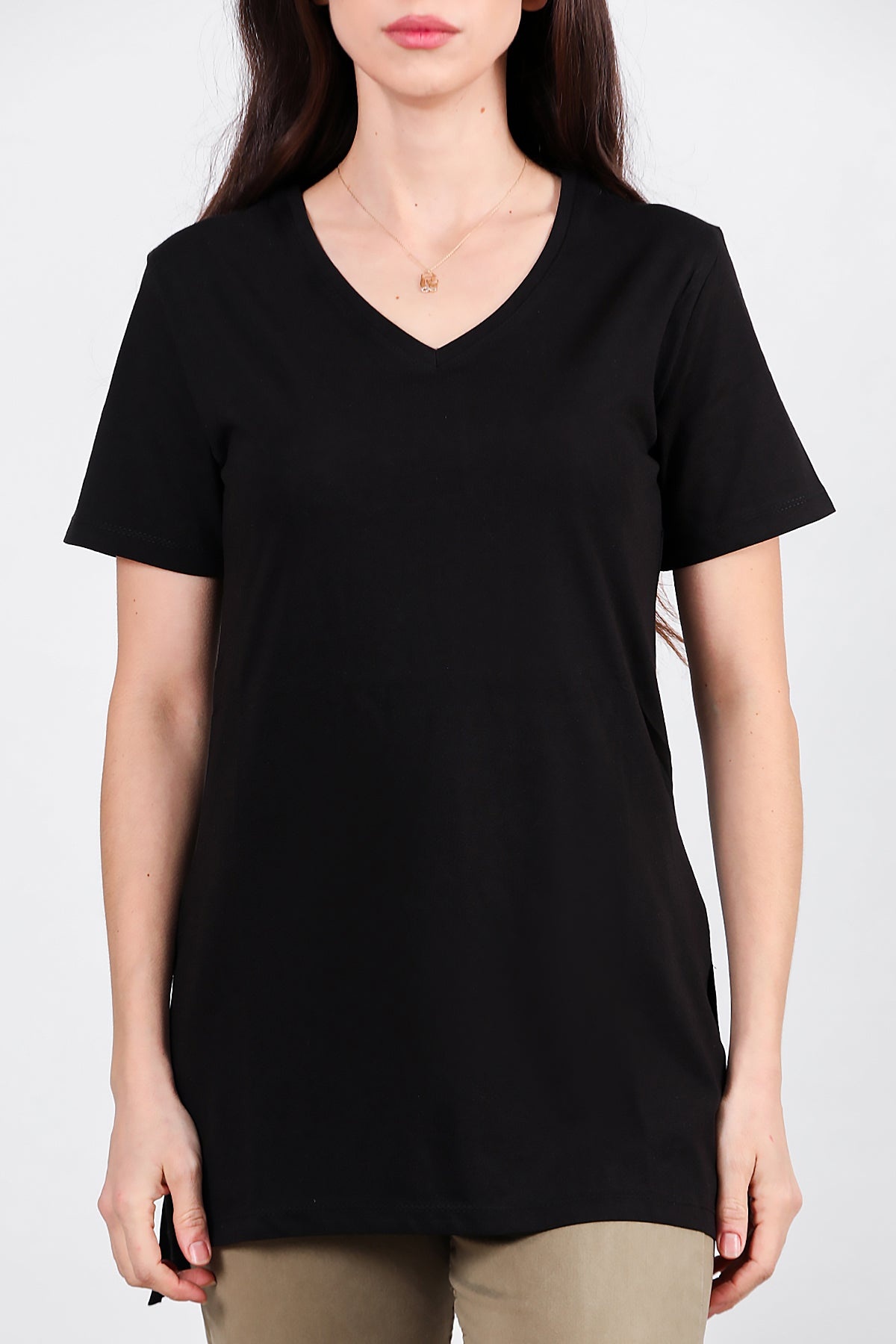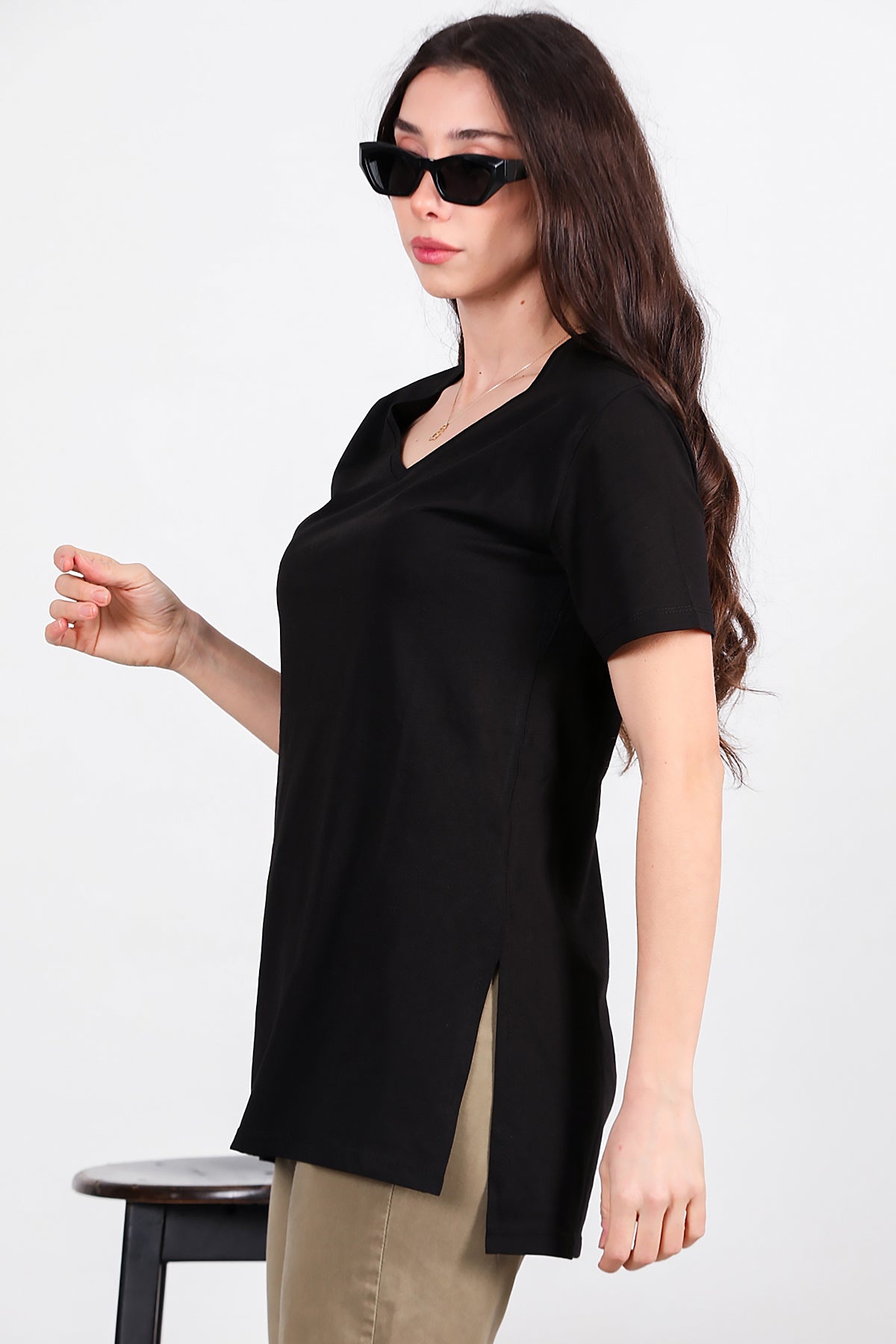 Kadın Yan Yırtmaçlı V Yaka T-shırt Siyah