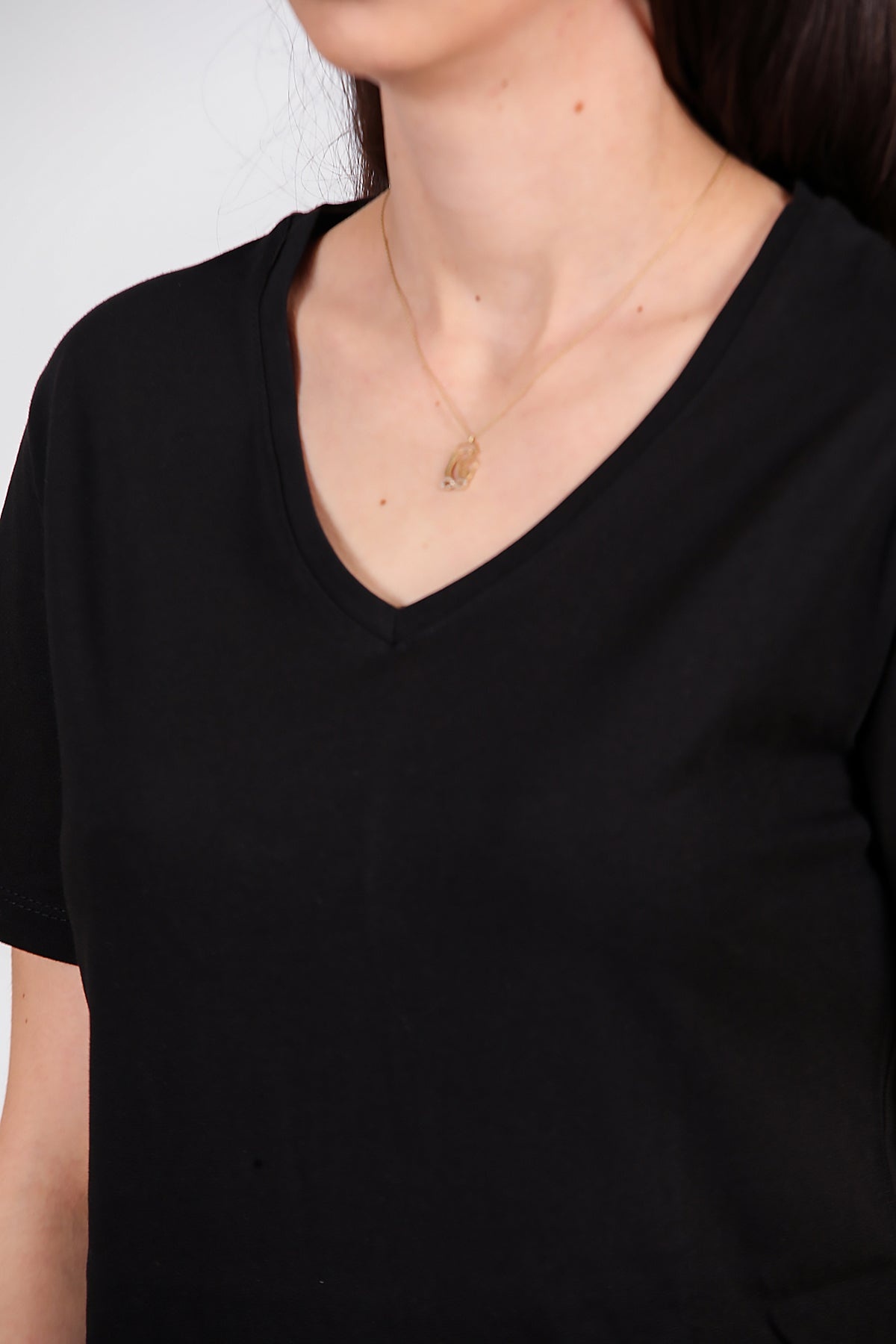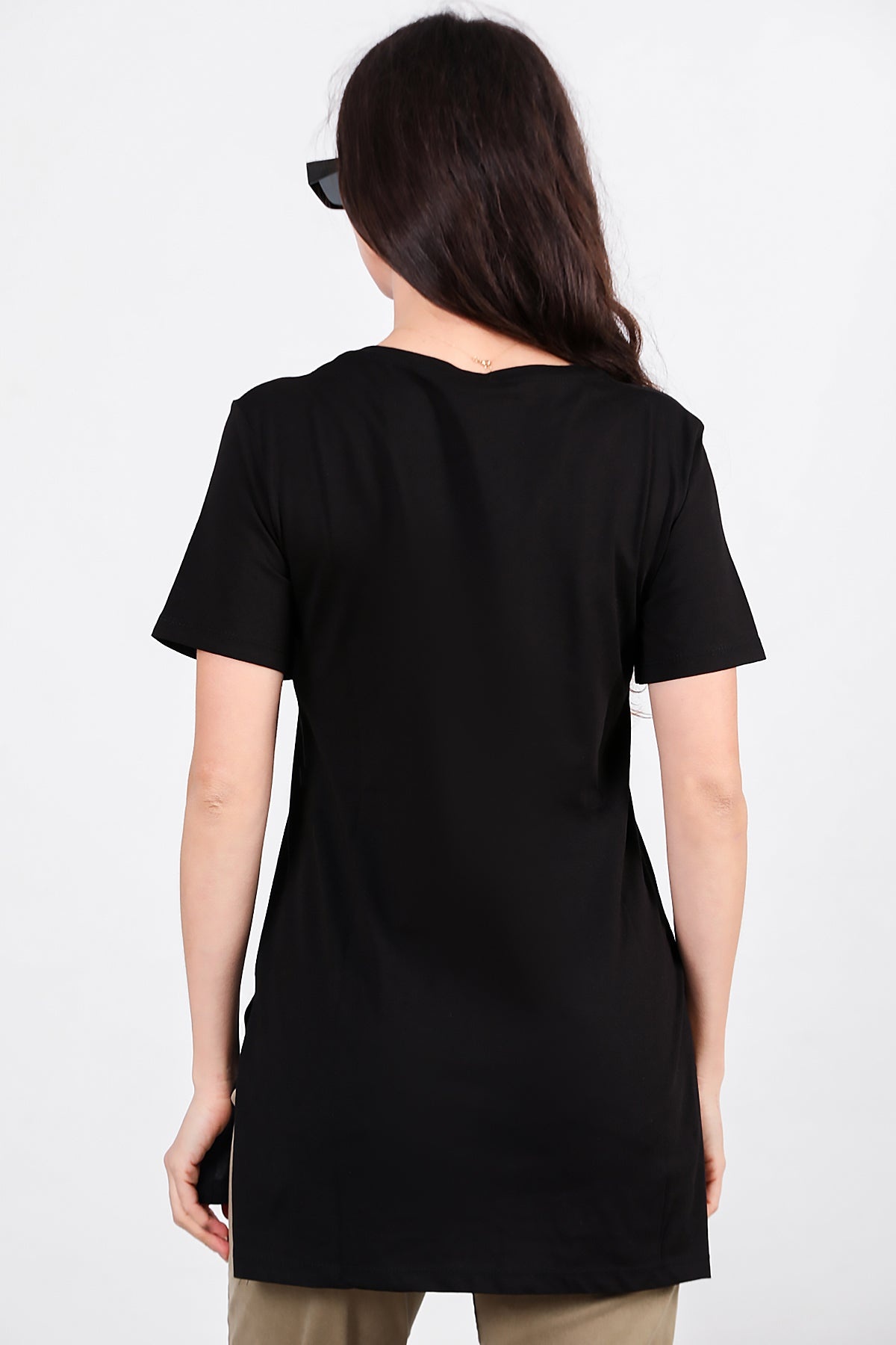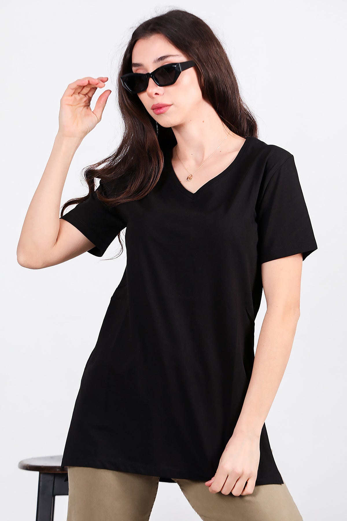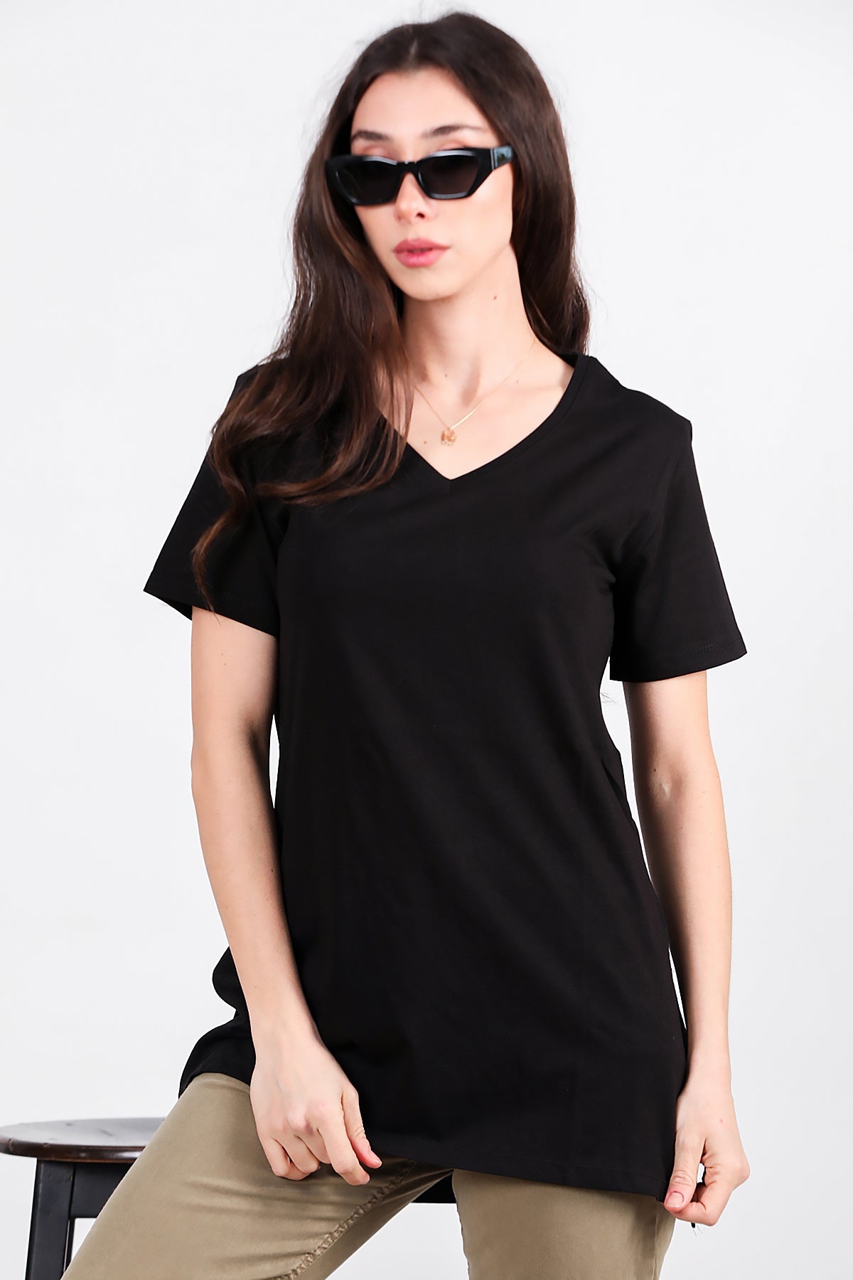 Kadın Yan Yırtmaçlı V Yaka T-shırt Siyah