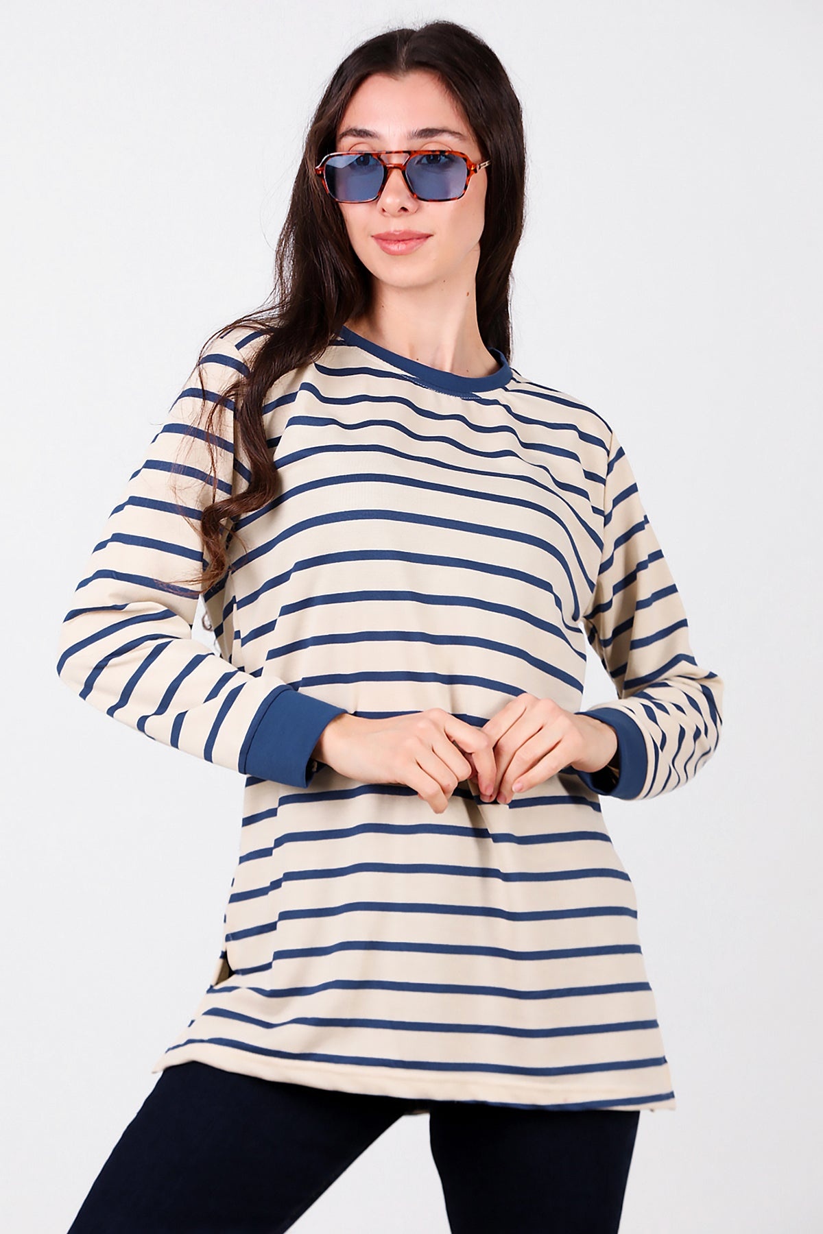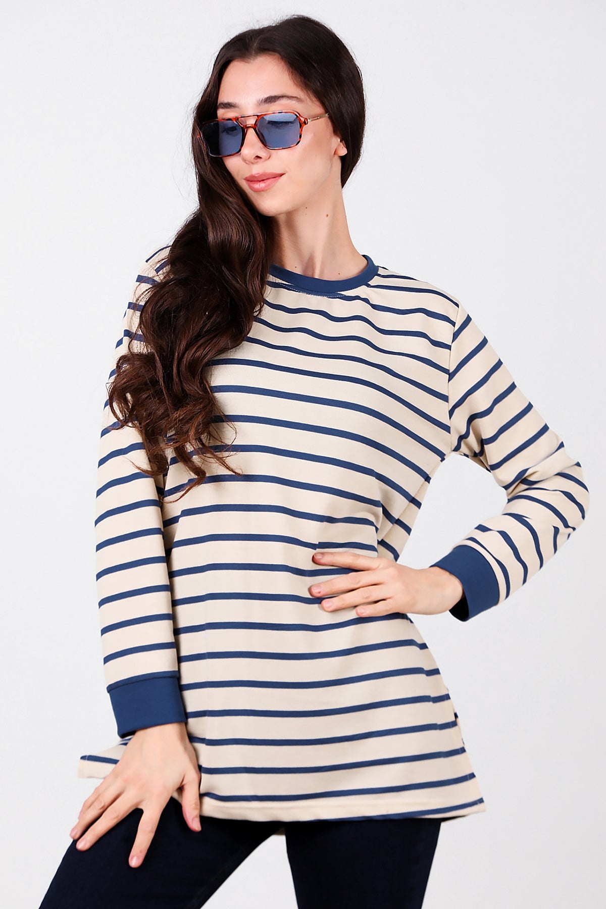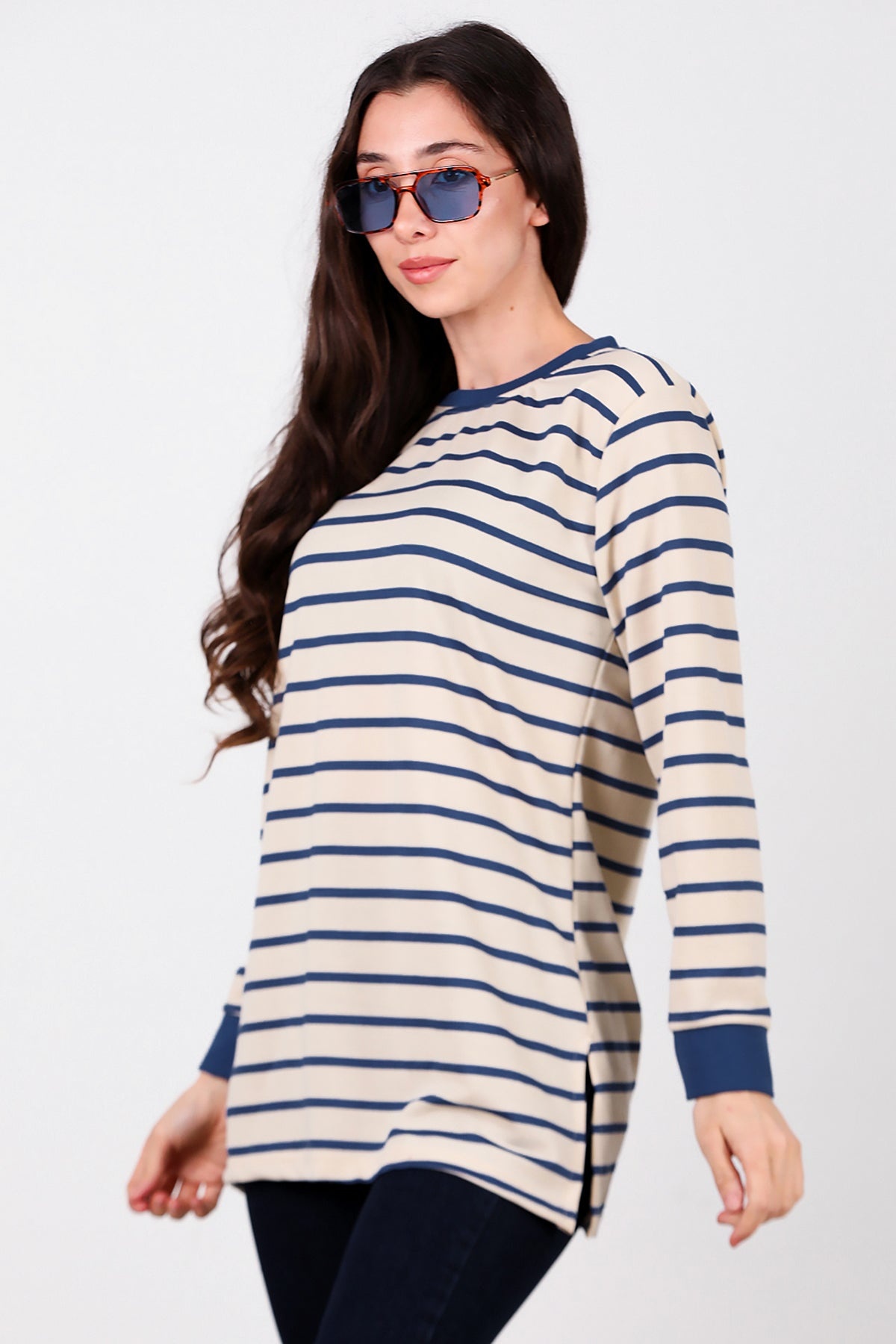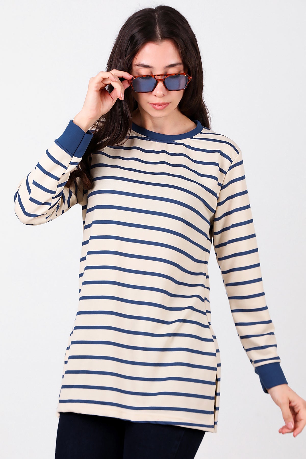 Kadın Yanı Yırtmaçlı Çizgili Tunik Mavi