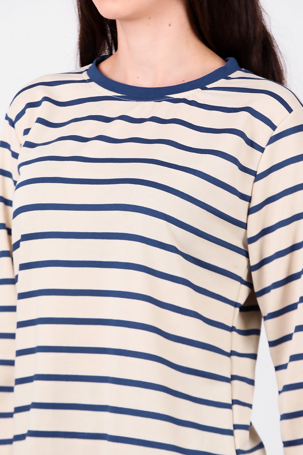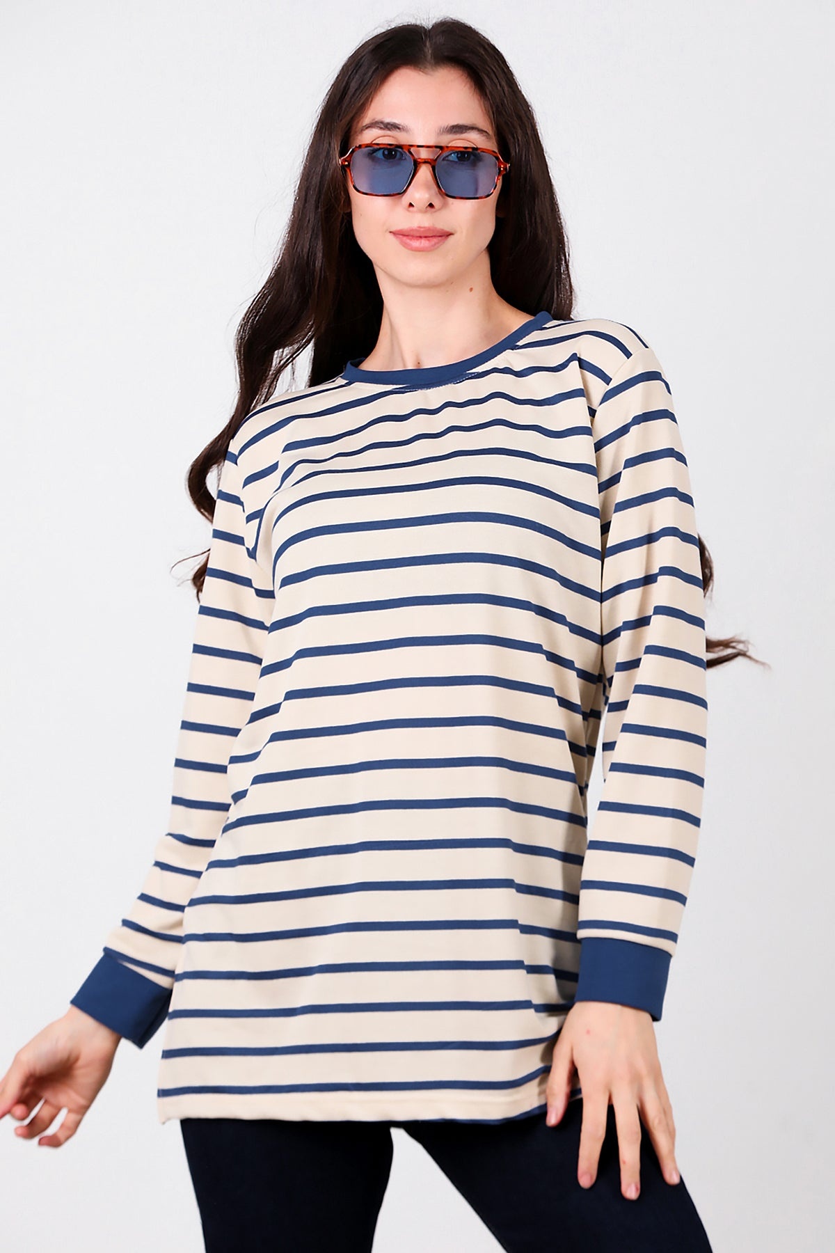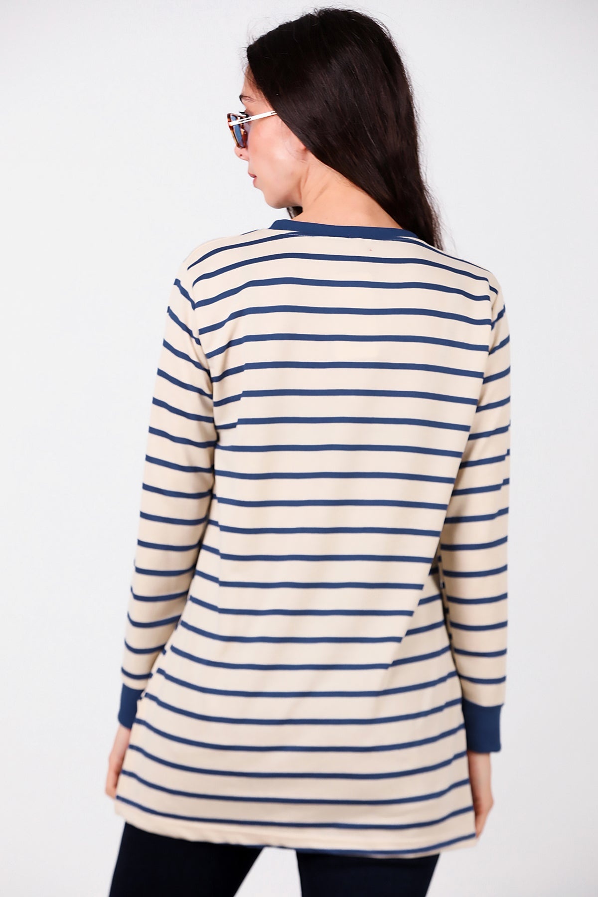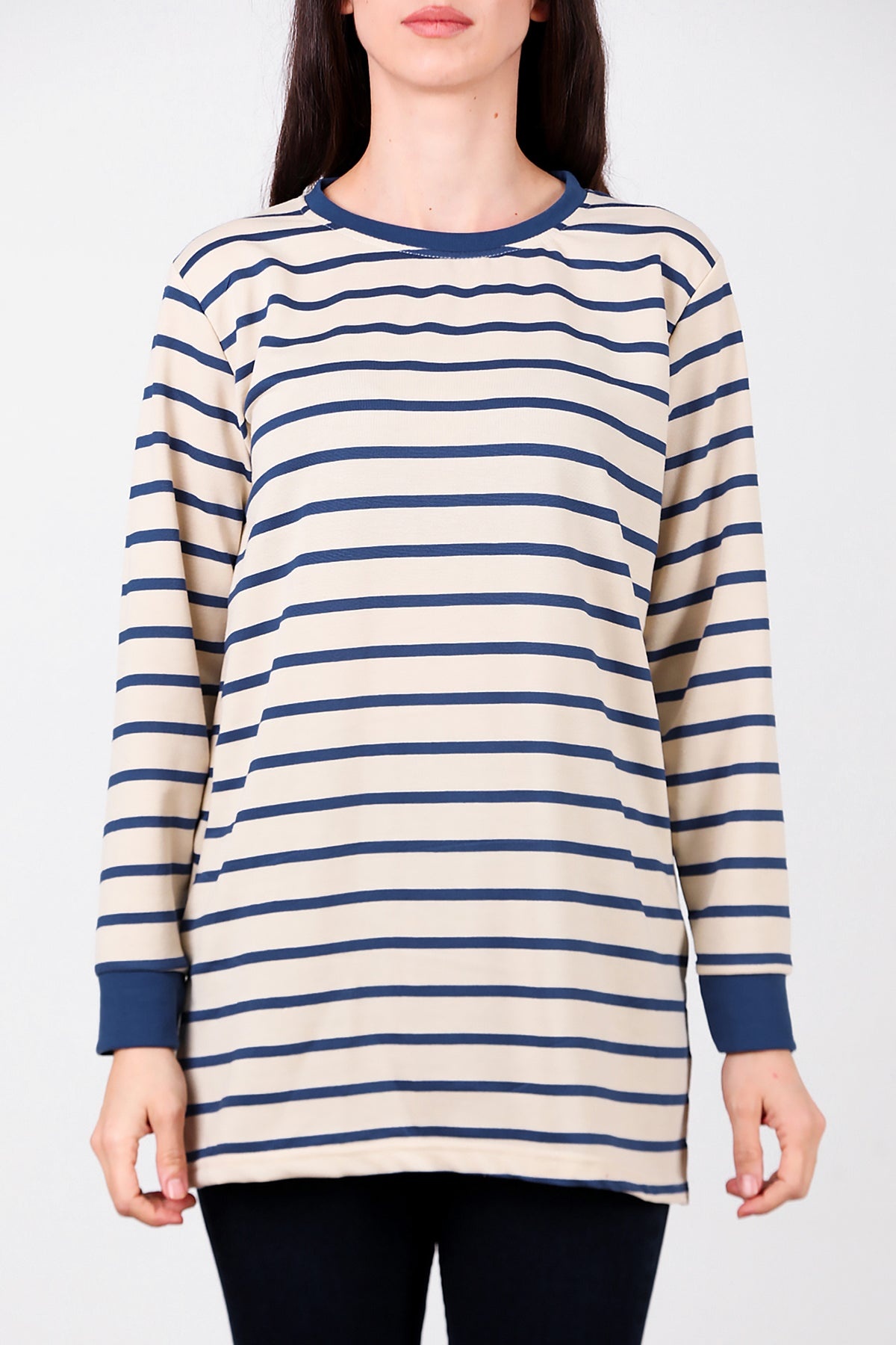 Kadın Yanı Yırtmaçlı Çizgili Tunik Mavi