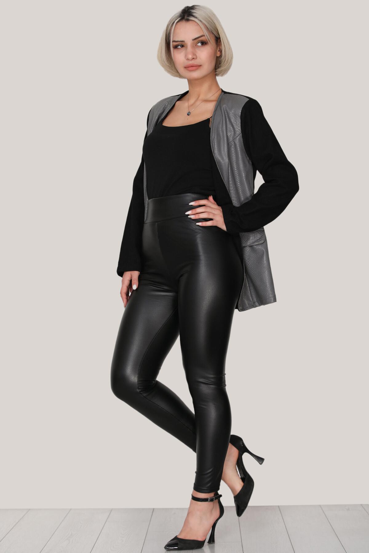 Kadın Parlak Deri Tayt Siyah