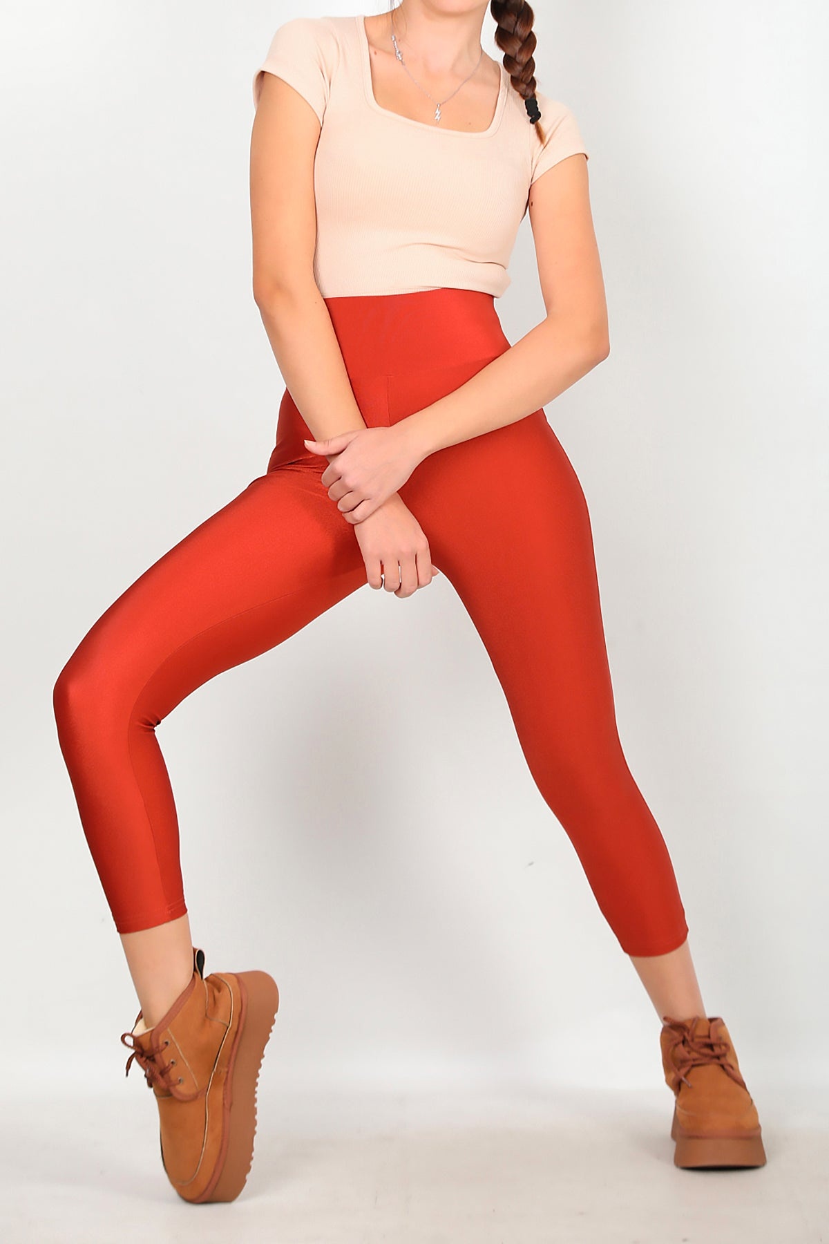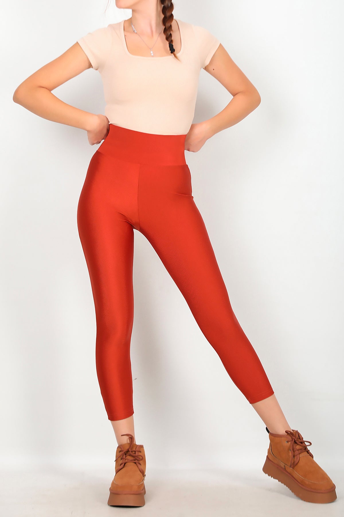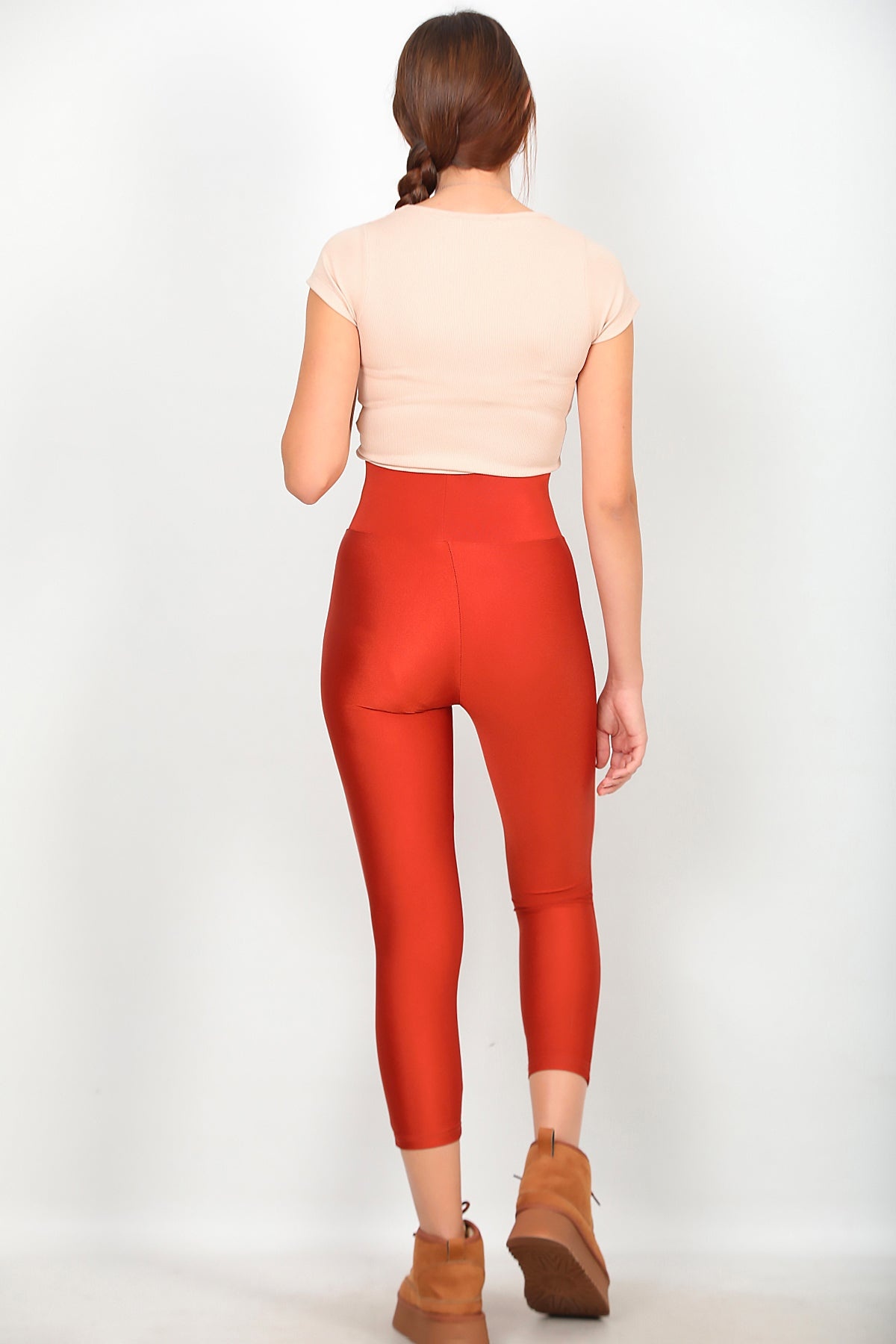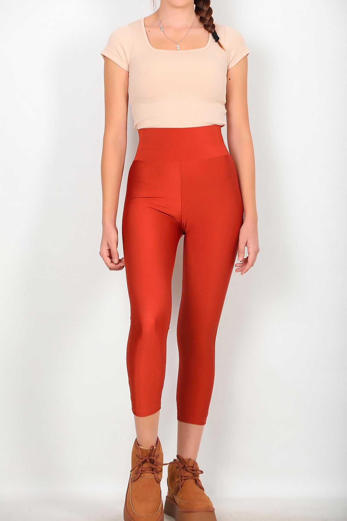 Kadın Yüksek Bel Parlak Tayt Kiremit Kiremit