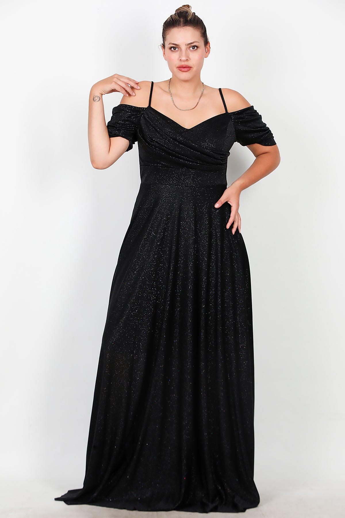 Büyük Beden Düşük Omuz Simli Uzun Abiye Siyah