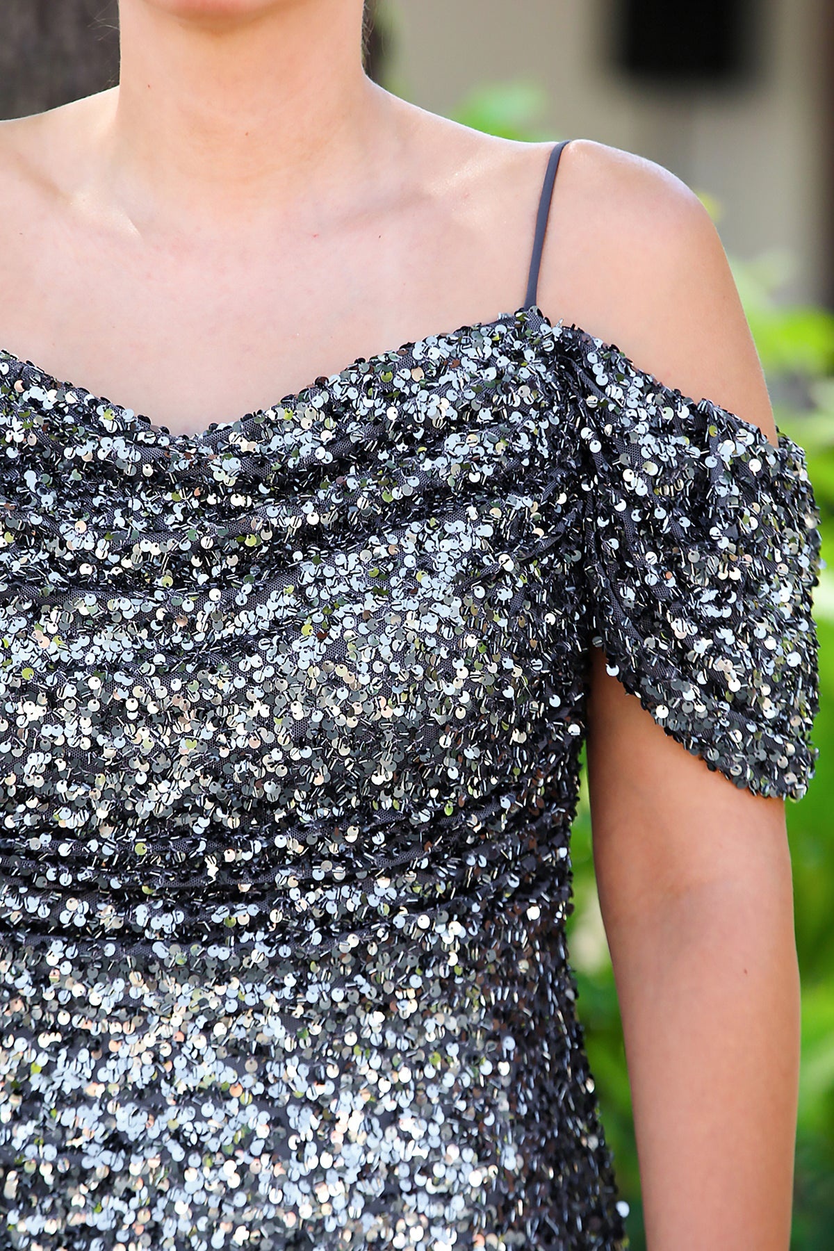 Büyük Beden Düşük Omuz Yırtmaçlı Pullu Uzun Abiye Gri