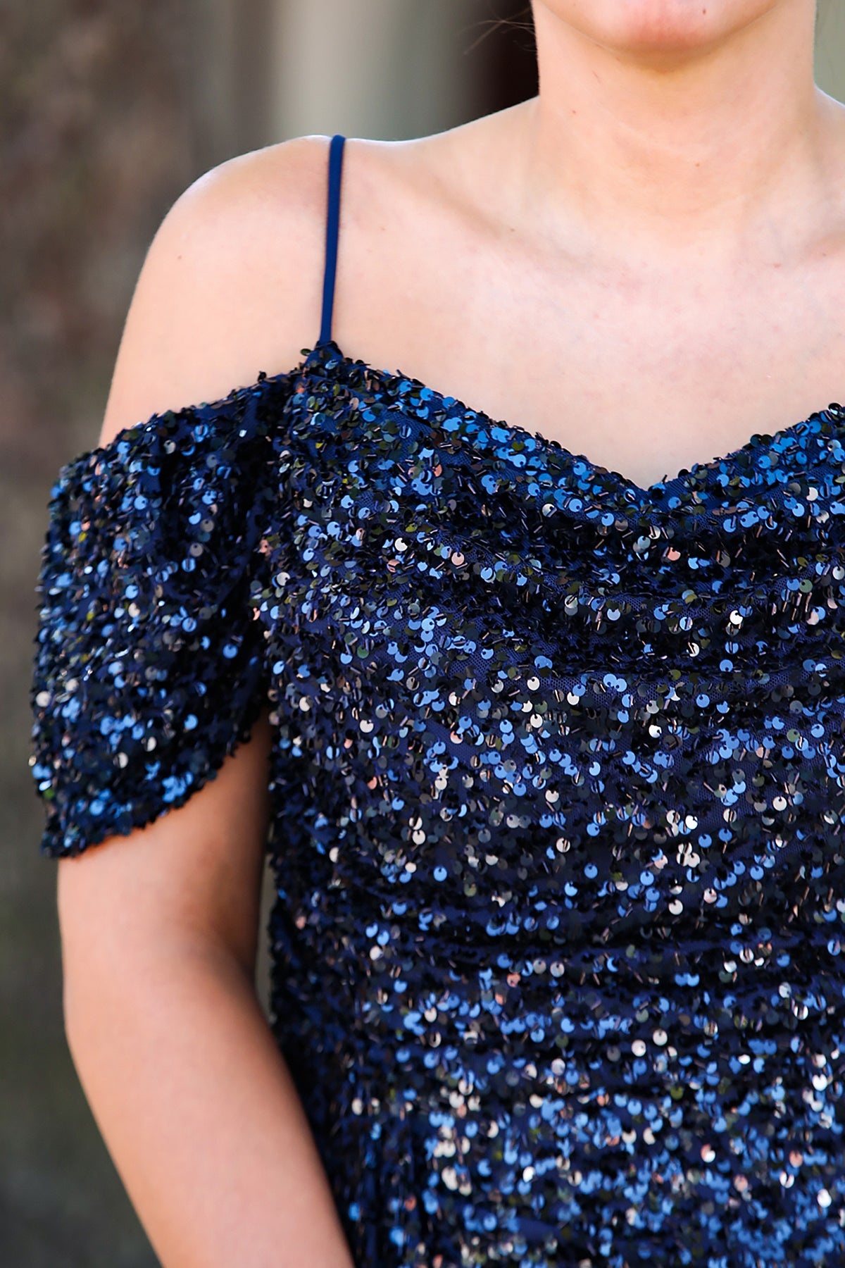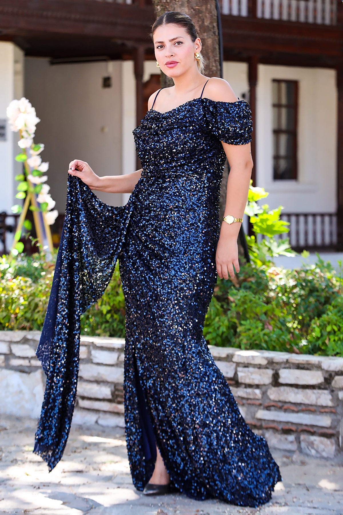 Büyük Beden Düşük Omuz Yırtmaçlı Pullu Uzun Abiye Lacivert
