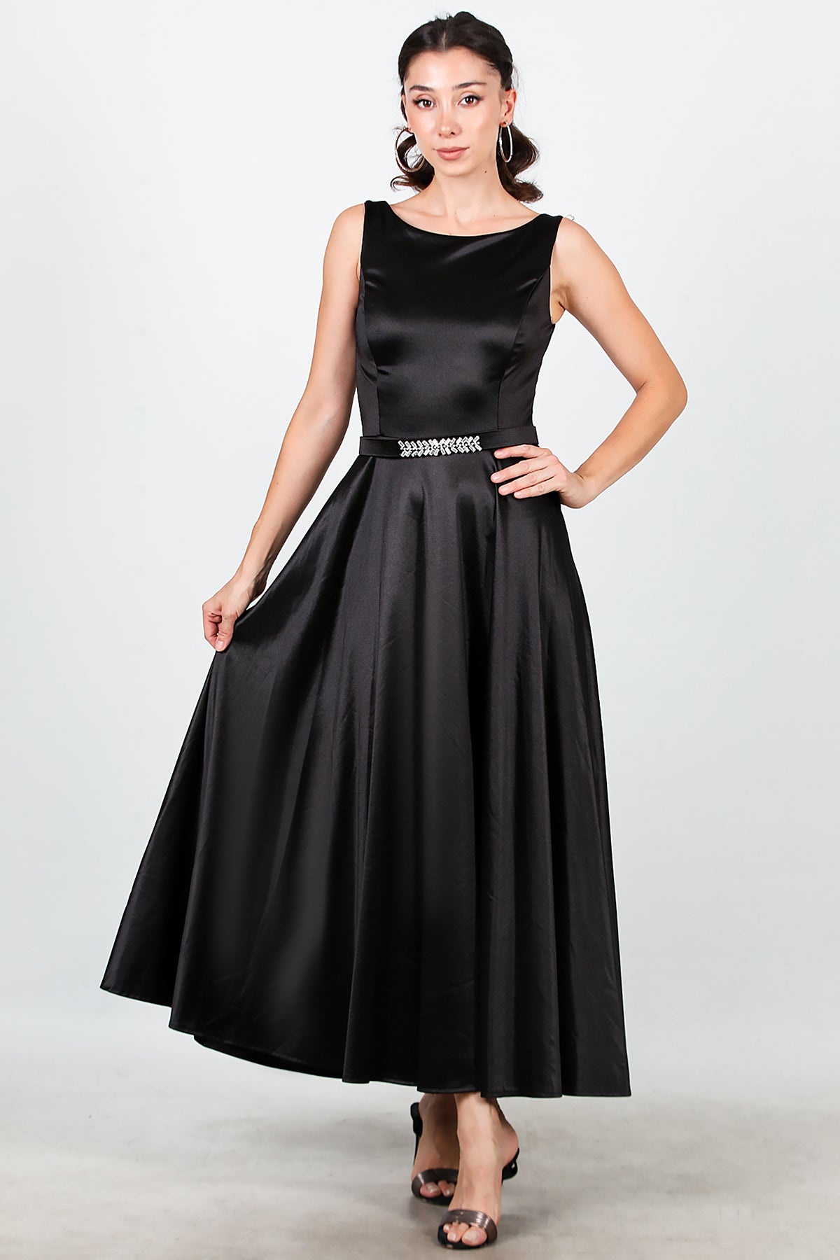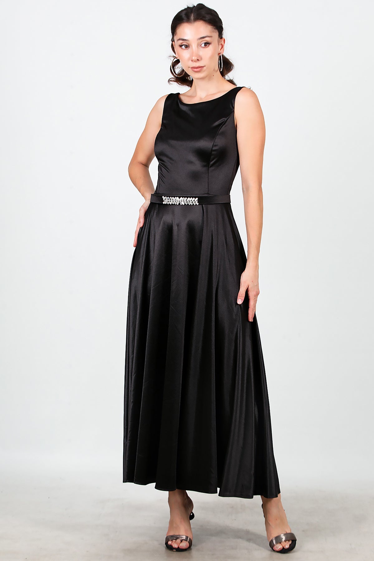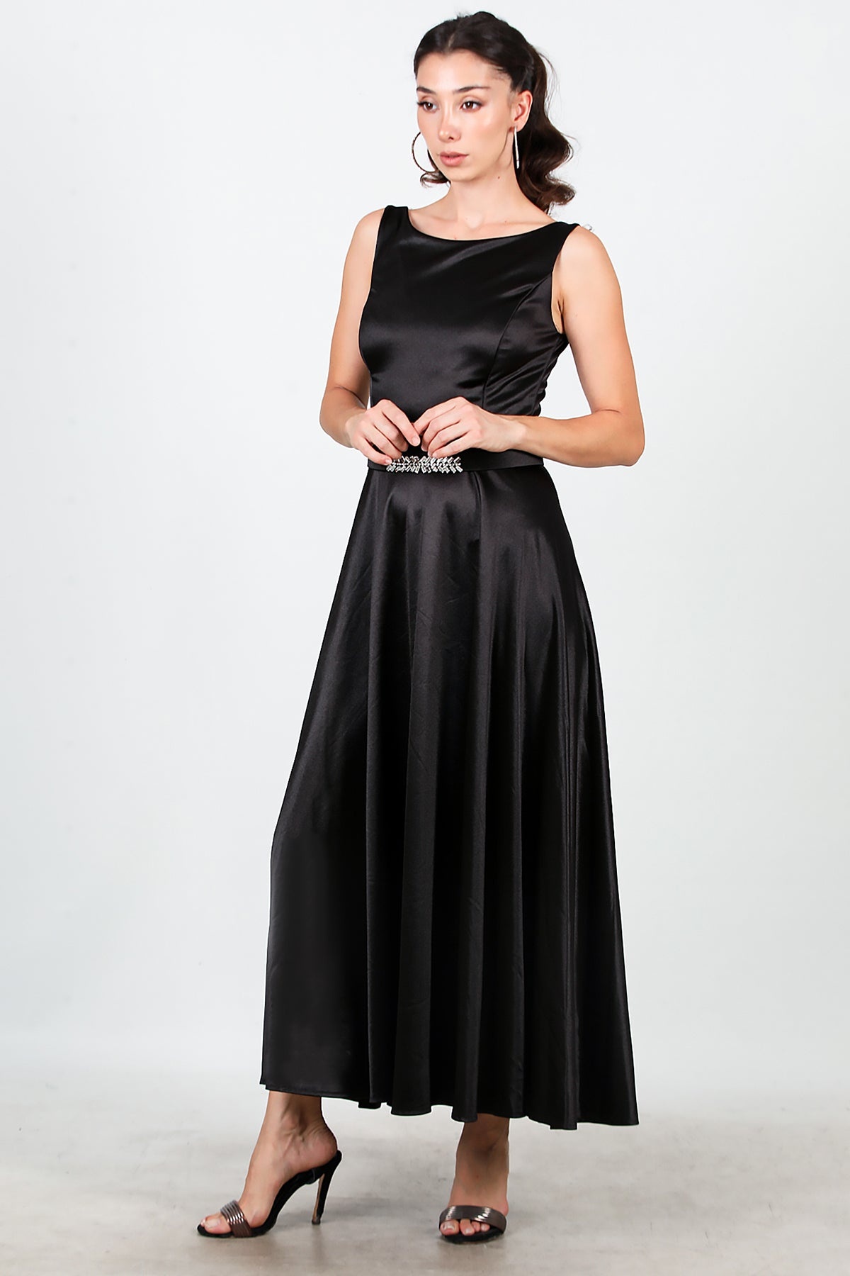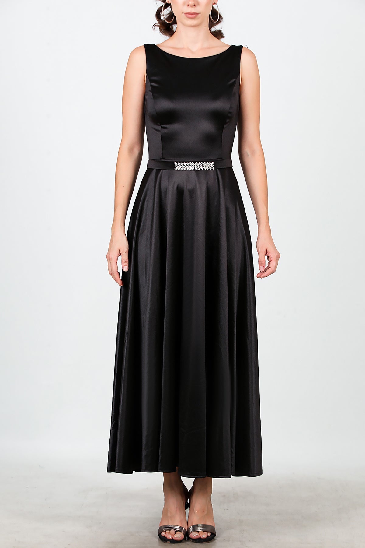 Kadın Askılı Kemerli Midi Boy Abiye Siyah