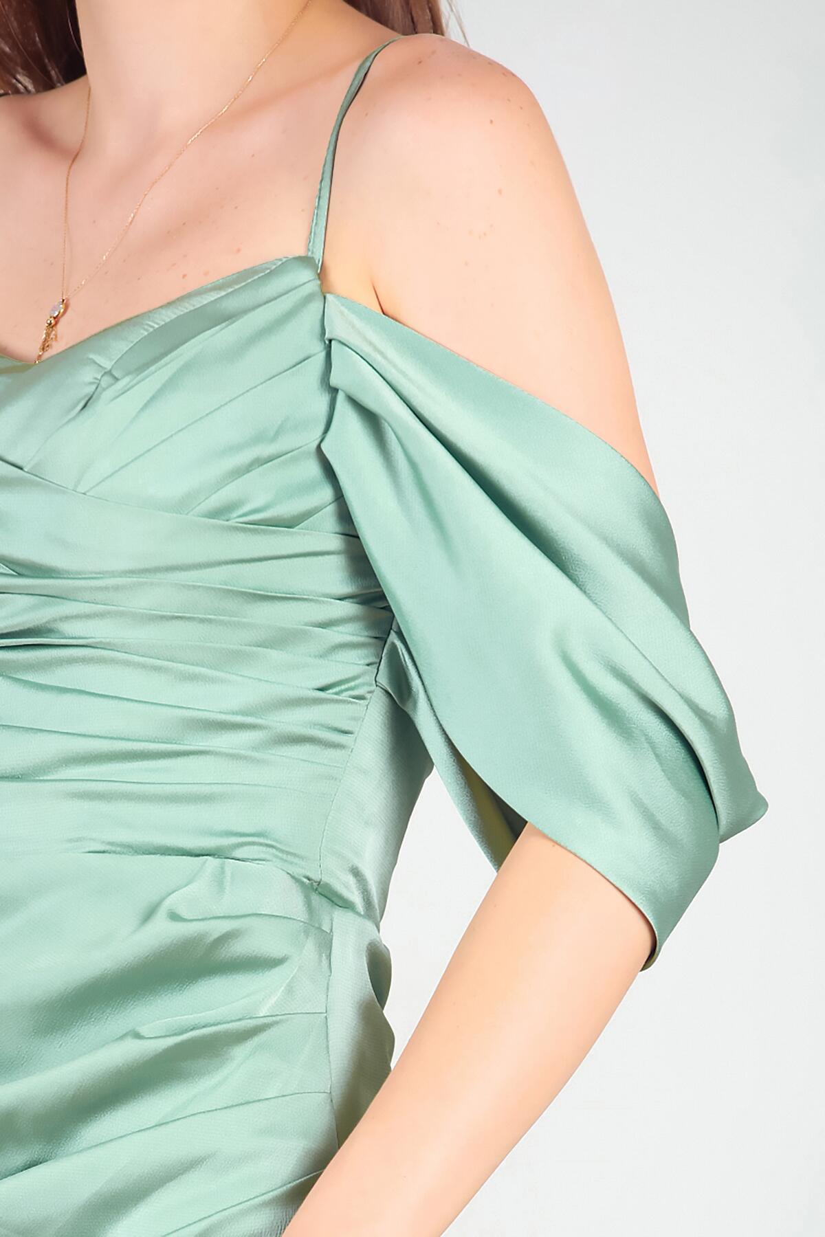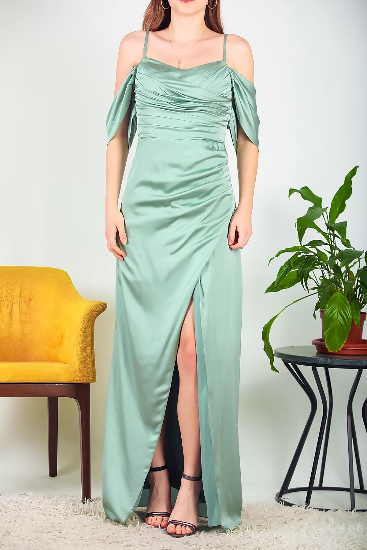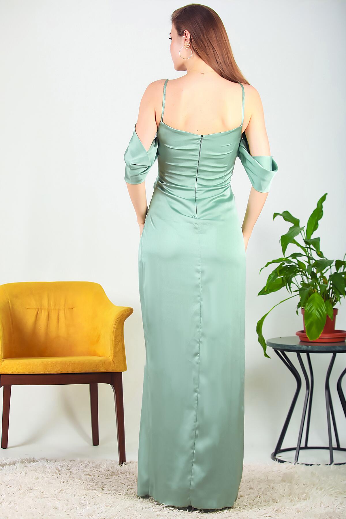 Kadın Askılı Saten Uzun Abiye Çağla Yeşili