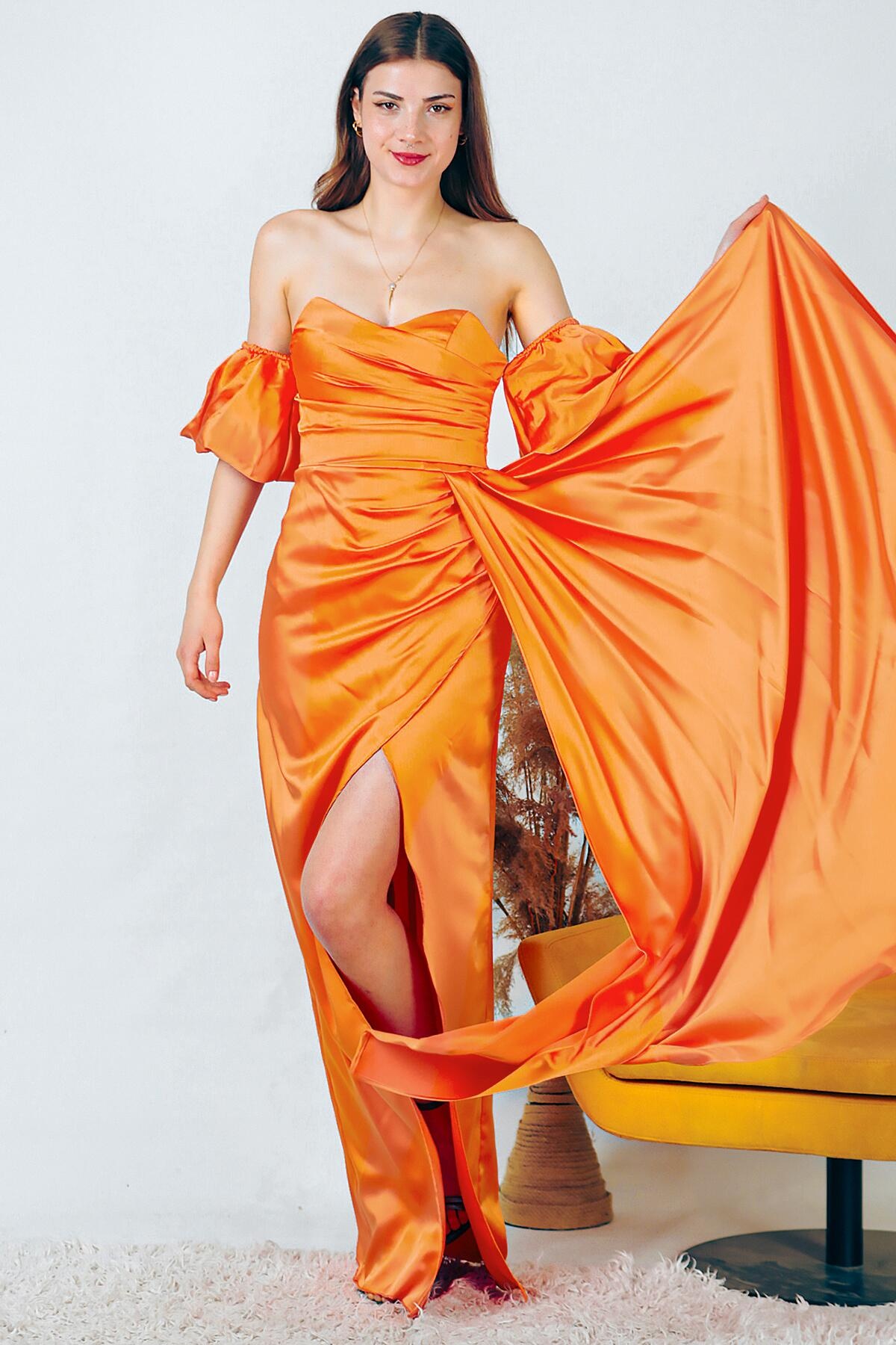 Kadın Balon Kol Saten Uzun Abiye Elbise Turuncu