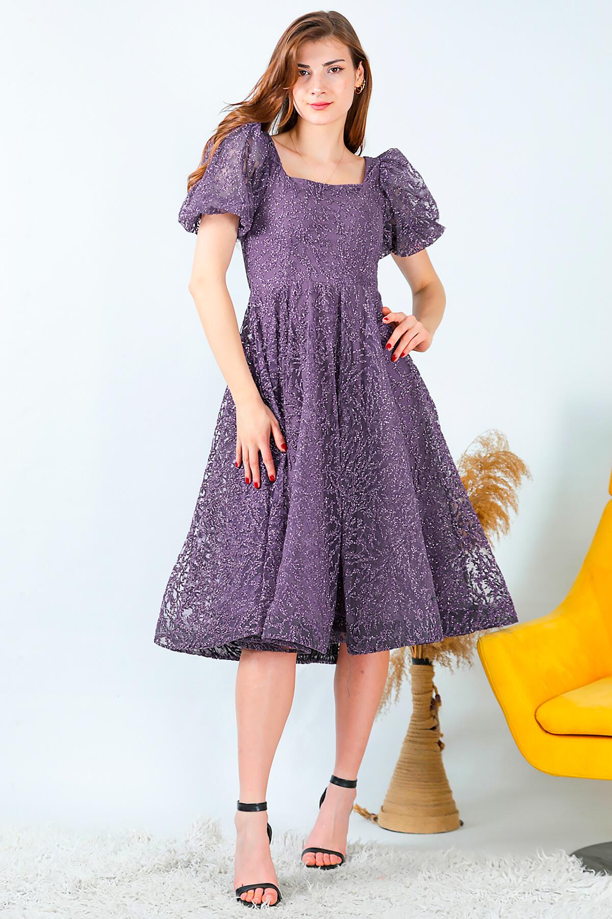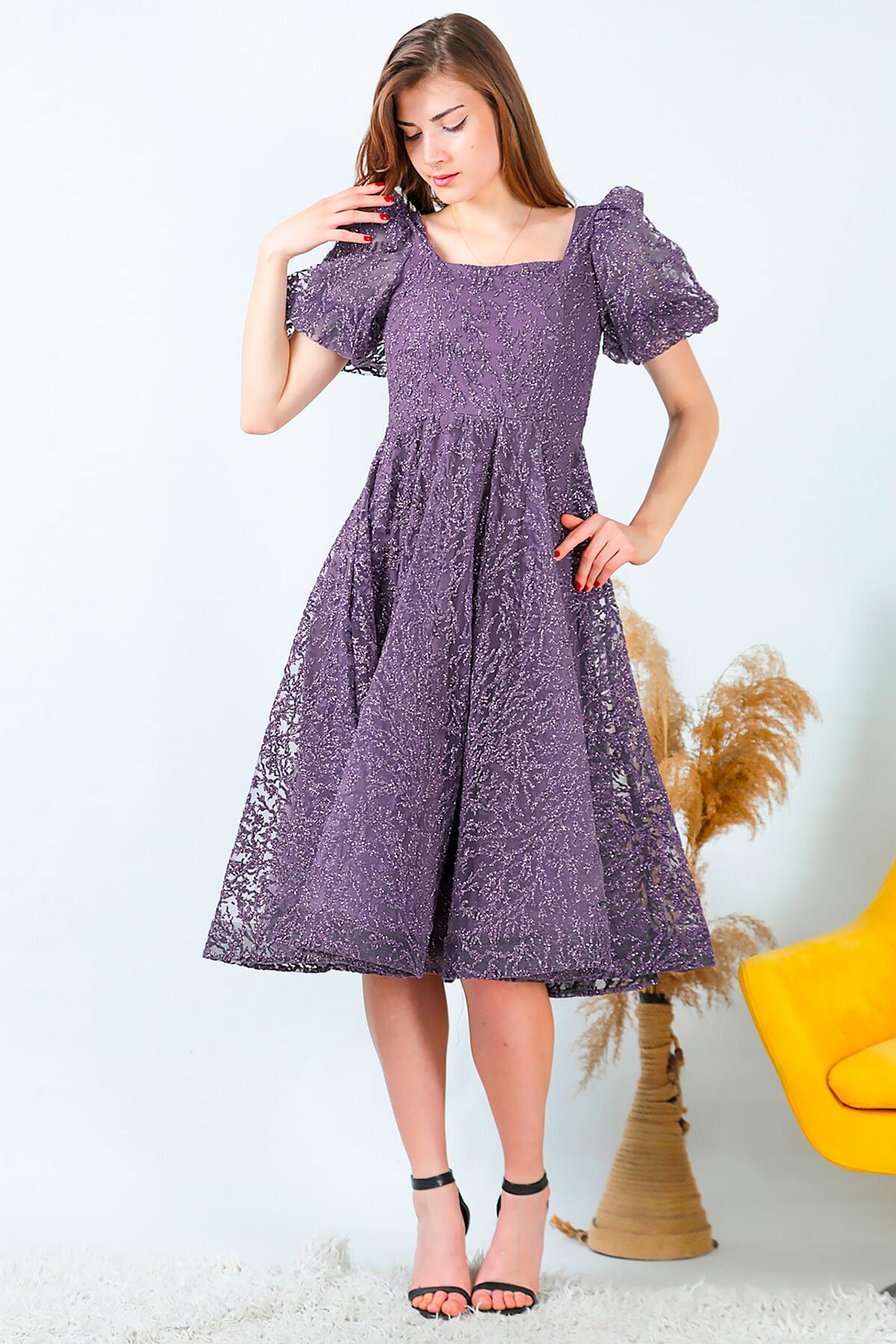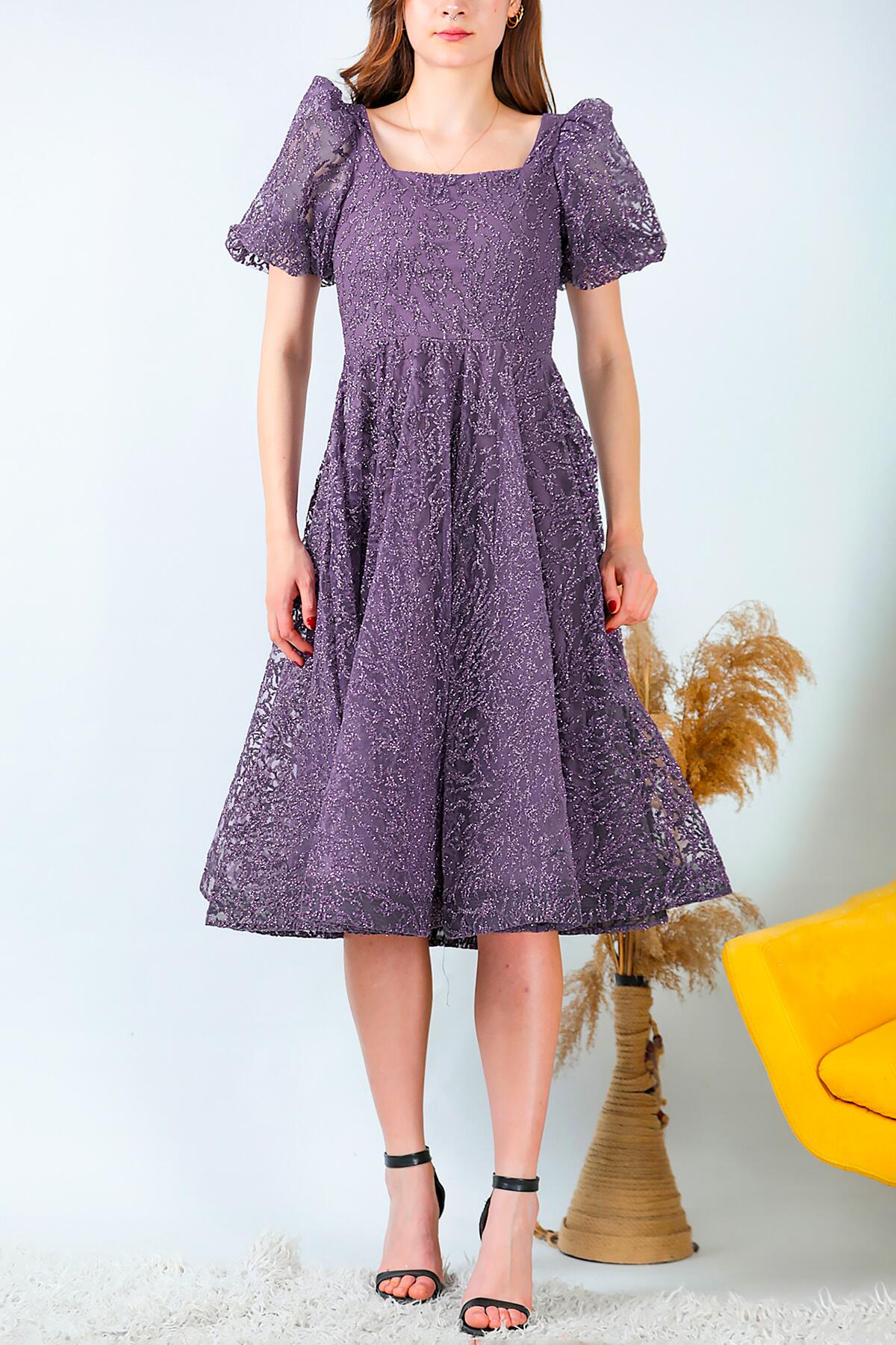 Kadın Balon Kol Simli Midi Boy Abiye Elbise Koyu Mor