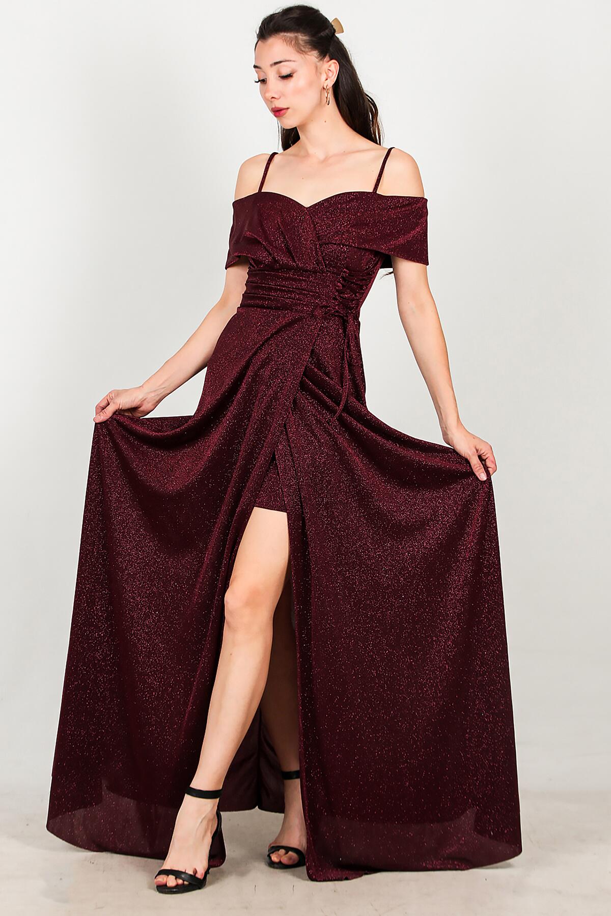 Kadın Bel Bağcık Detay Uzun Abiye Bordo