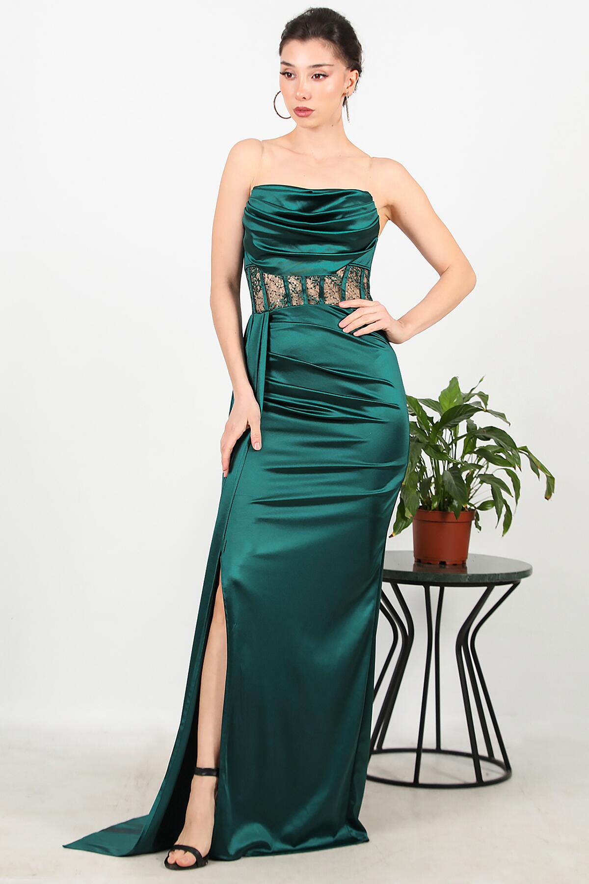 Kadın Bel Dantel Detay Uzun Saten Abiye Zümrüt
