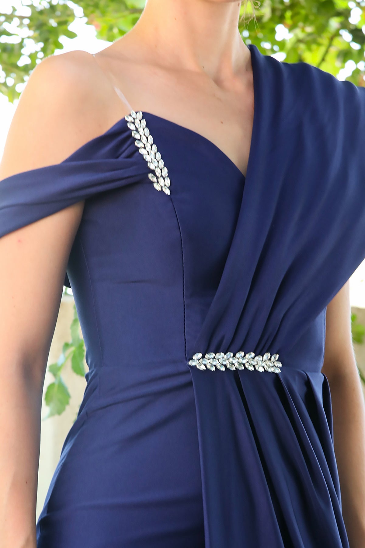 Kadın Bel Göğüs Taş Detay Abiye Lacivert