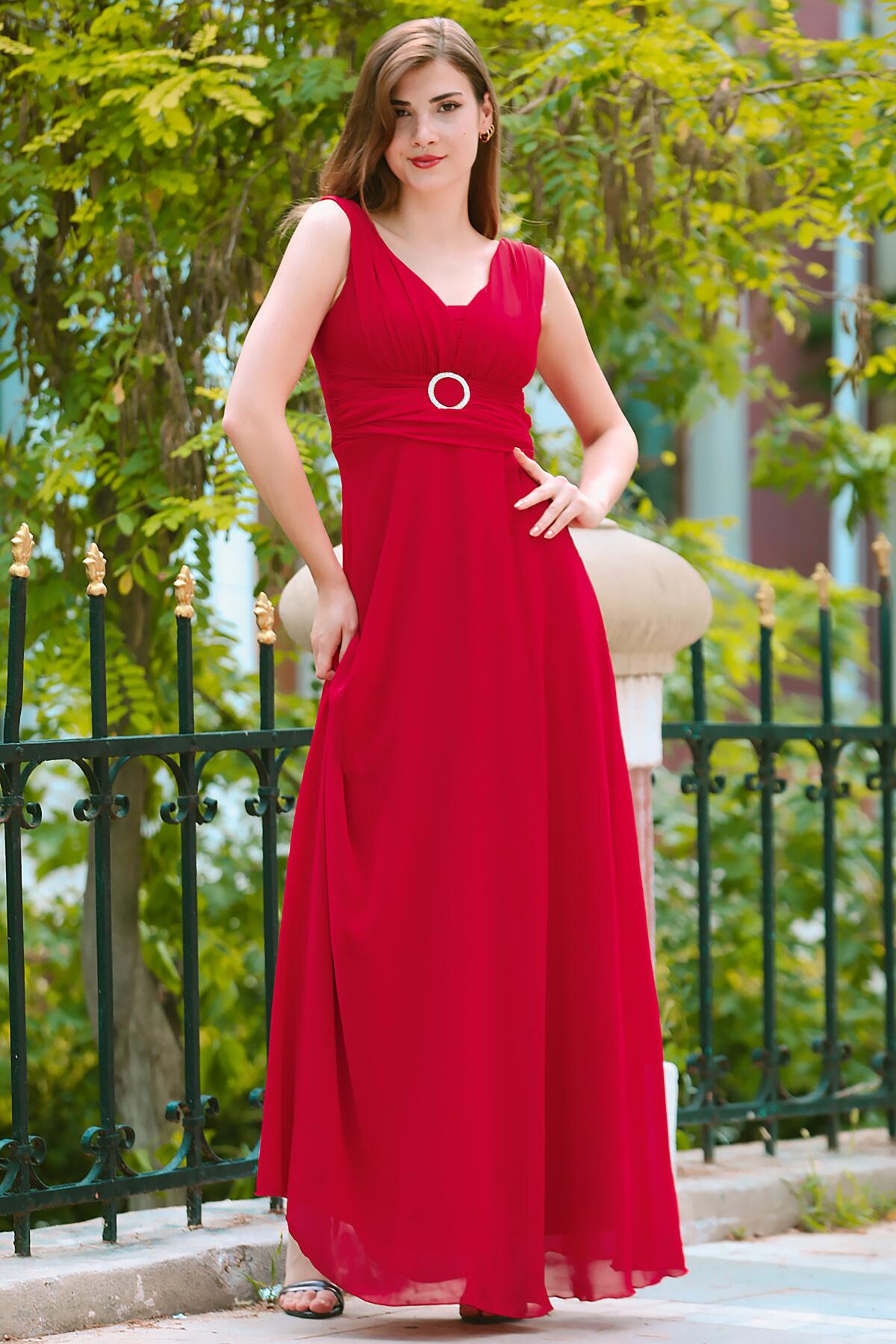 Kadın Bel Tokalı Uzun Şifon Abiye Elbise Kırmızı