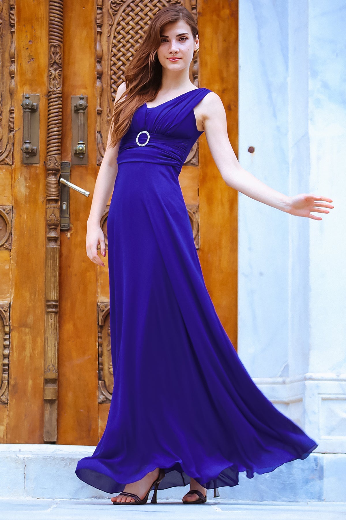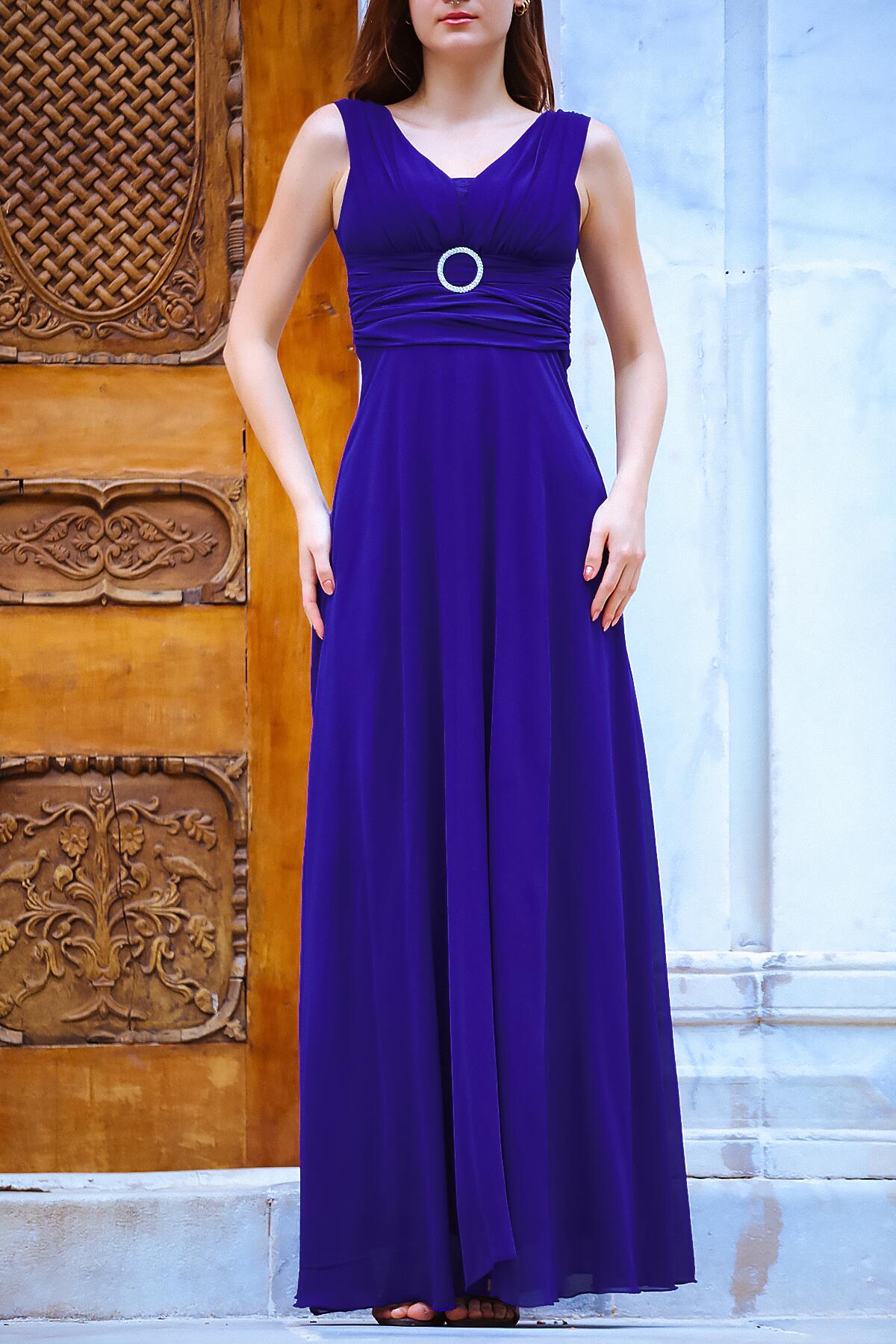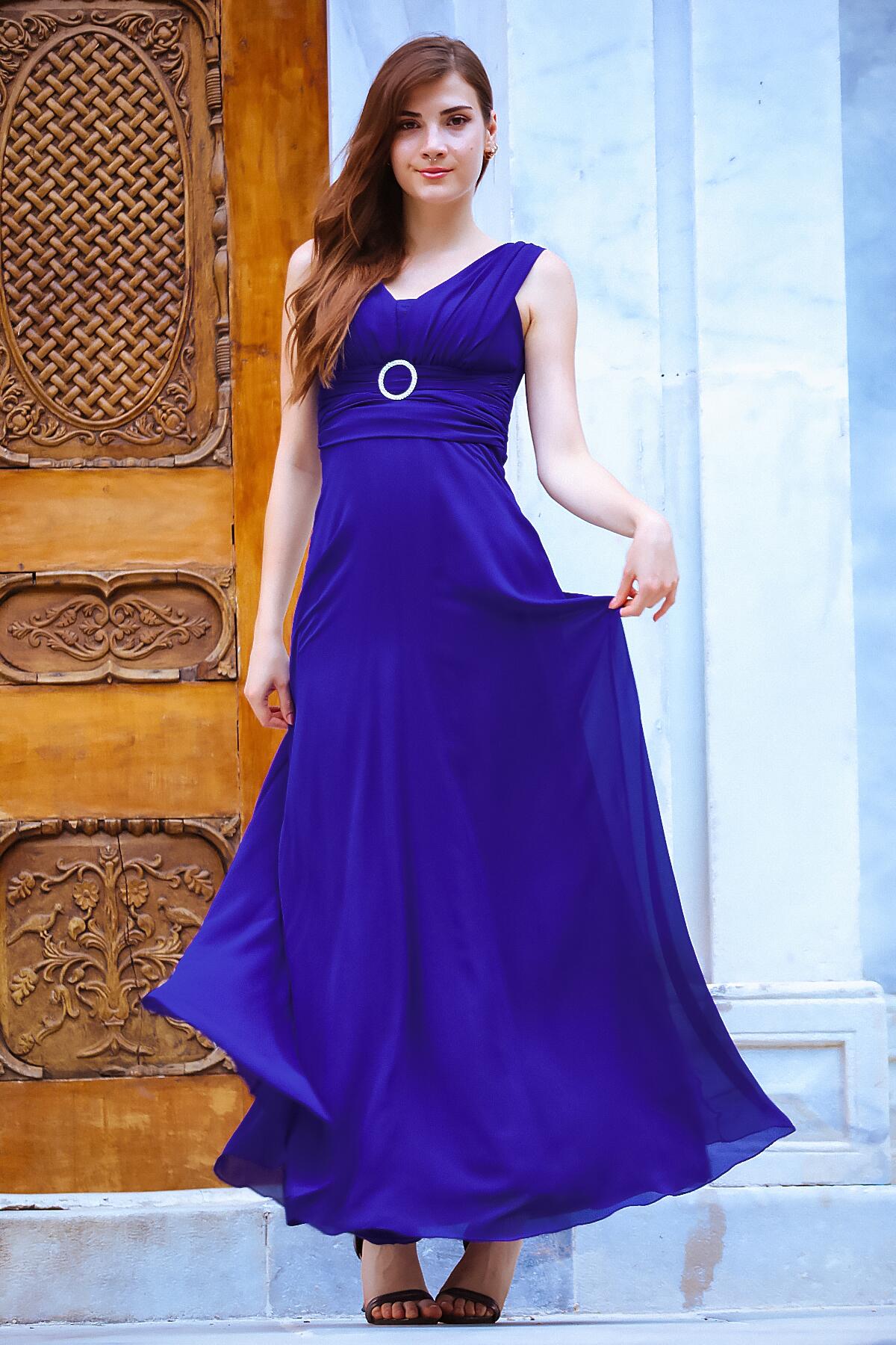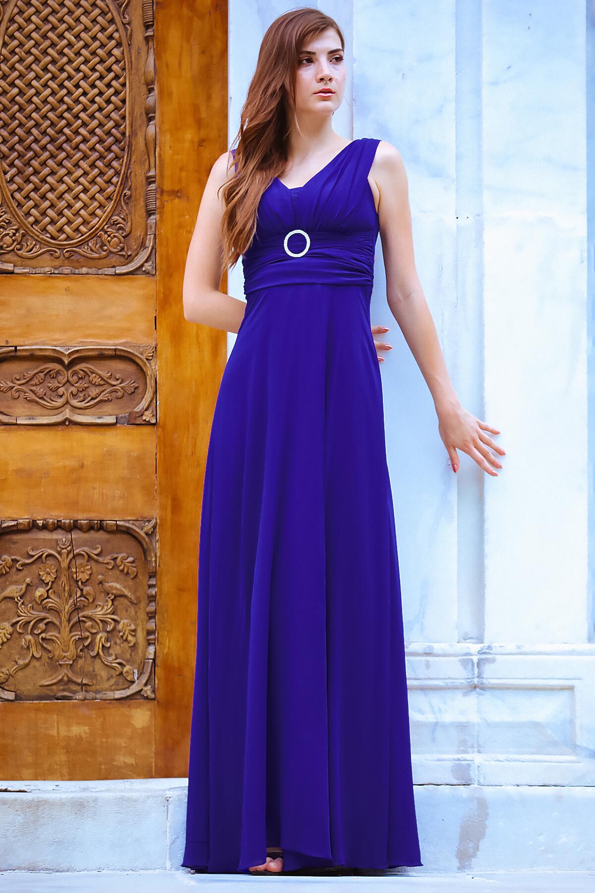 Kadın Bel Tokalı Uzun Şifon Abiye Elbise Saks