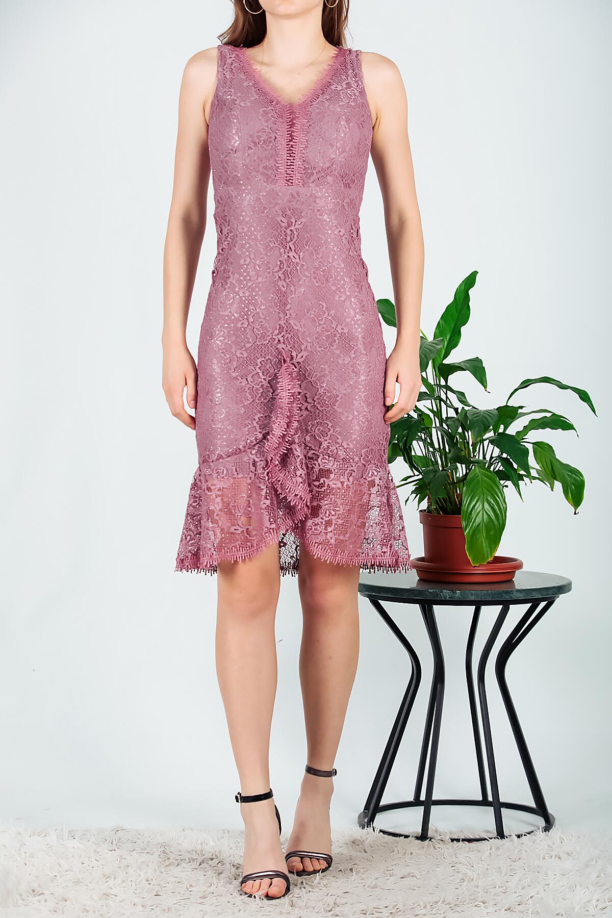 Kadın Dantelli Midi Boy Elbise Gül Kurusu