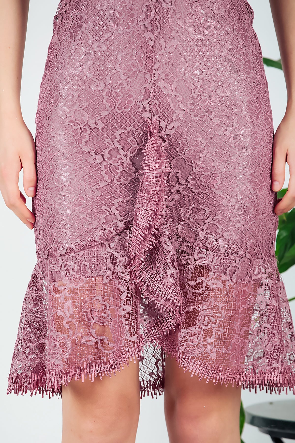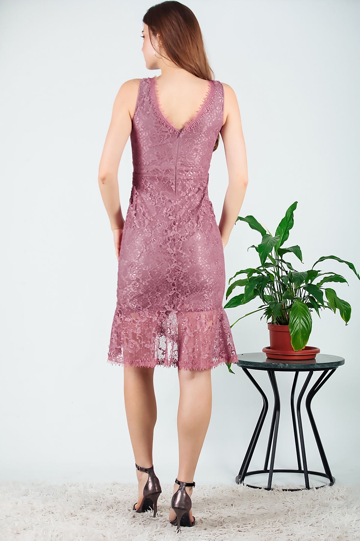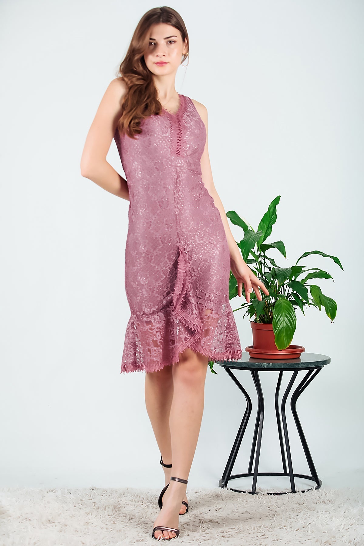 Kadın Dantelli Midi Boy abiye Elbise Gül Kurusu