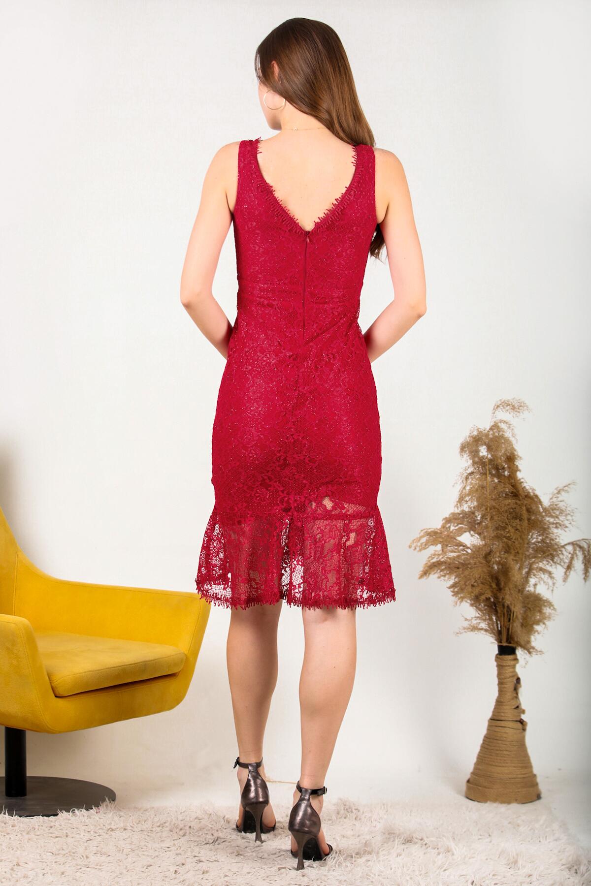 Kadın Dantelli Midi Boy Elbise Kırmızı