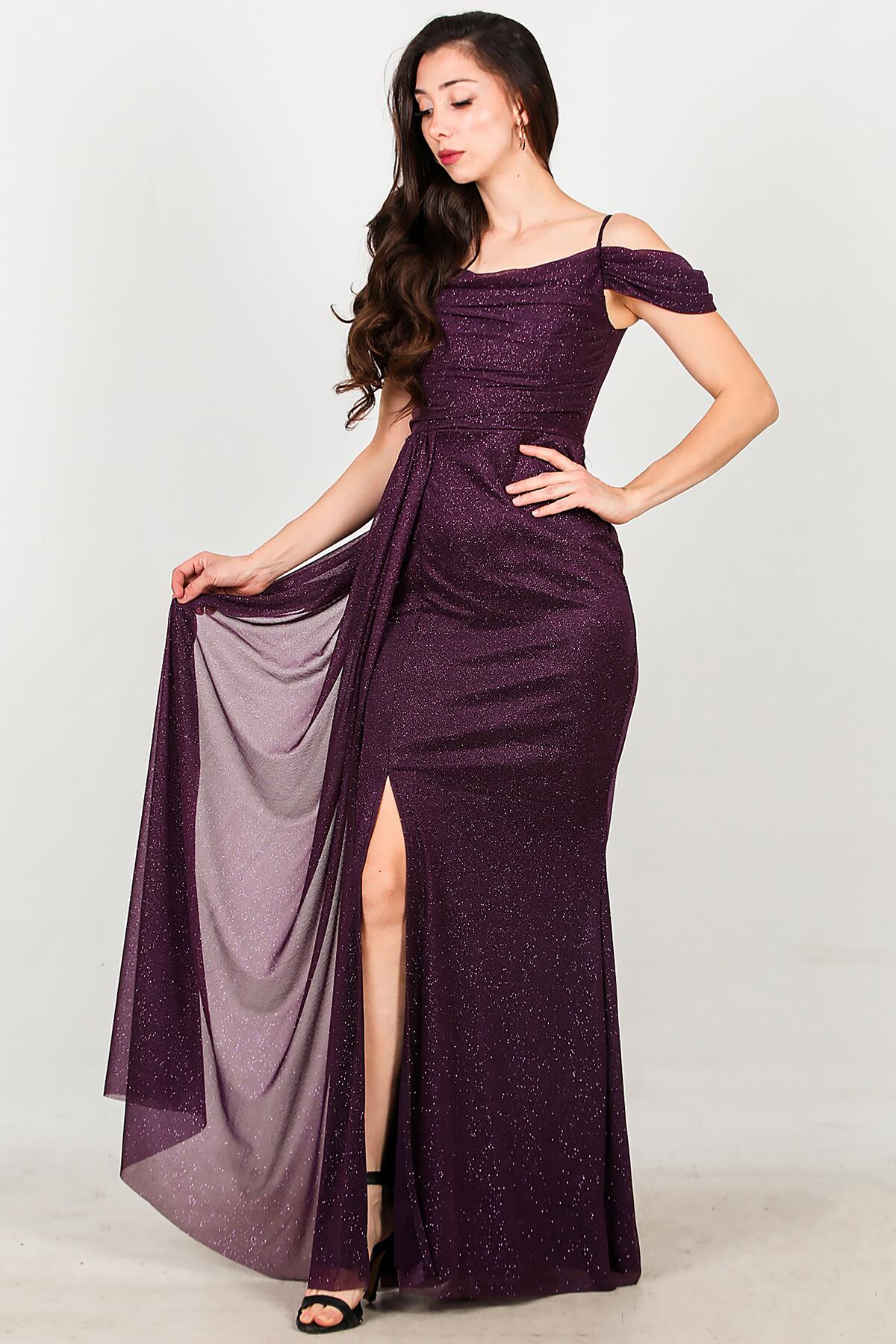 Kadın Düşük Kol Simli Uzun Abiye Mor