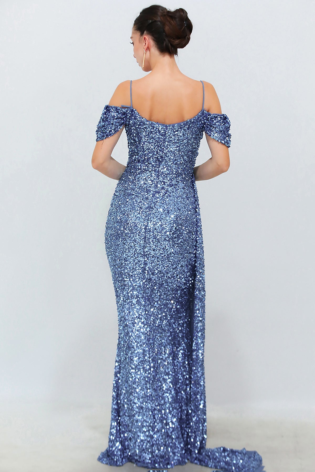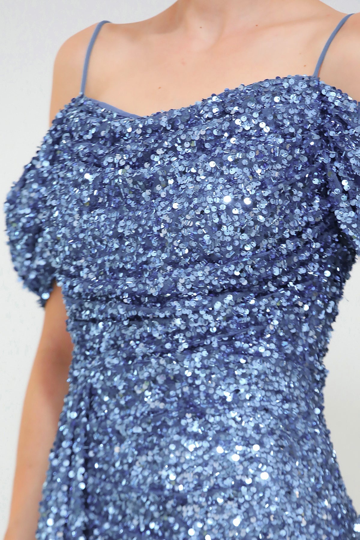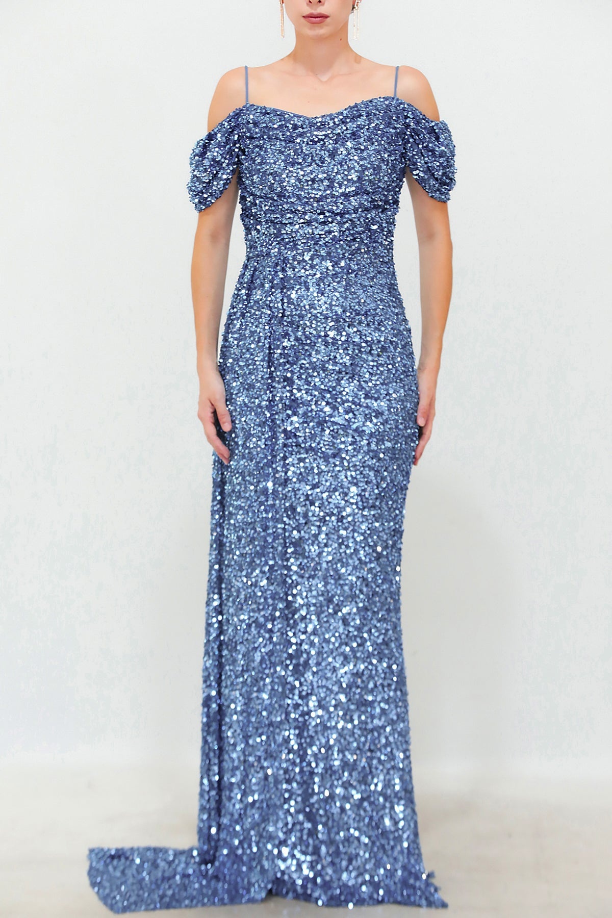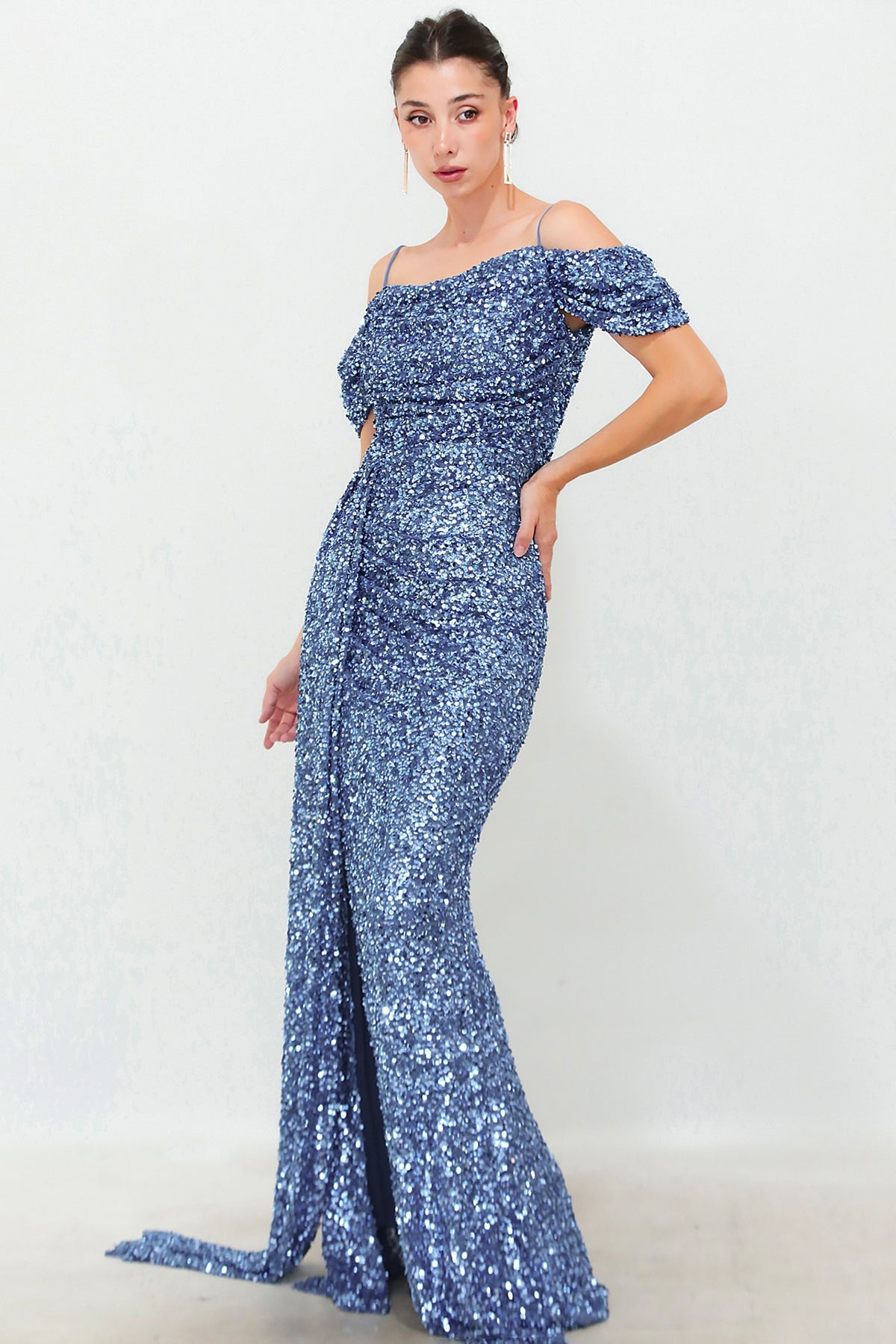 Kadın Düşük Omuz Yırtmaçlı Pullu Uzun Abiye Mavi
