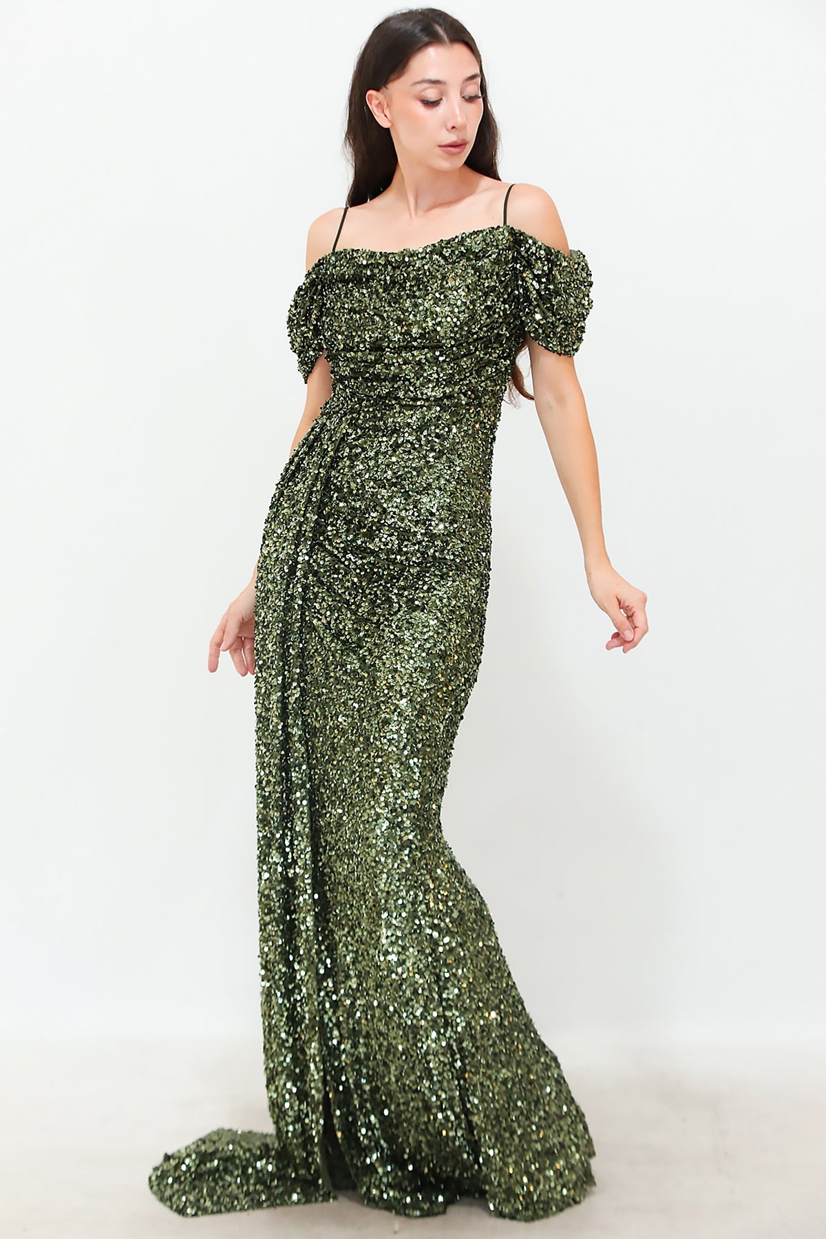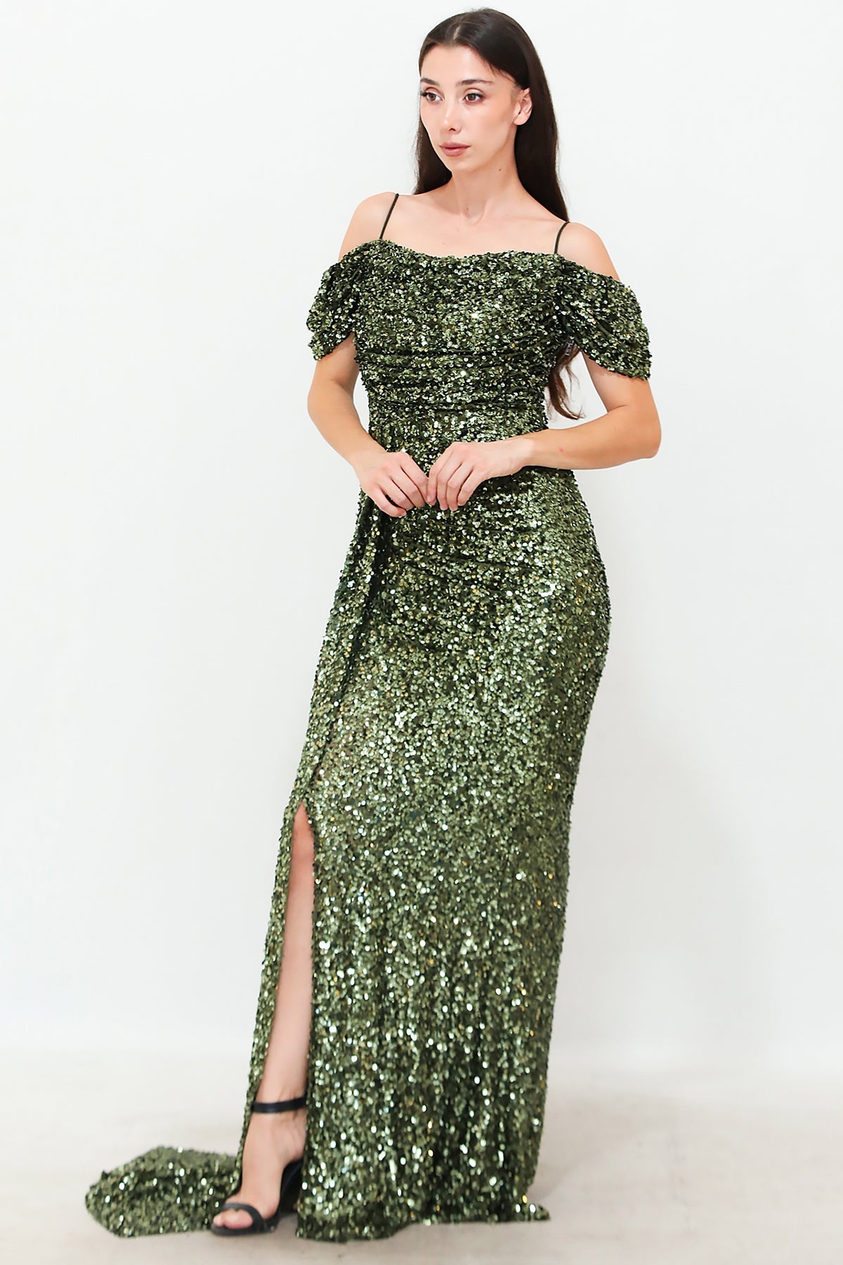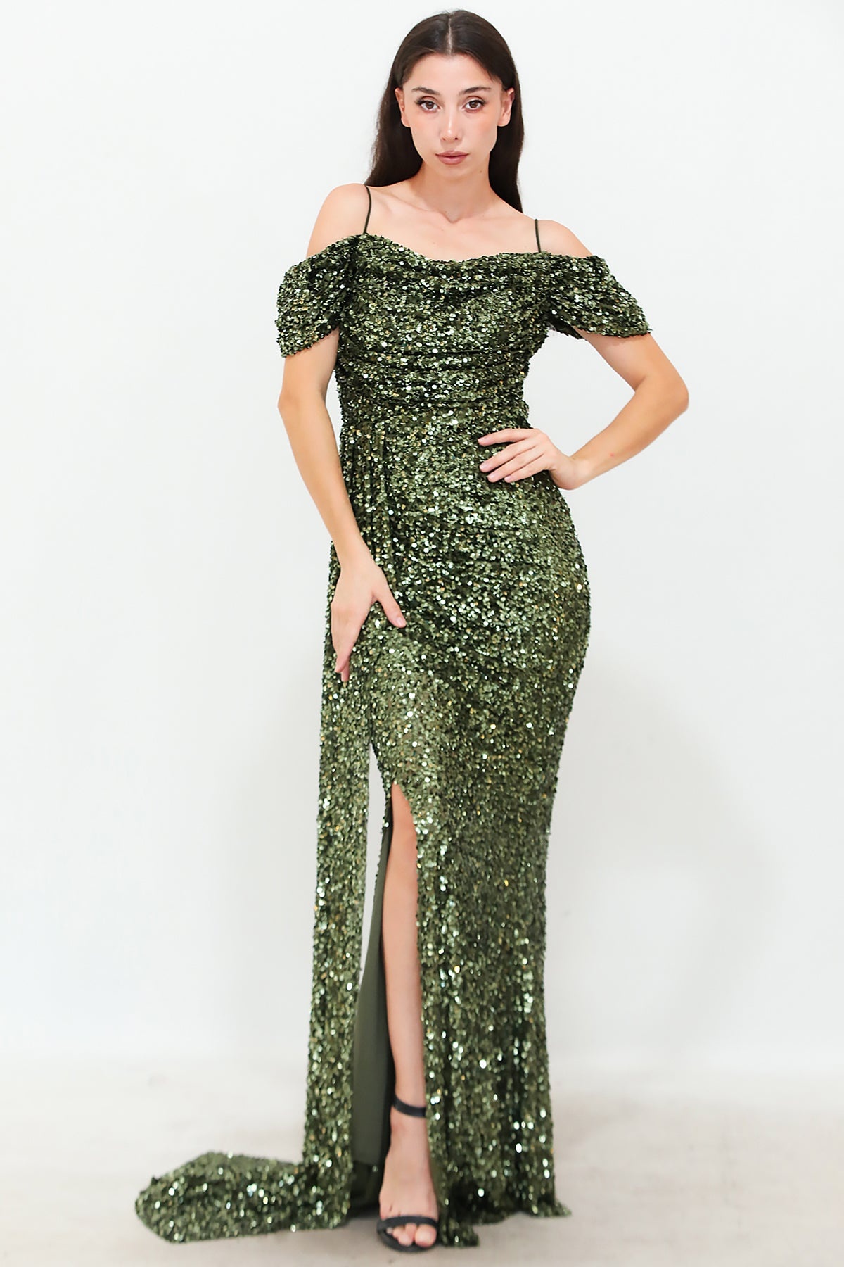 Kadın Düşük Omuz Yırtmaçlı Pullu Uzun Abiye Yeşil
