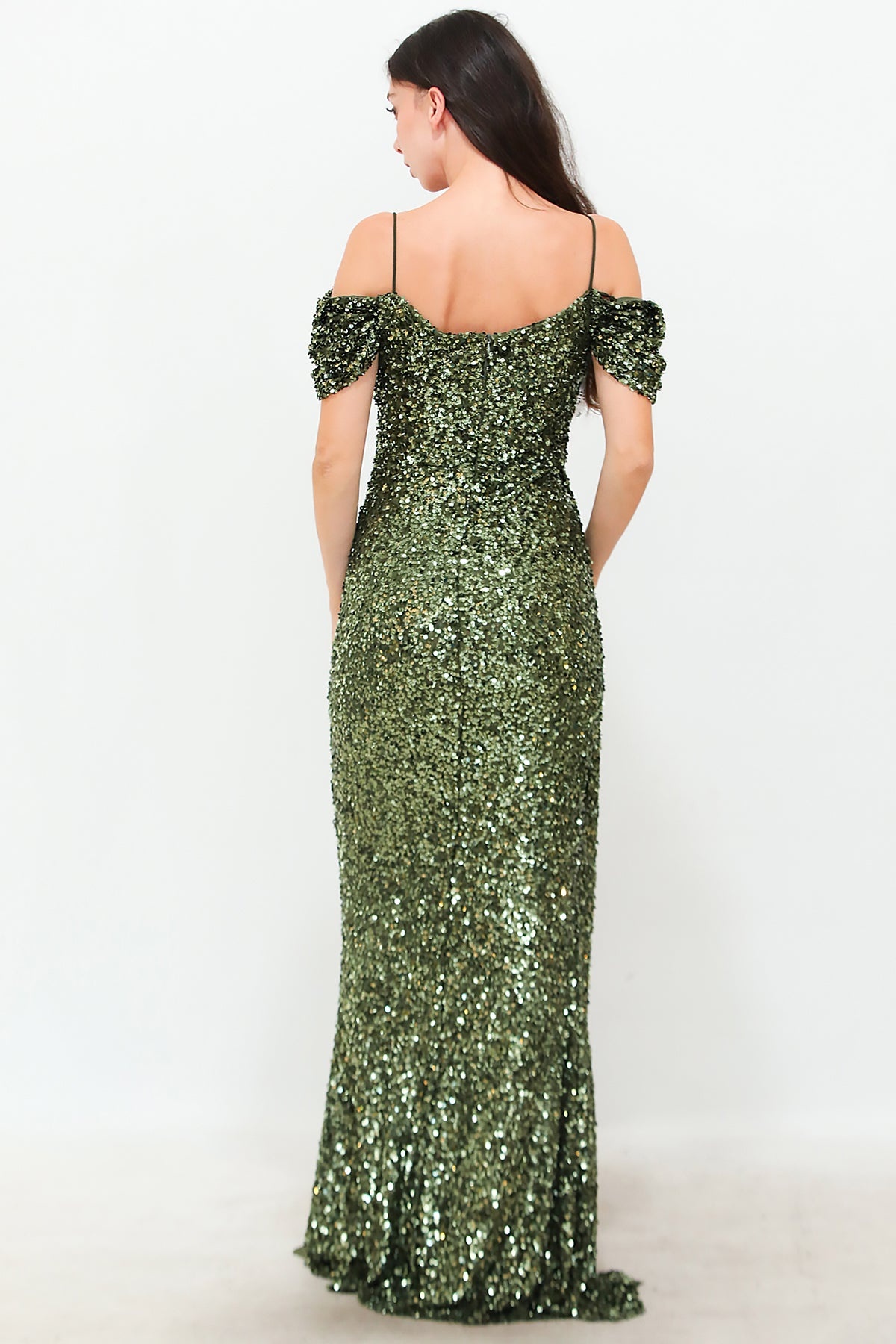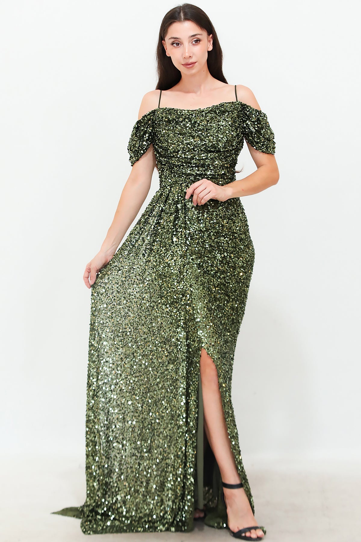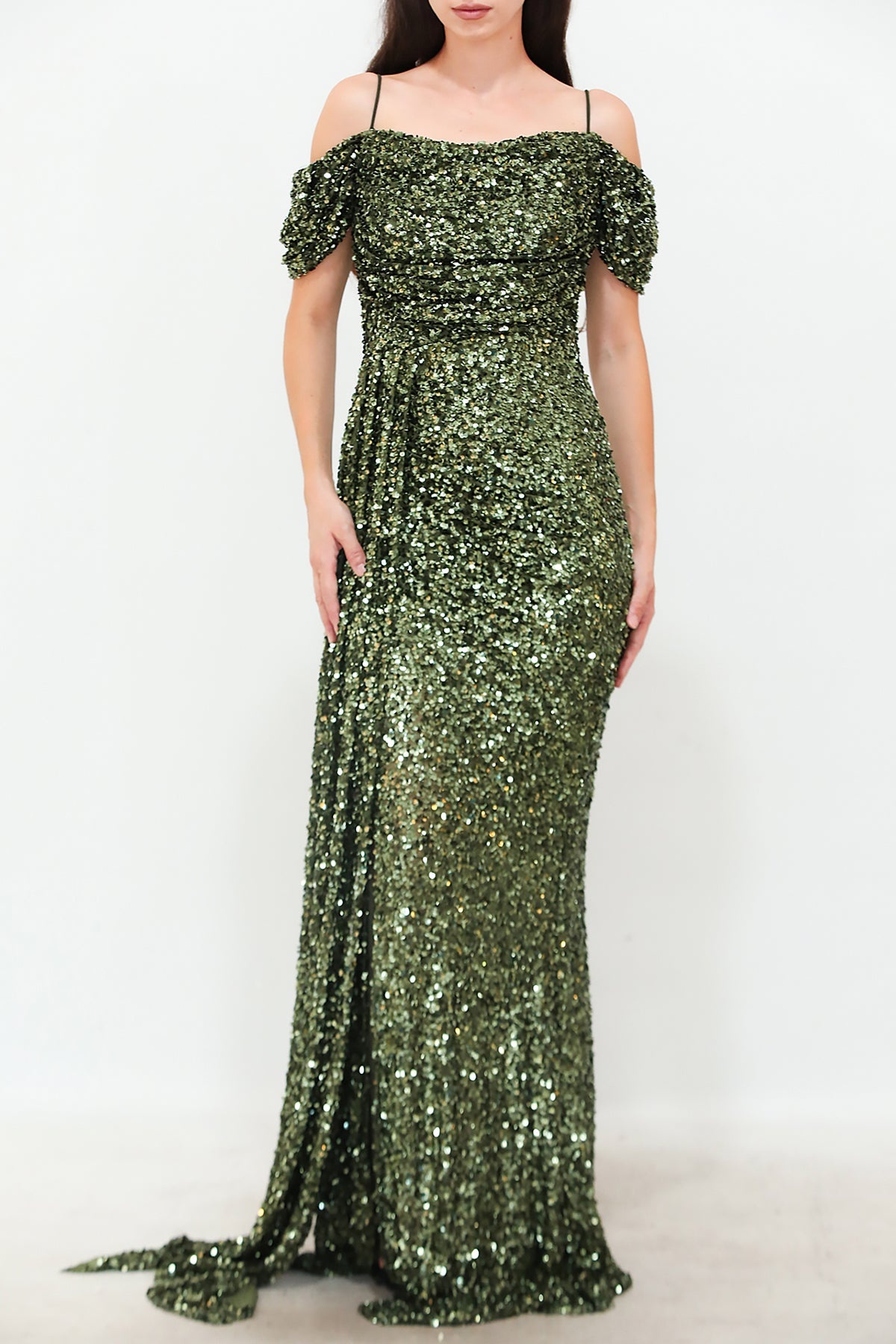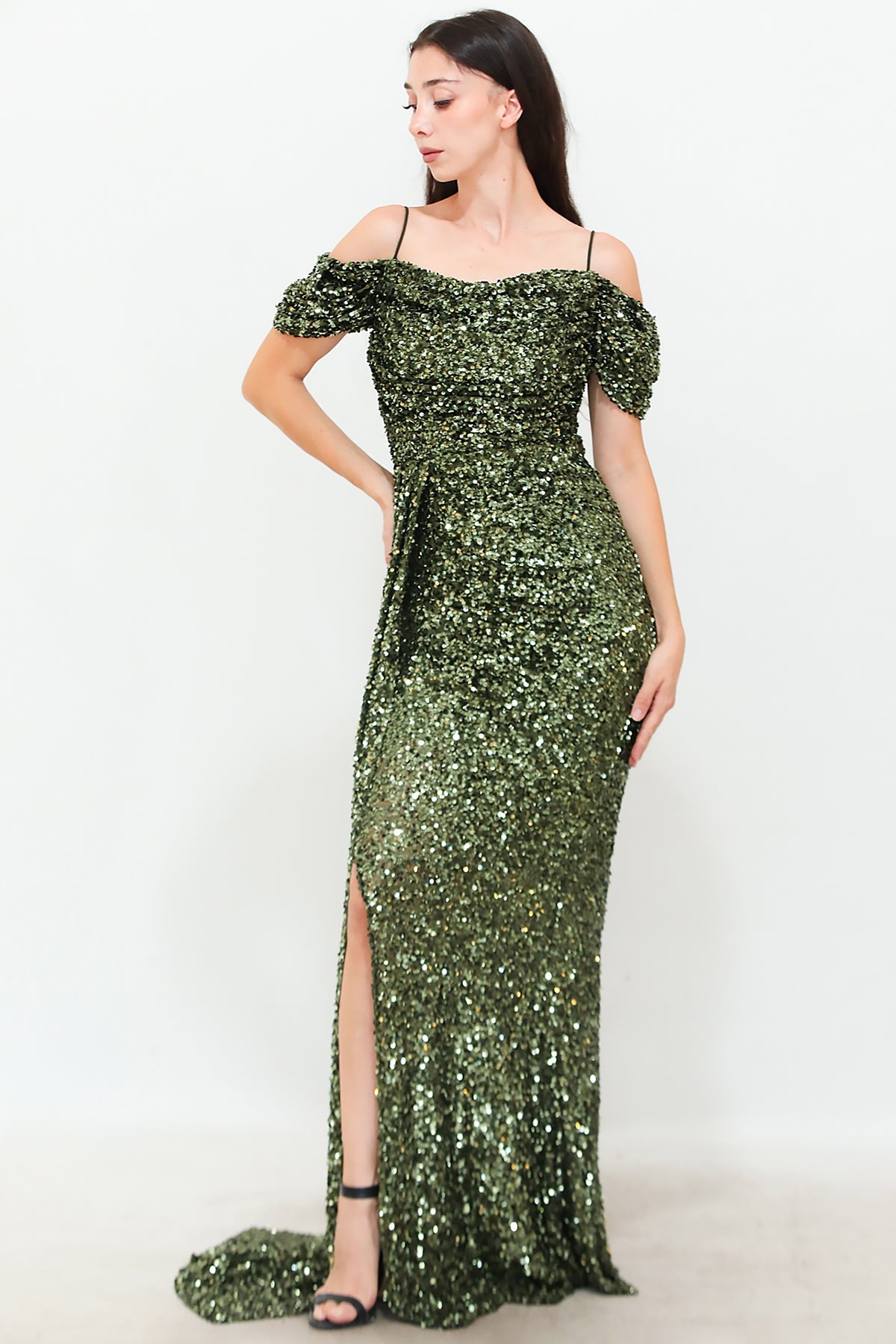 Kadın Düşük Omuz Yırtmaçlı Pullu Uzun Abiye Yeşil