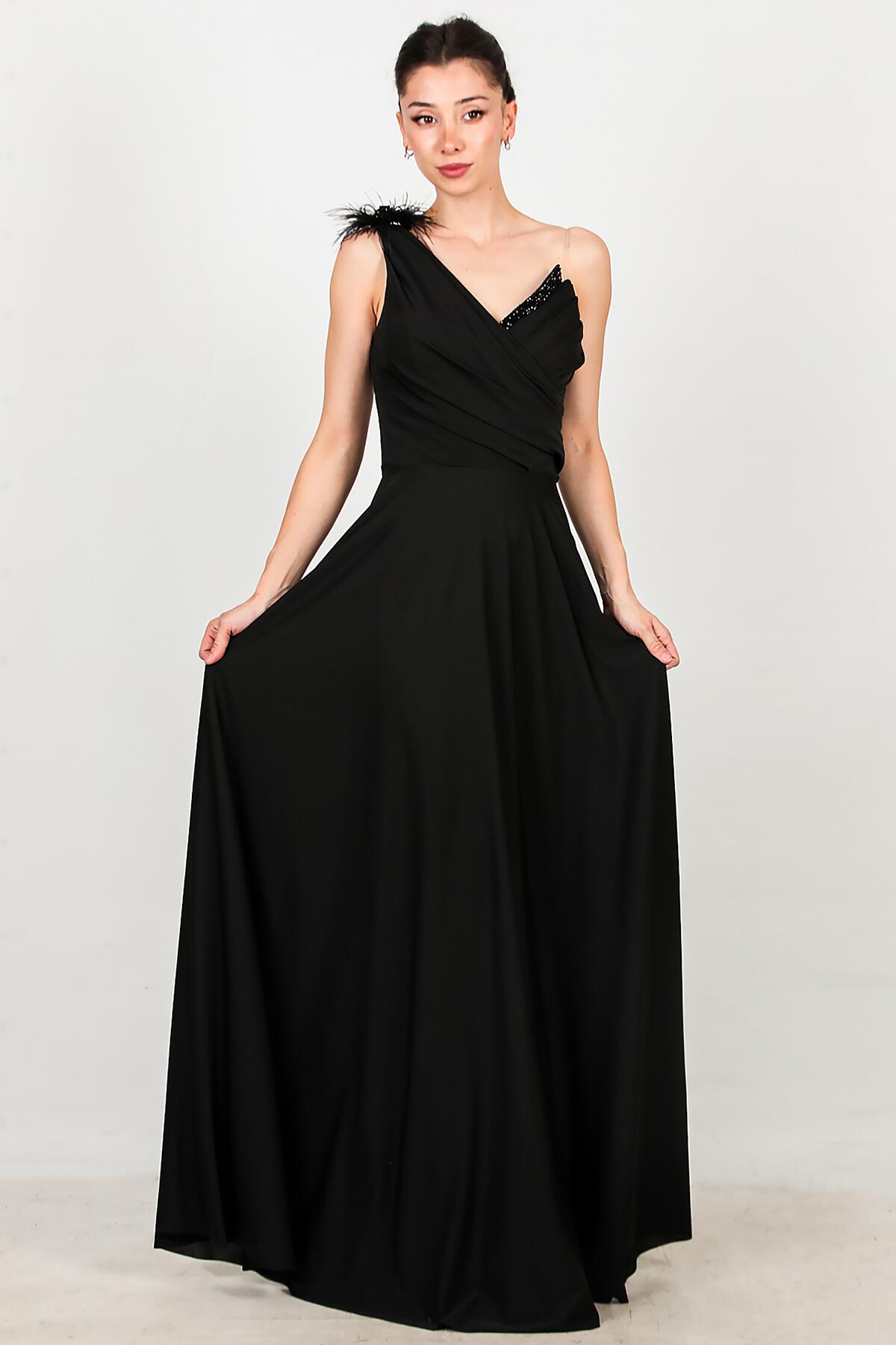 Kadın Göğsü Taşlı Omuz Broşlu Uzun Abiye Siyah