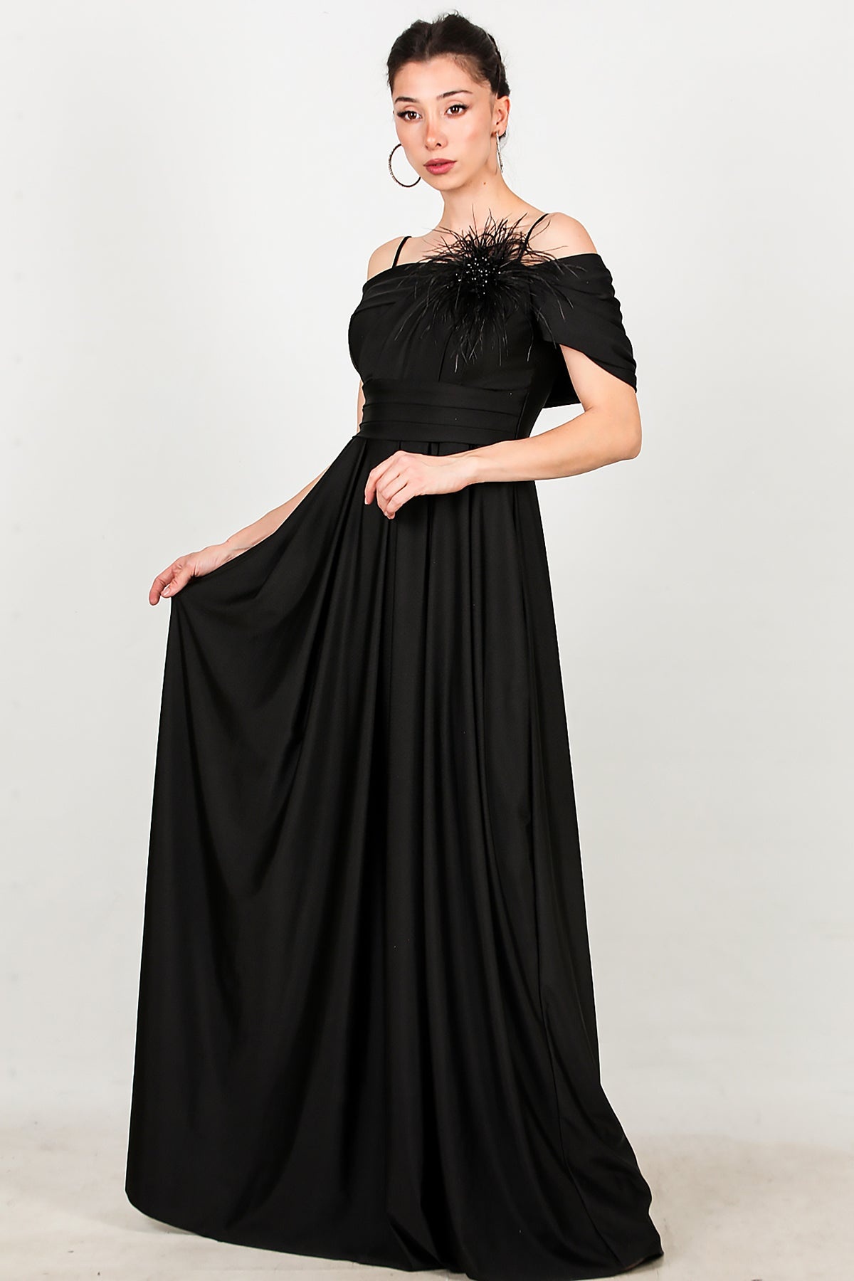 Kadın Göğsü Tül Detay Düşük Omuz Abiye Siyah