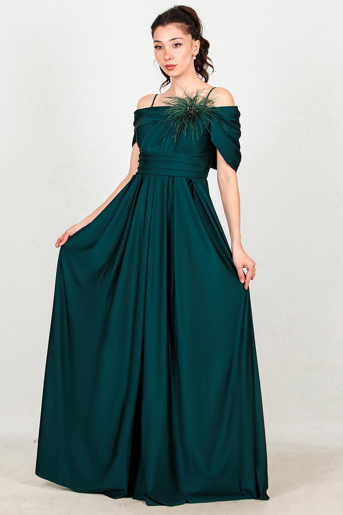 Kadın Göğsü Tül Detay Düşük Omuz Abiye Zümrüt