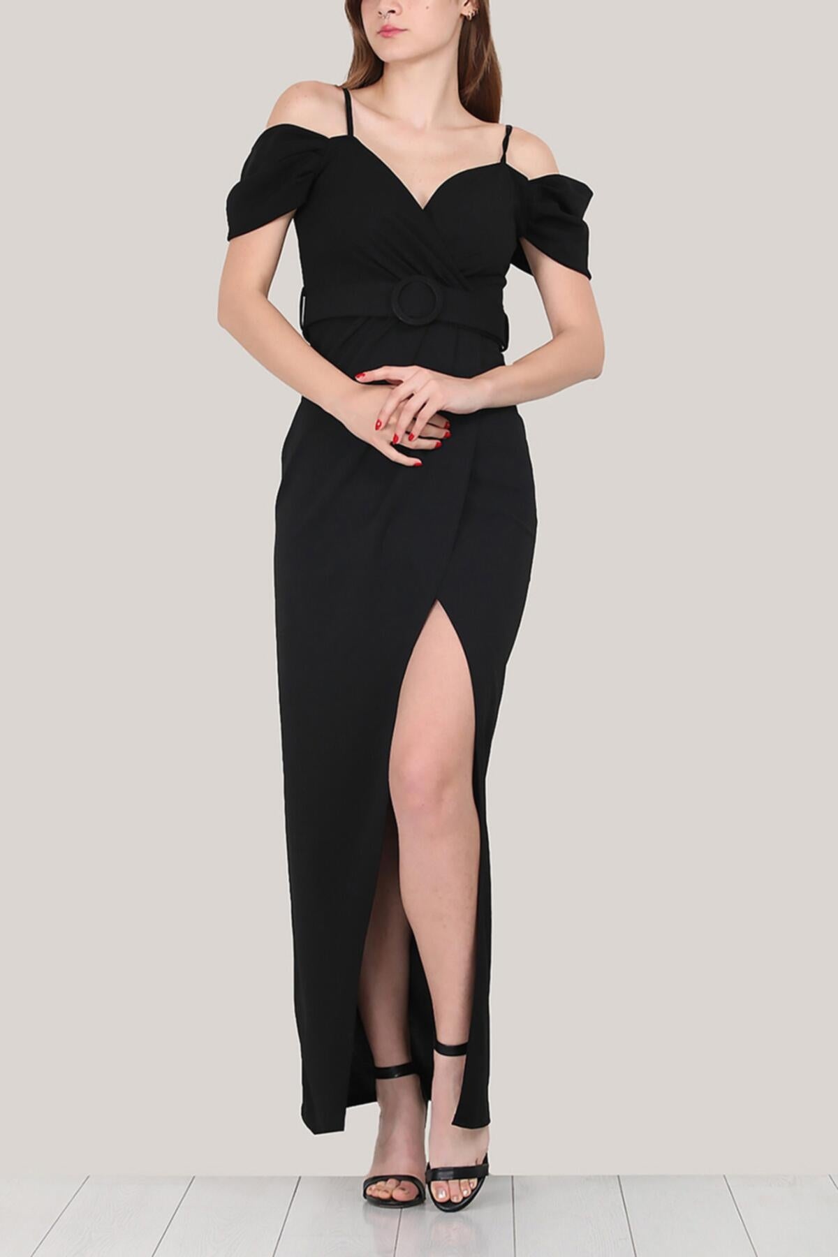 Kadın İp Askılı Bel Kemerli Yırtmaç Detay Uzun Abiye Siyah