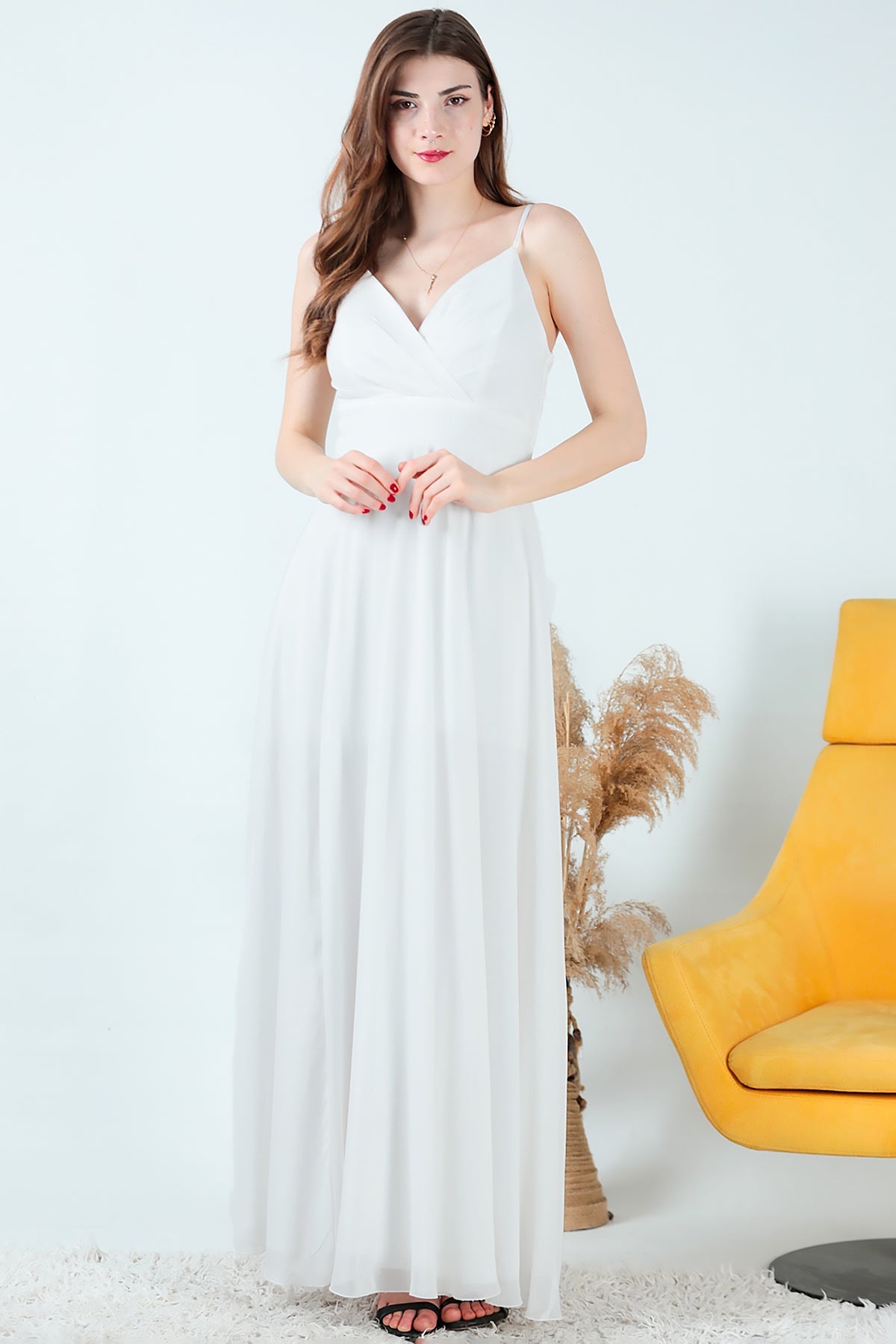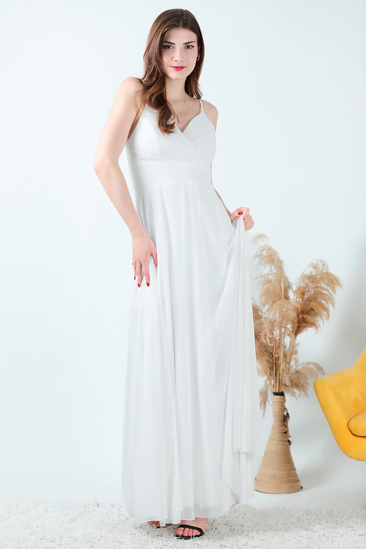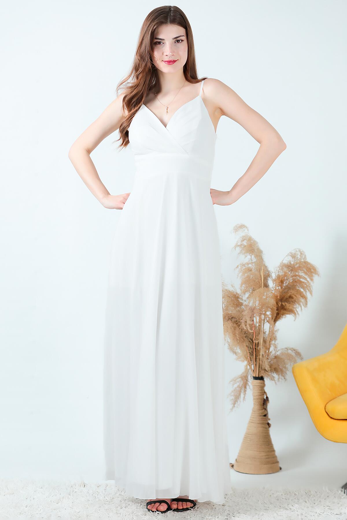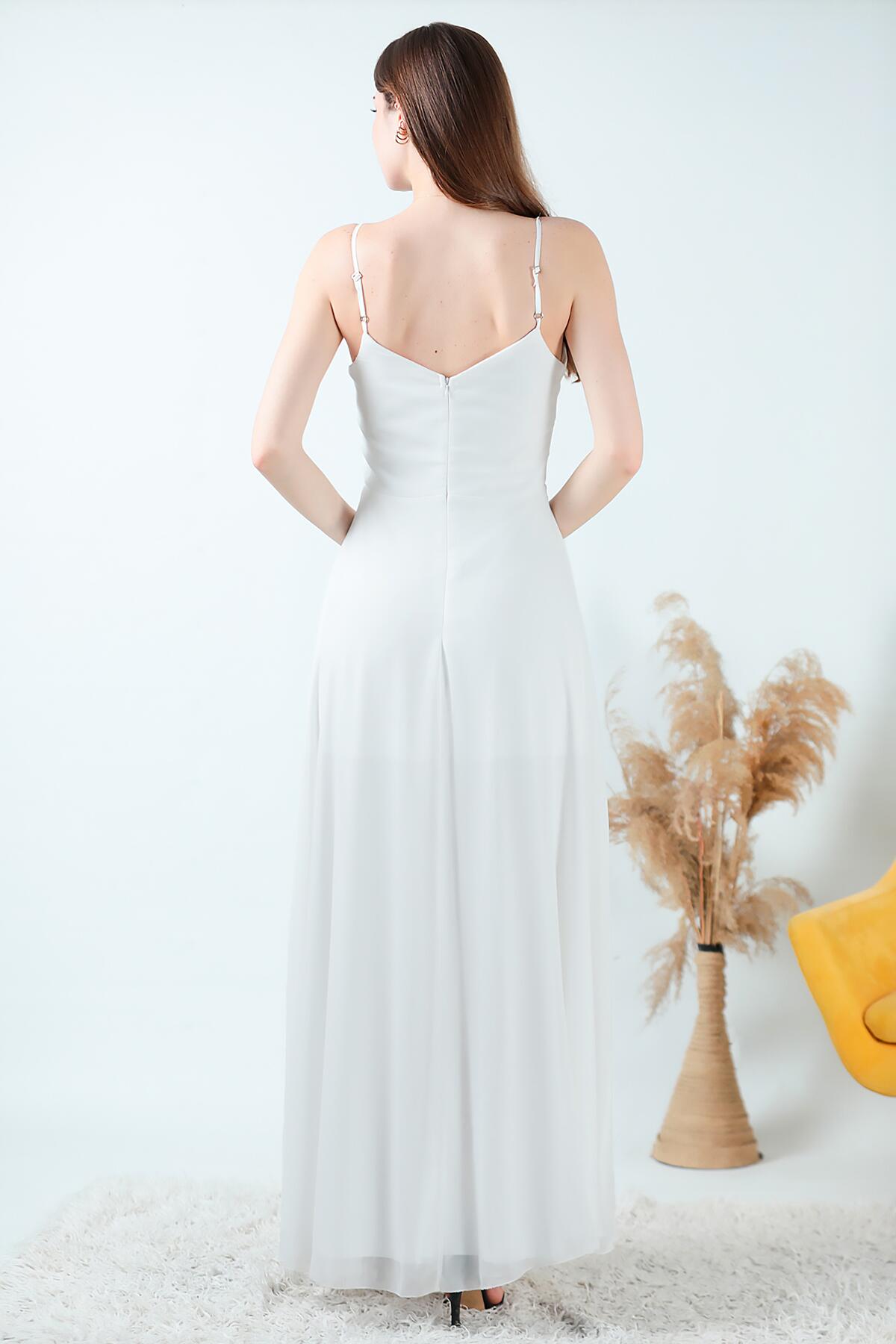 Kadın İp Askılı Şifon Uzun Abiye Ekru