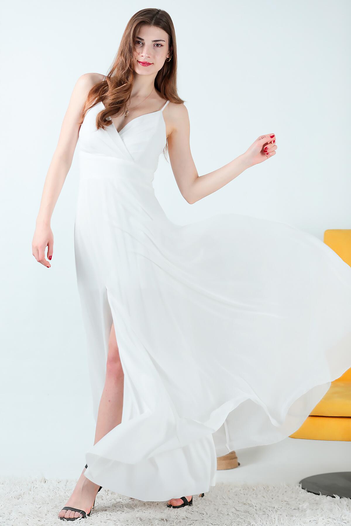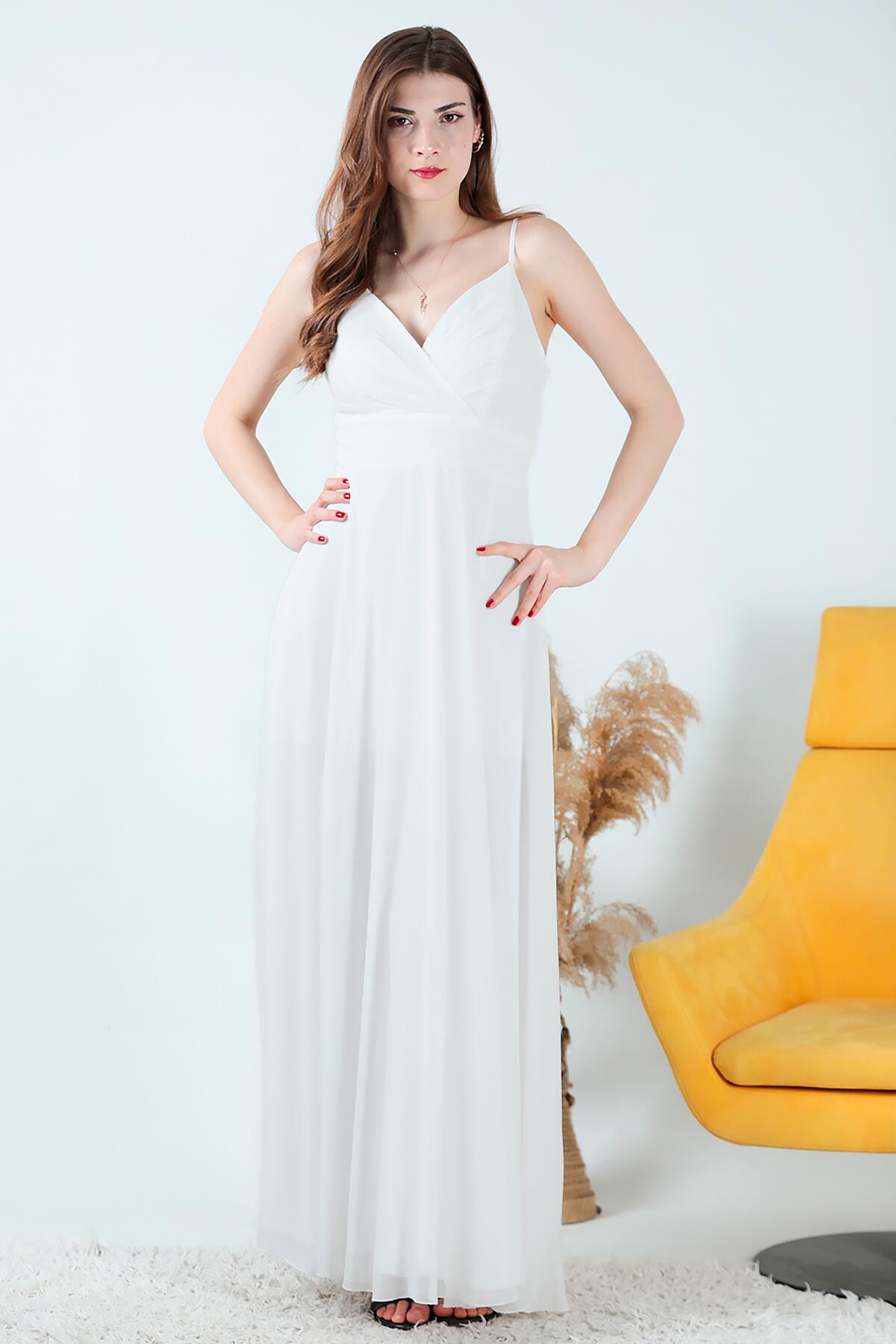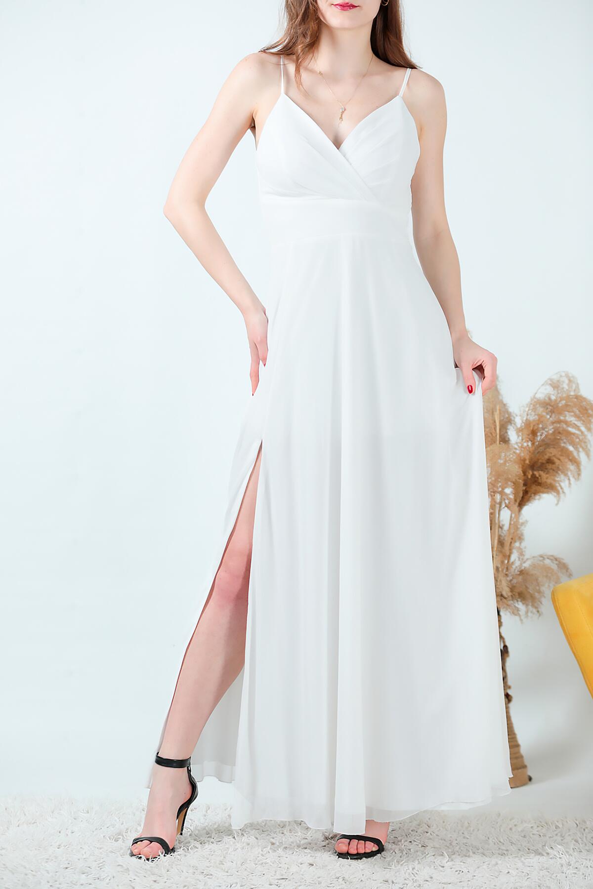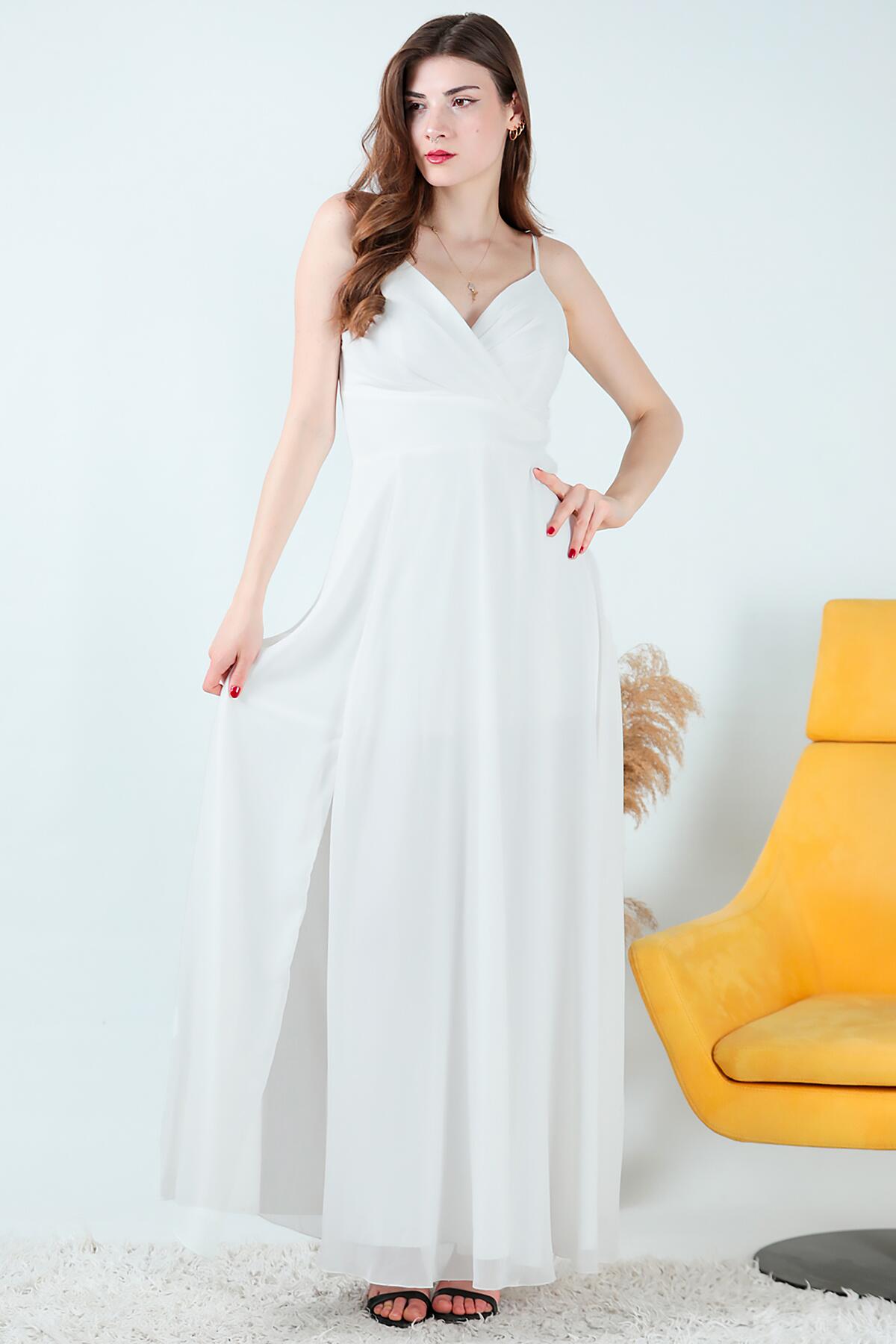 Kadın İp Askılı Şifon Uzun Abiye Ekru