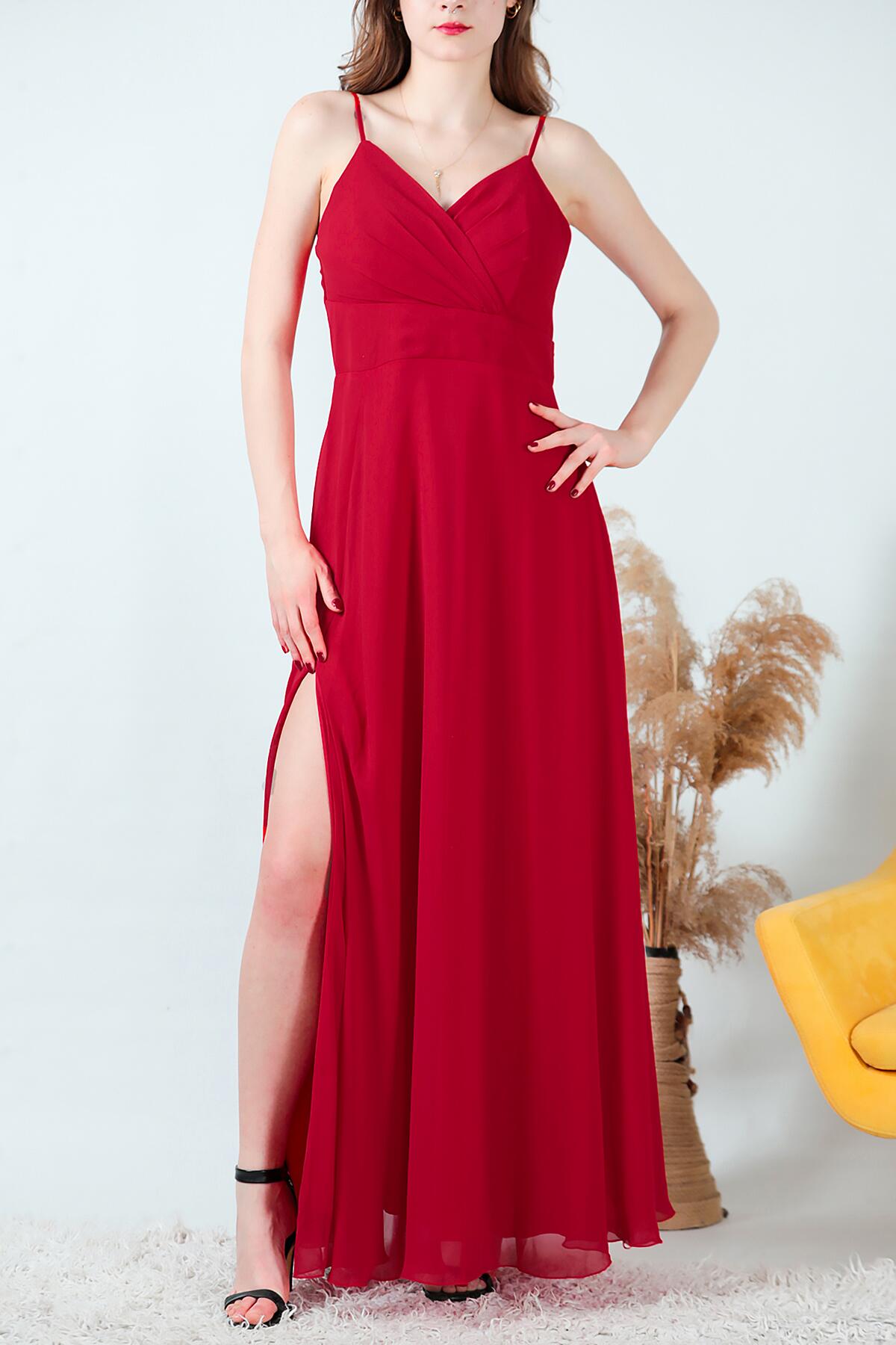 Kadın İp Askılı Şifon Uzun Abiye Kırmızı