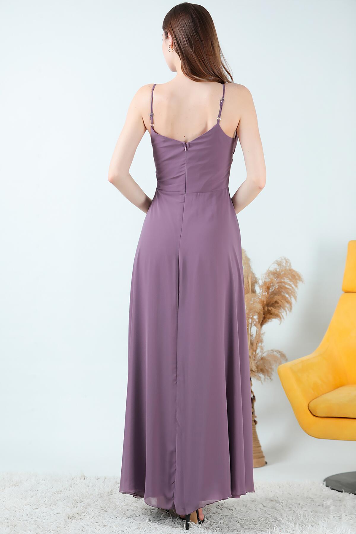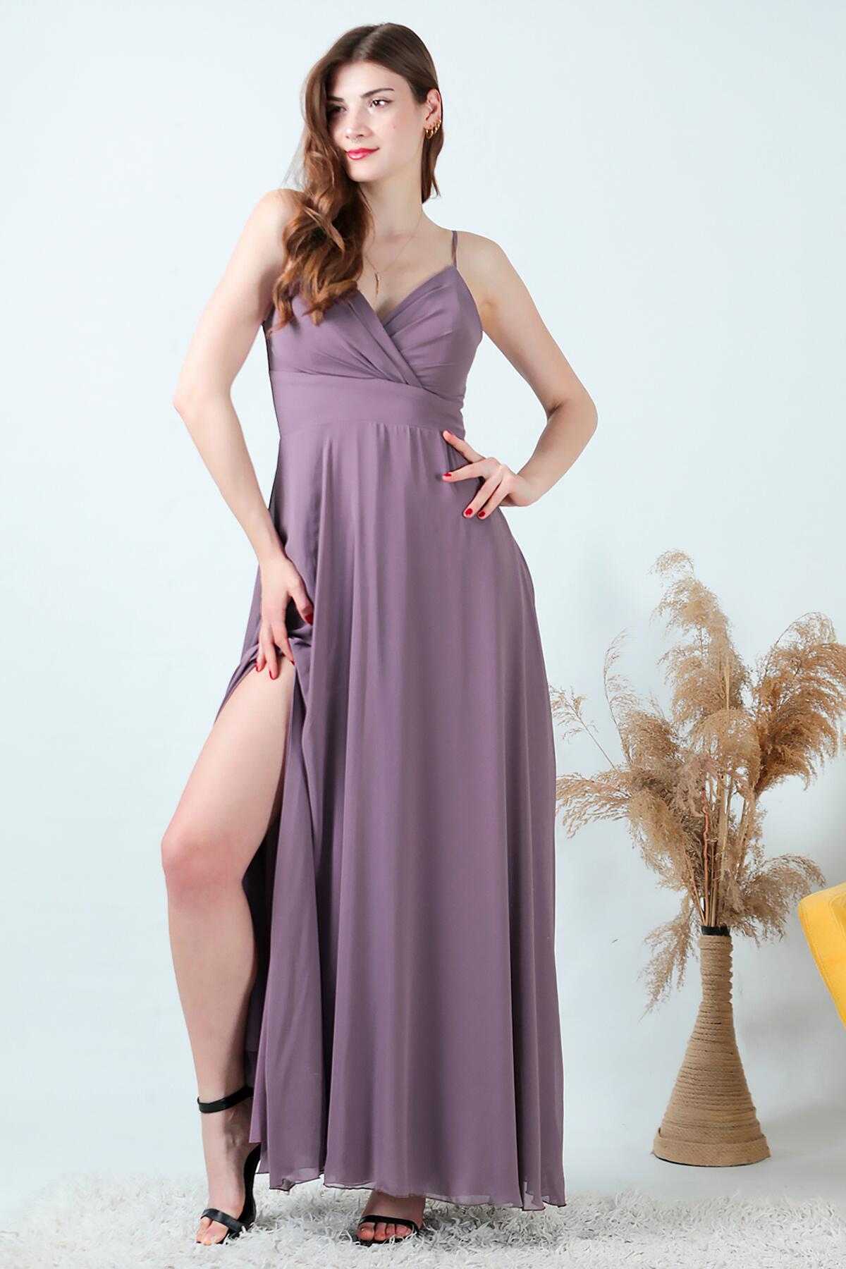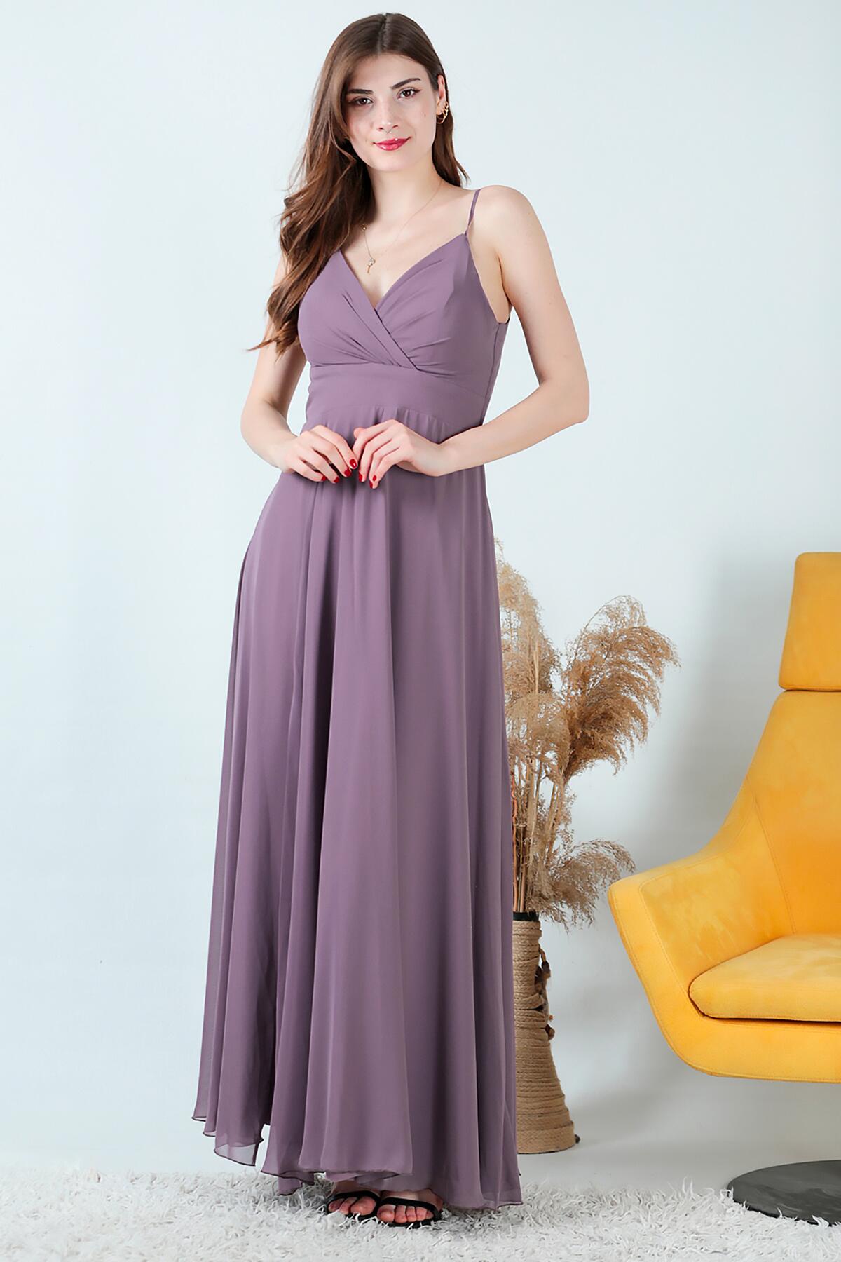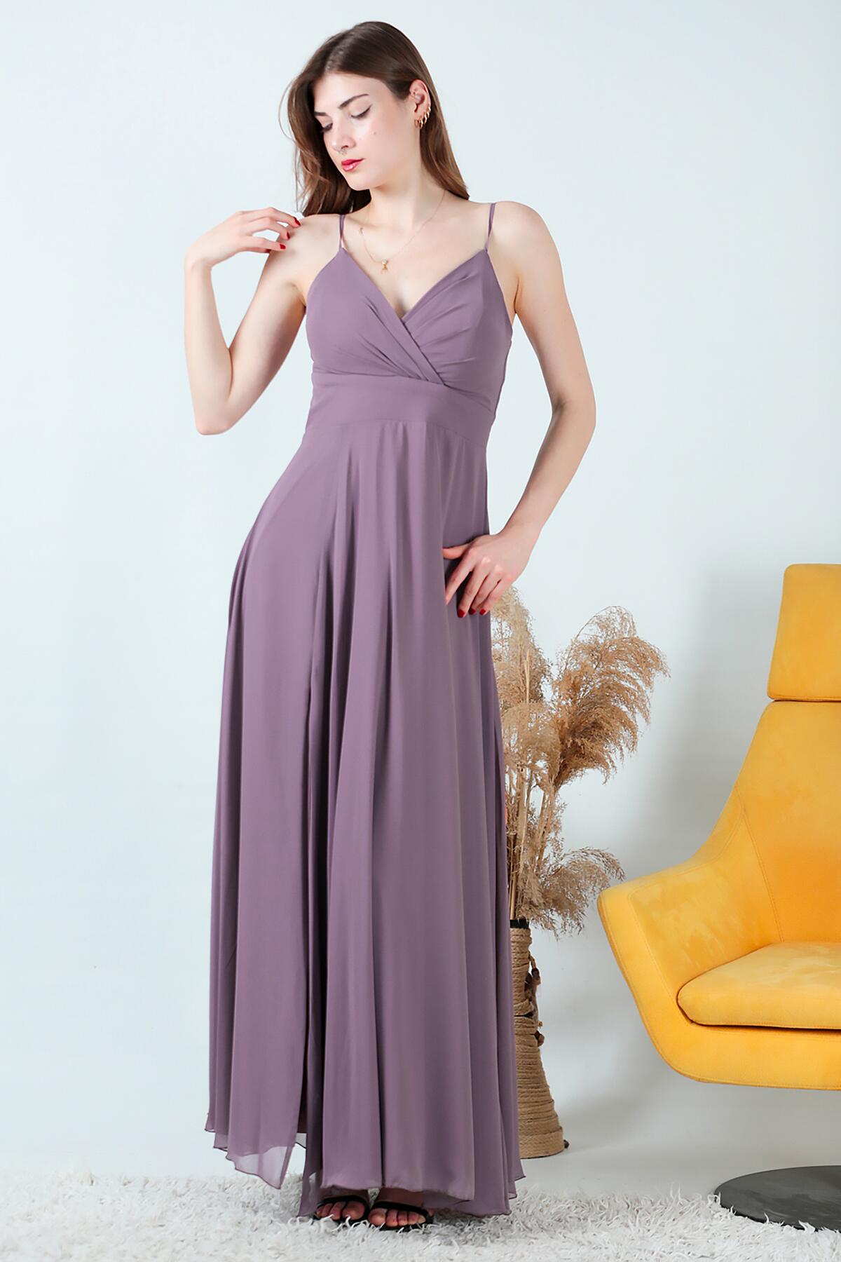 Kadın İp Askılı Şifon Uzun Abiye Mürdüm
