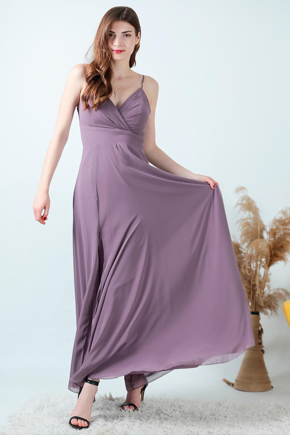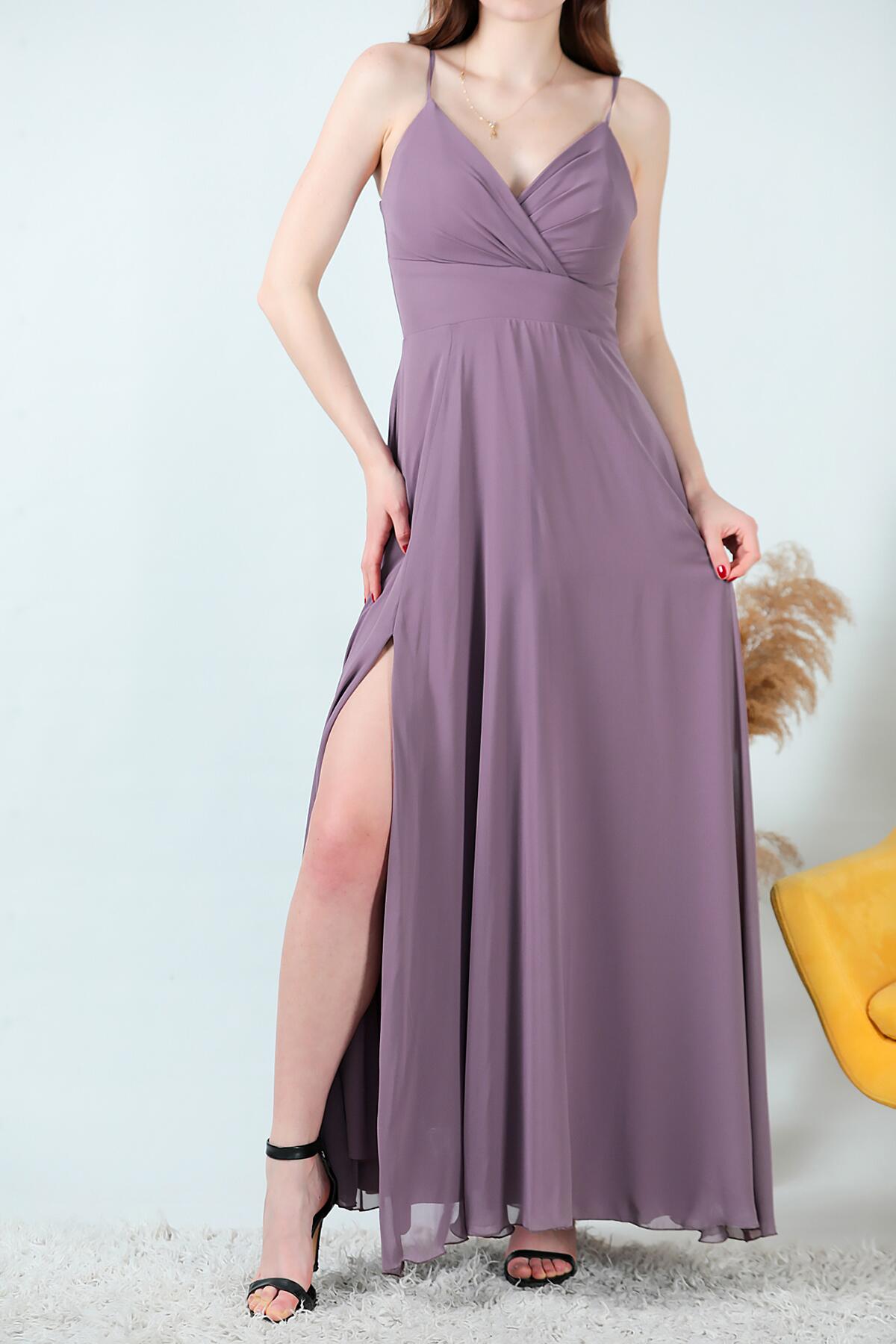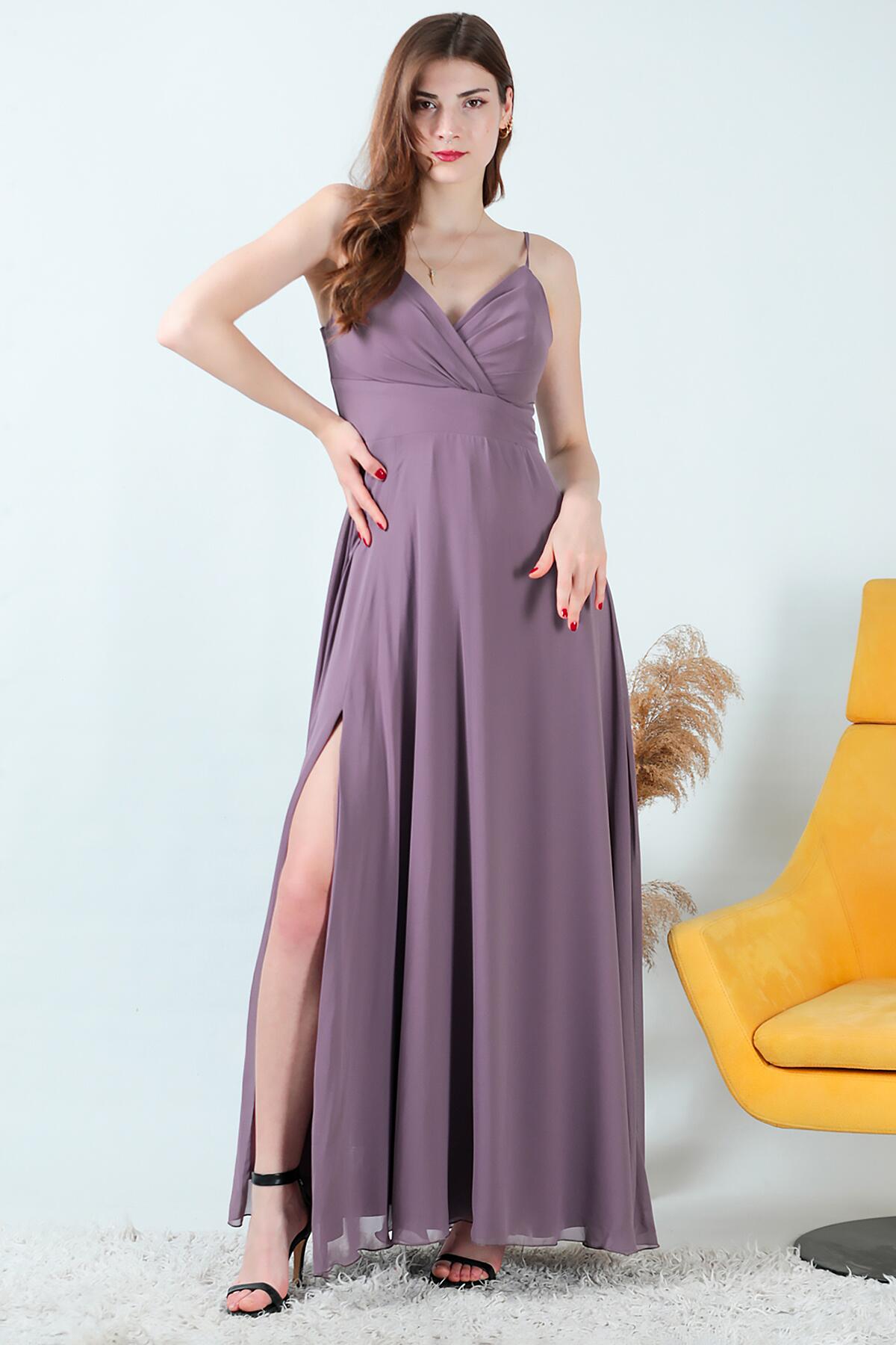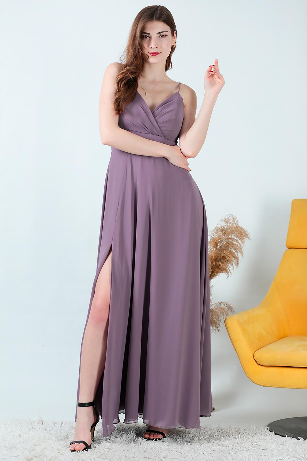 Kadın İp Askılı Şifon Uzun Abiye Mürdüm