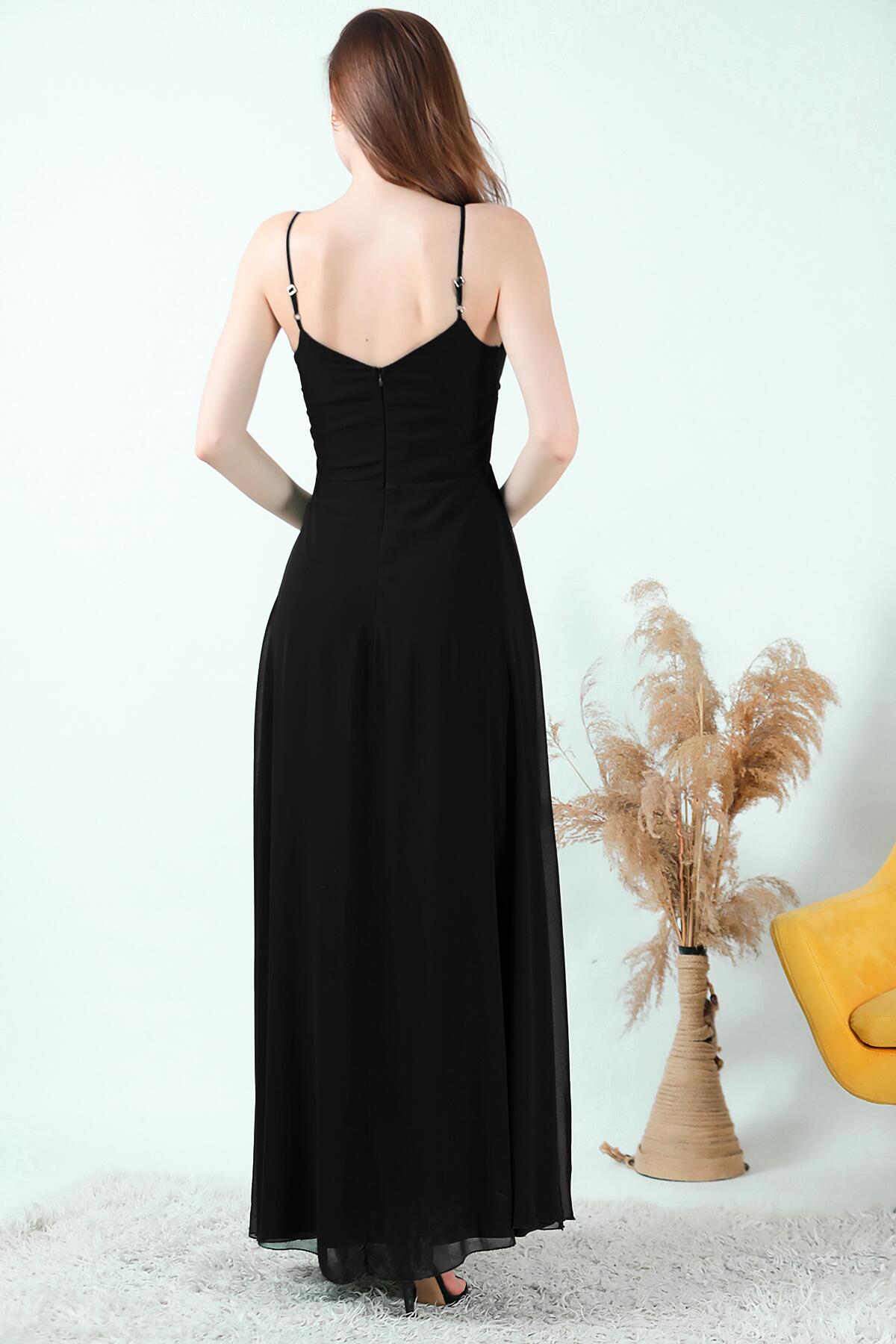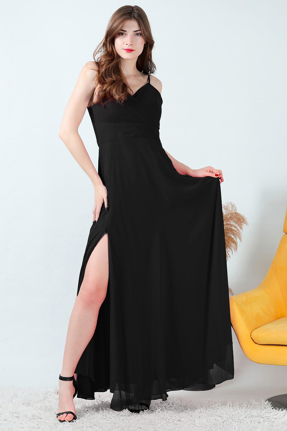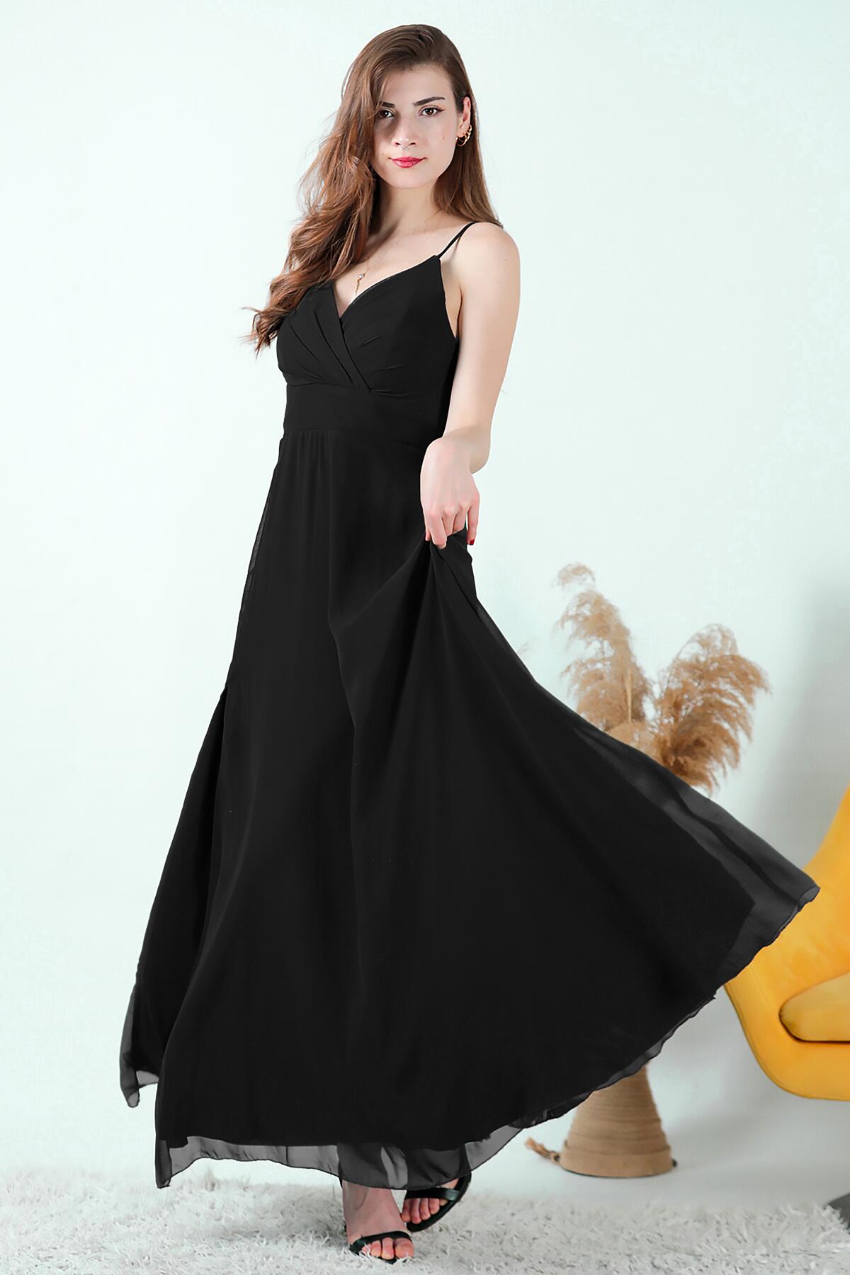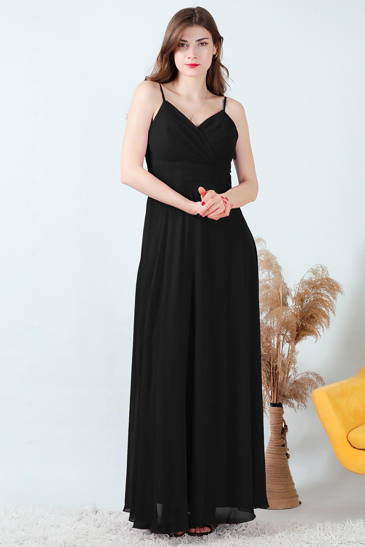 Kadın İp Askılı Şifon Uzun Abiye Siyah
