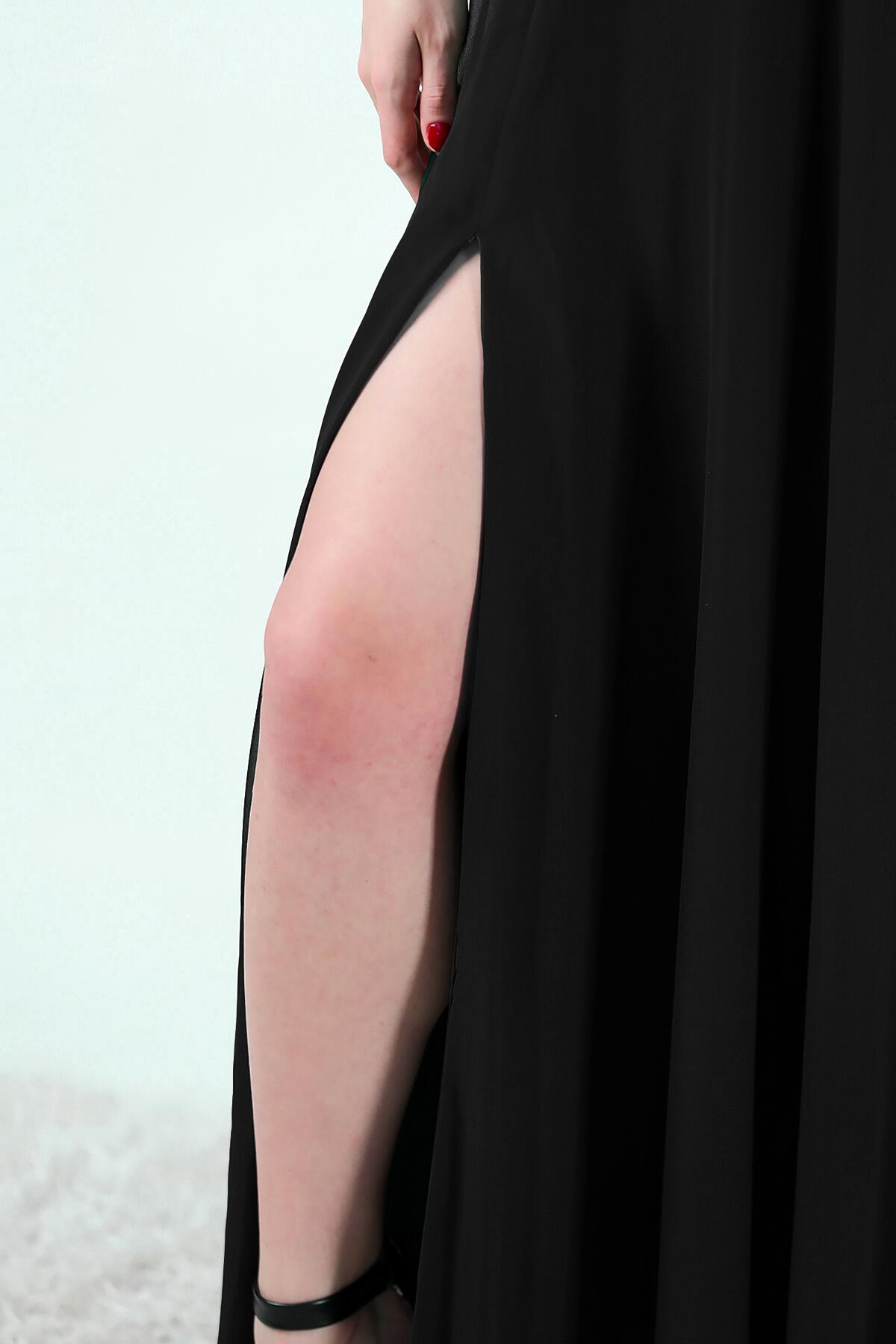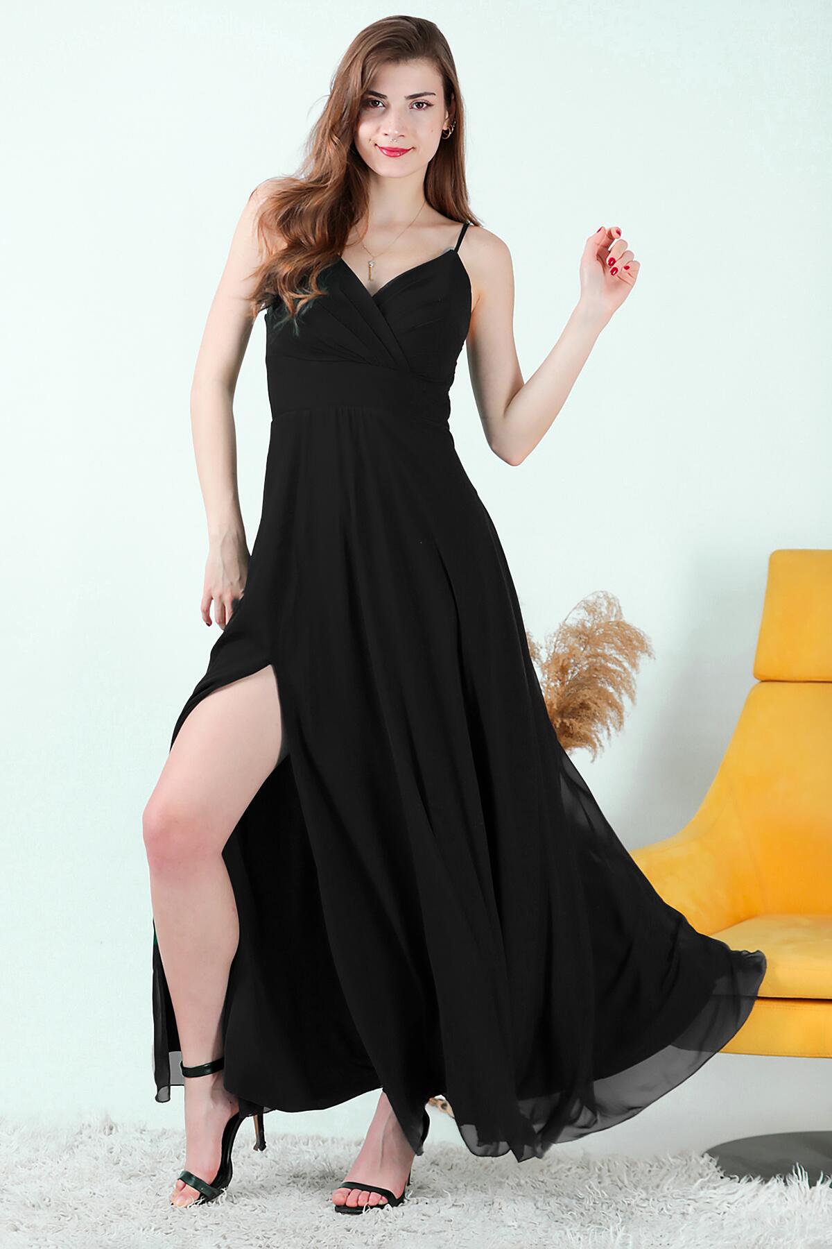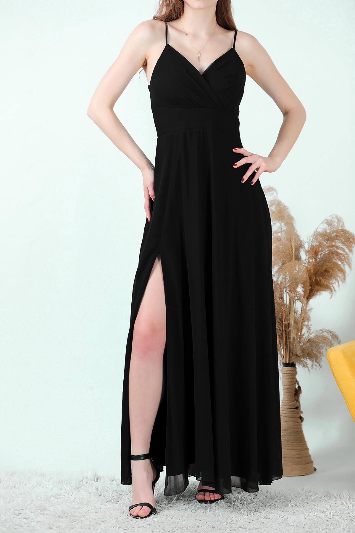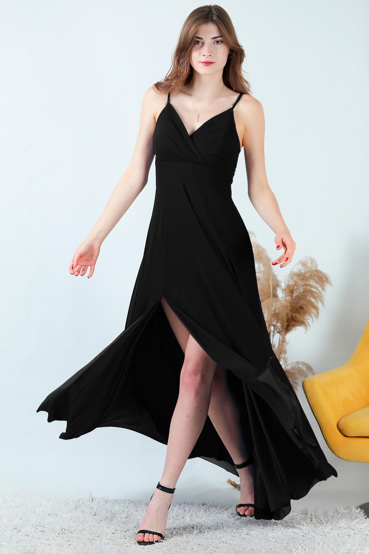 Kadın İp Askılı Şifon Uzun Abiye Siyah