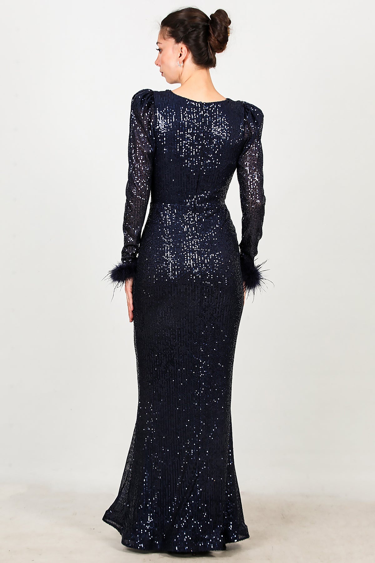 Kadın Kol Ucu Tüylü Uzun Pullu Abiye Lacivert