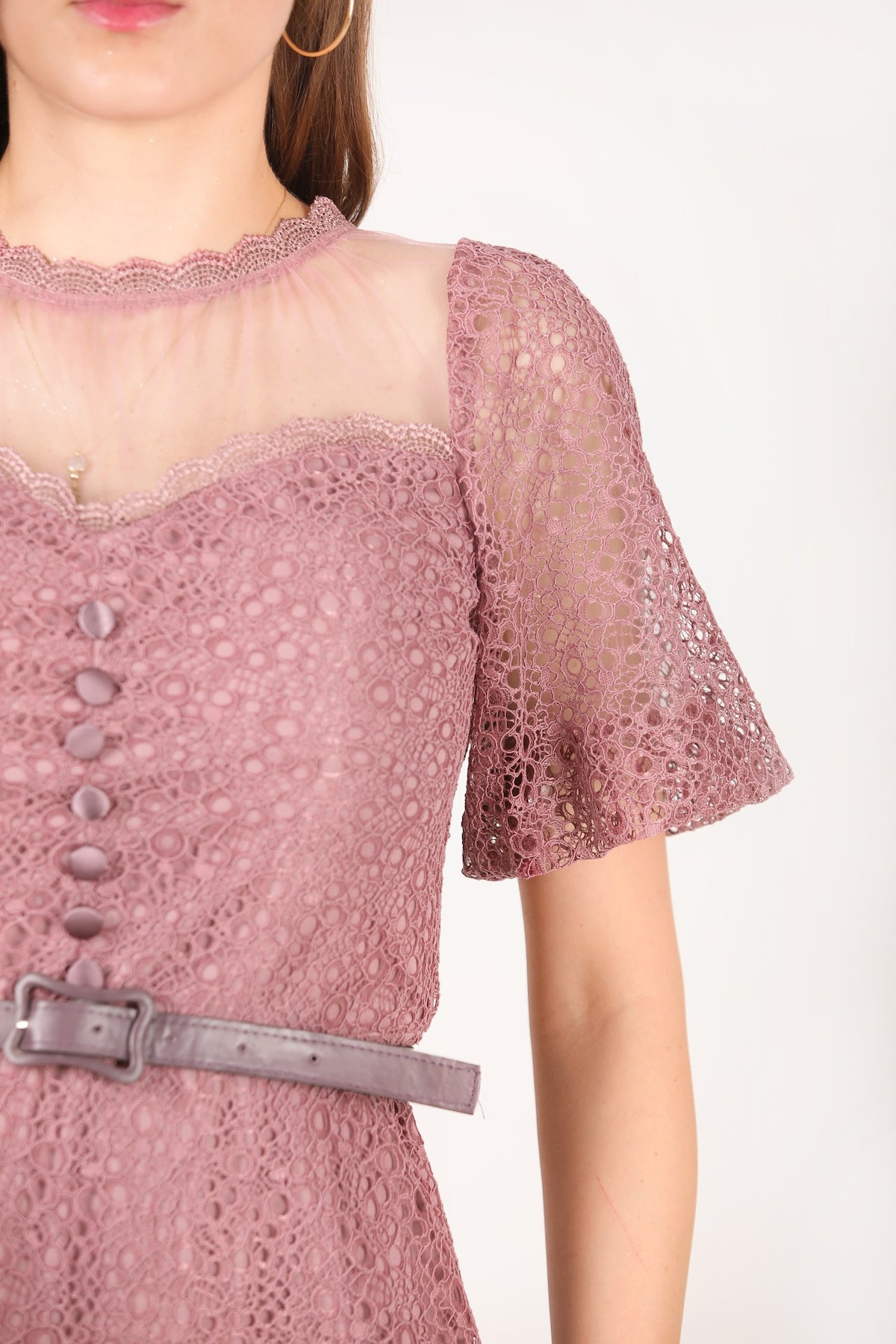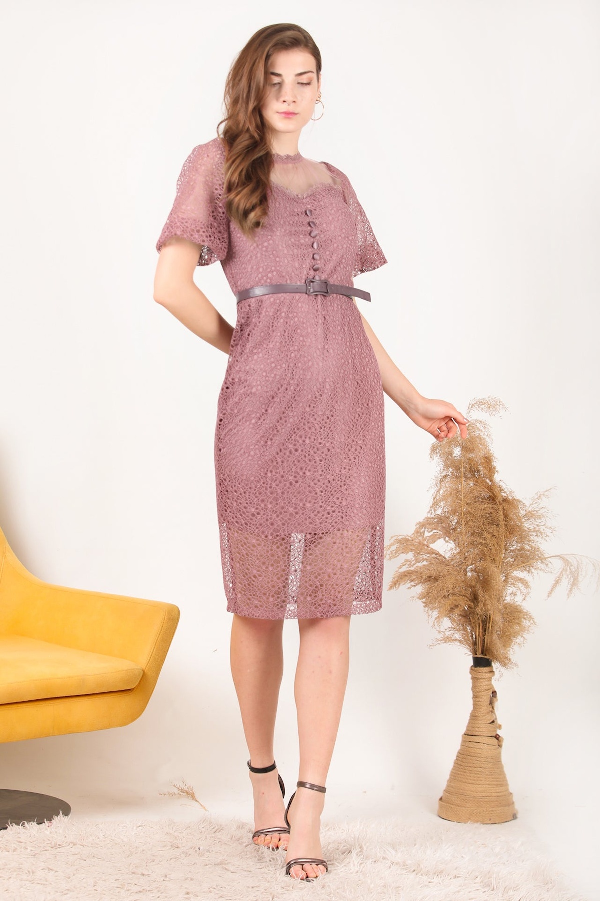 Kadın Midi Boy Kemerli Abiye Elbise Gül Kurusu